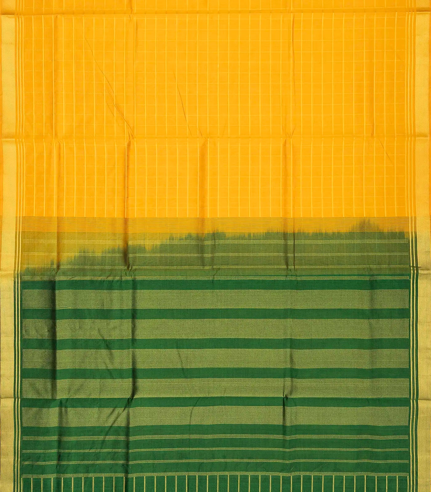 This handwoven silk cotton saree is filled with zari checks in mustard body along with zari border and contrast pallu