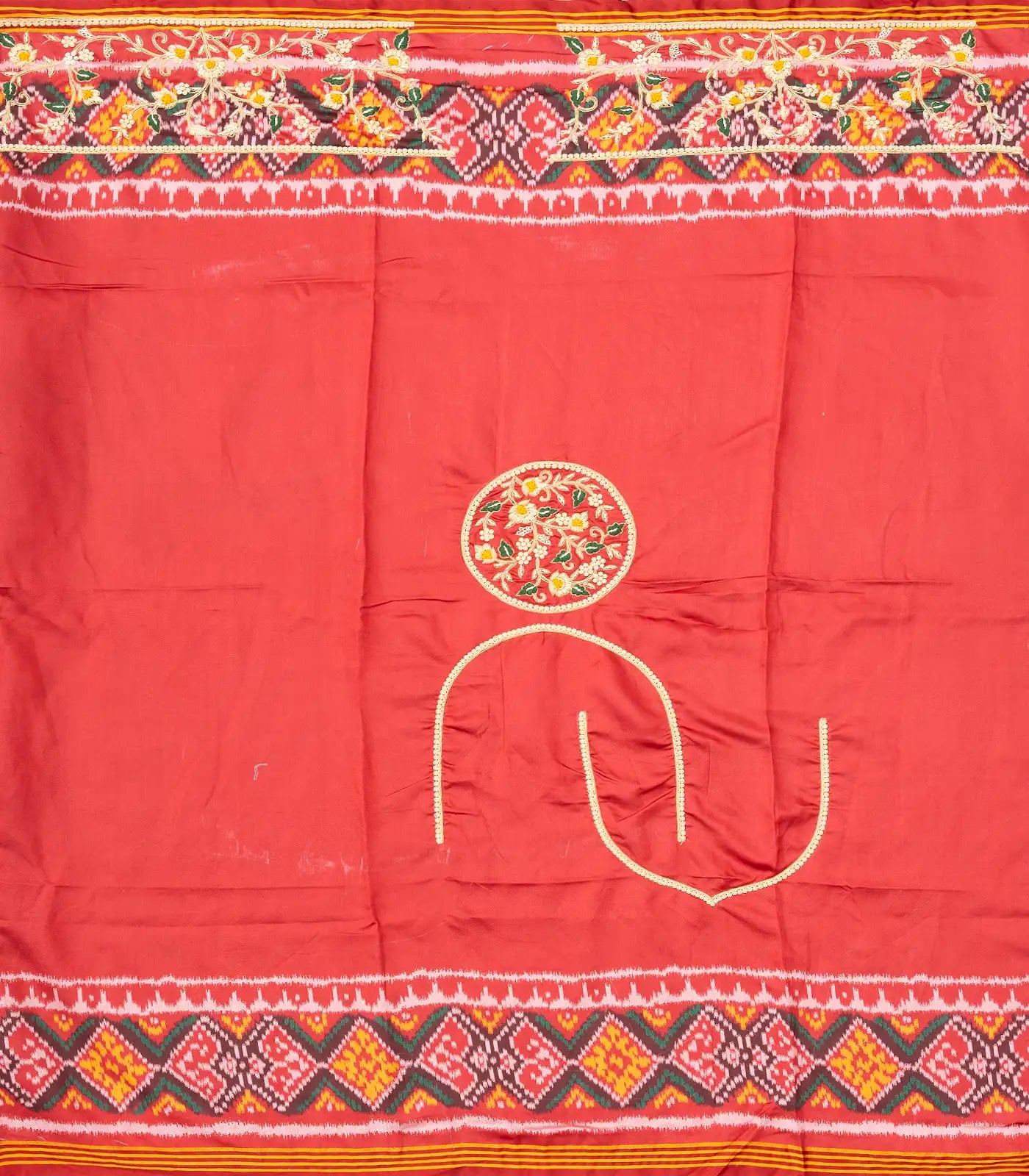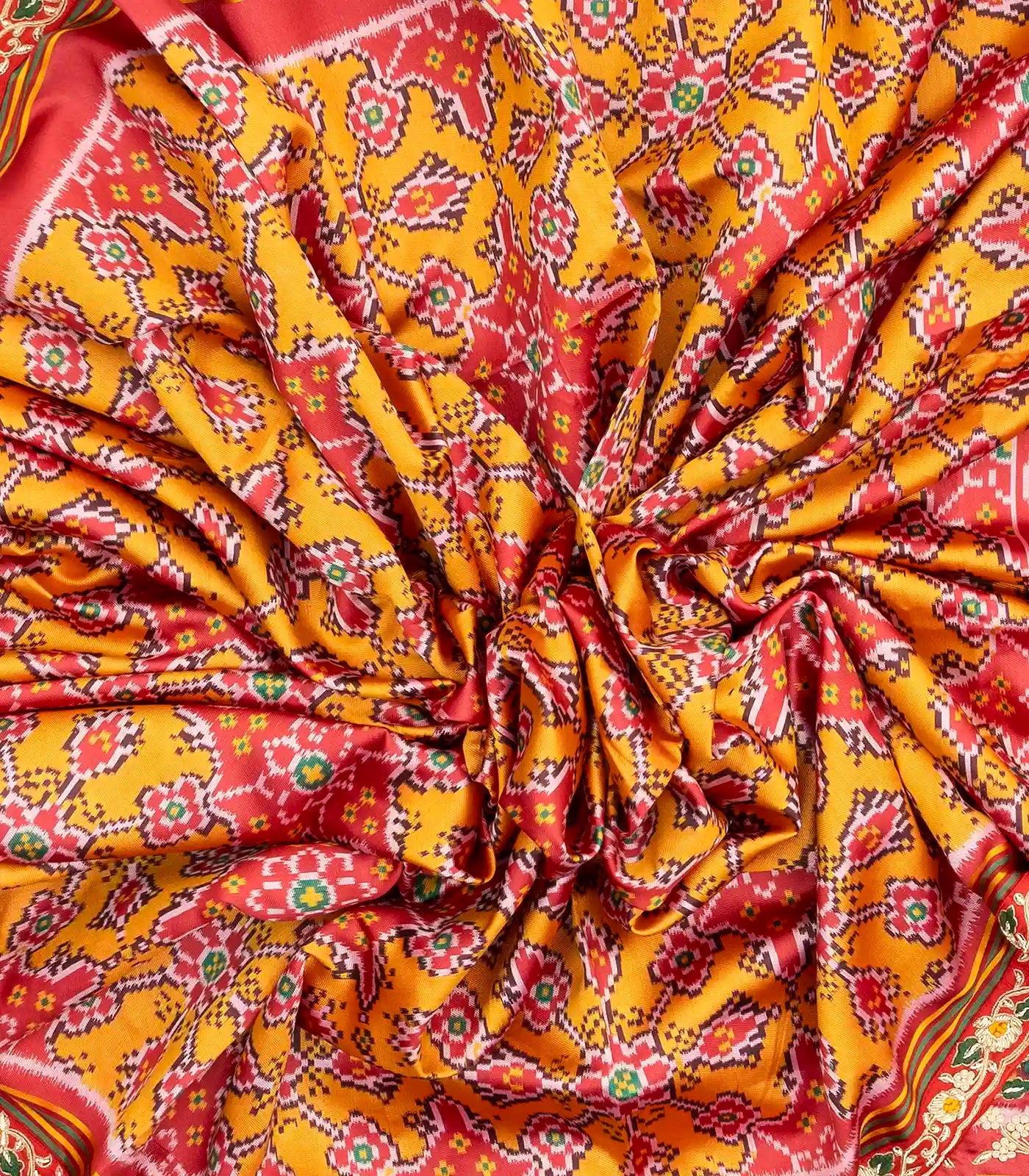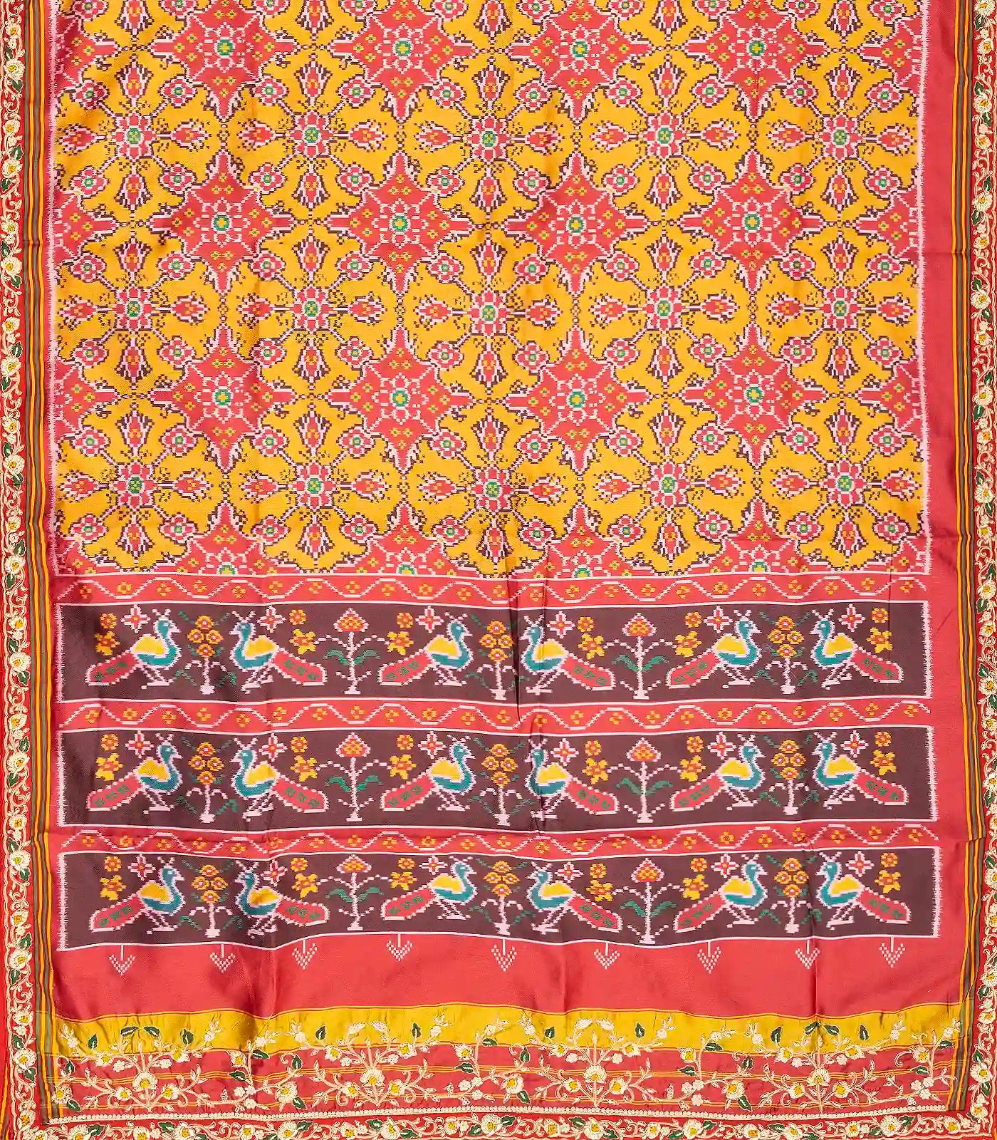 This handwoven Blended silk saree is filled with ikat motifs in yellow body along with border and pallu with hand embroidered selvage