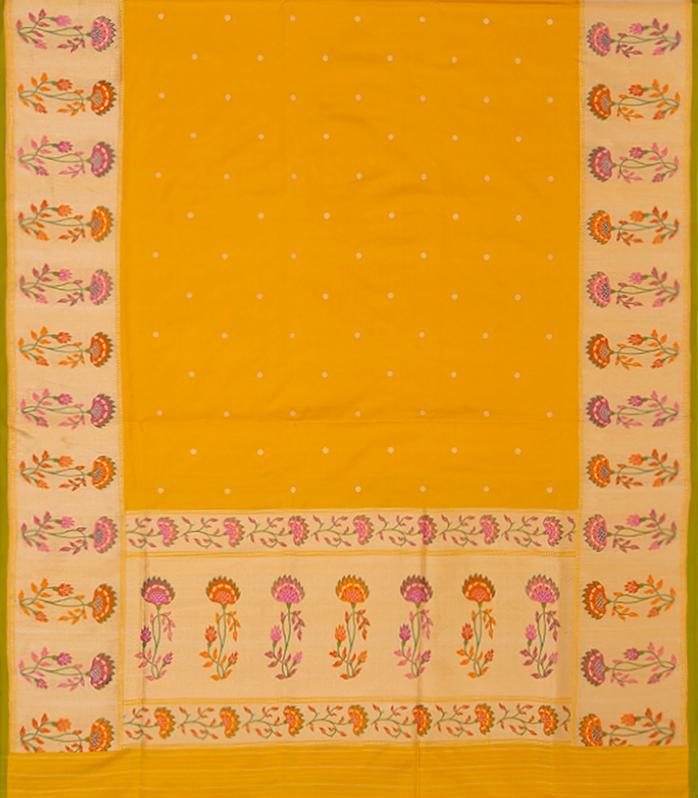 Mustard Handwoven Benarasi Silk Saree With Micro Butta & Flower Motifs in Meena Border & Pallu-Mustard