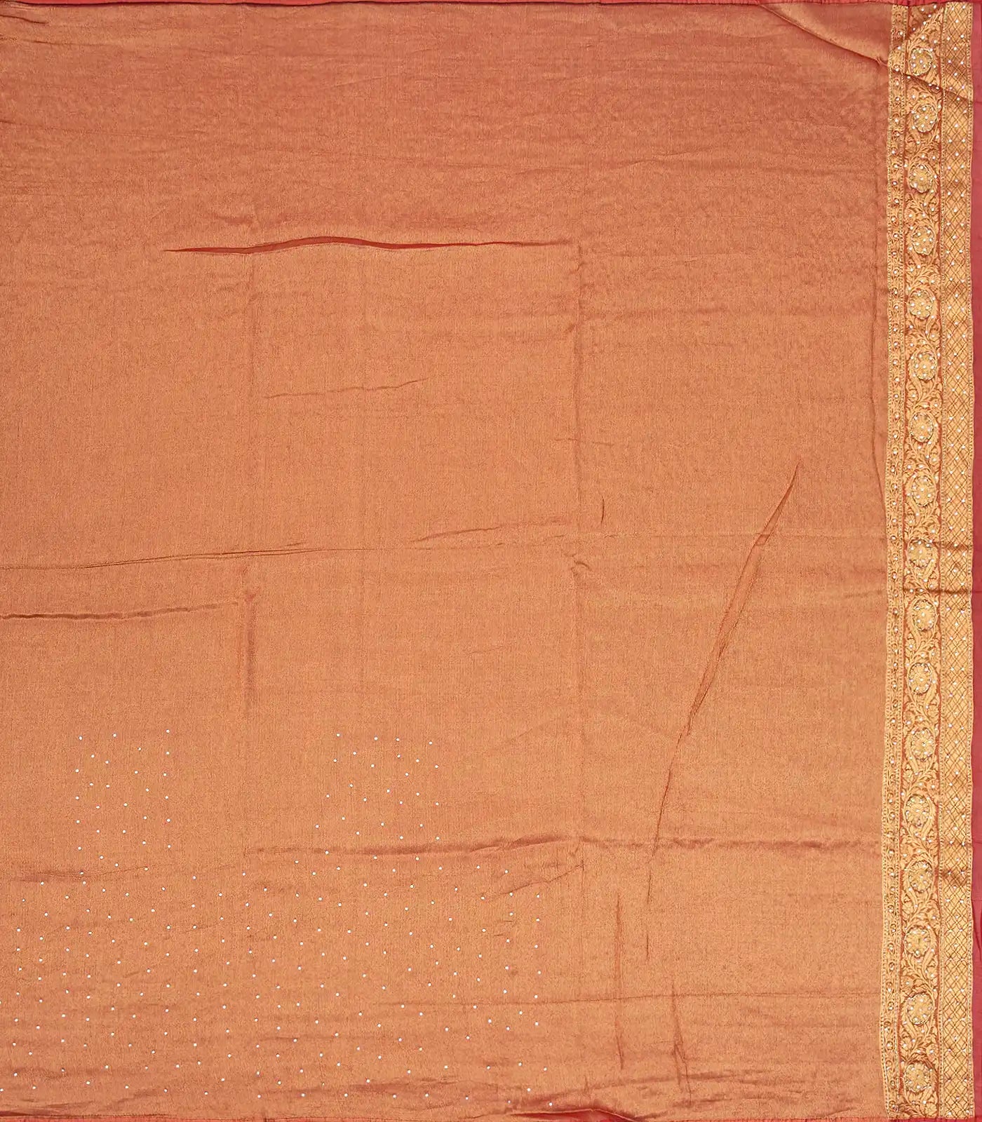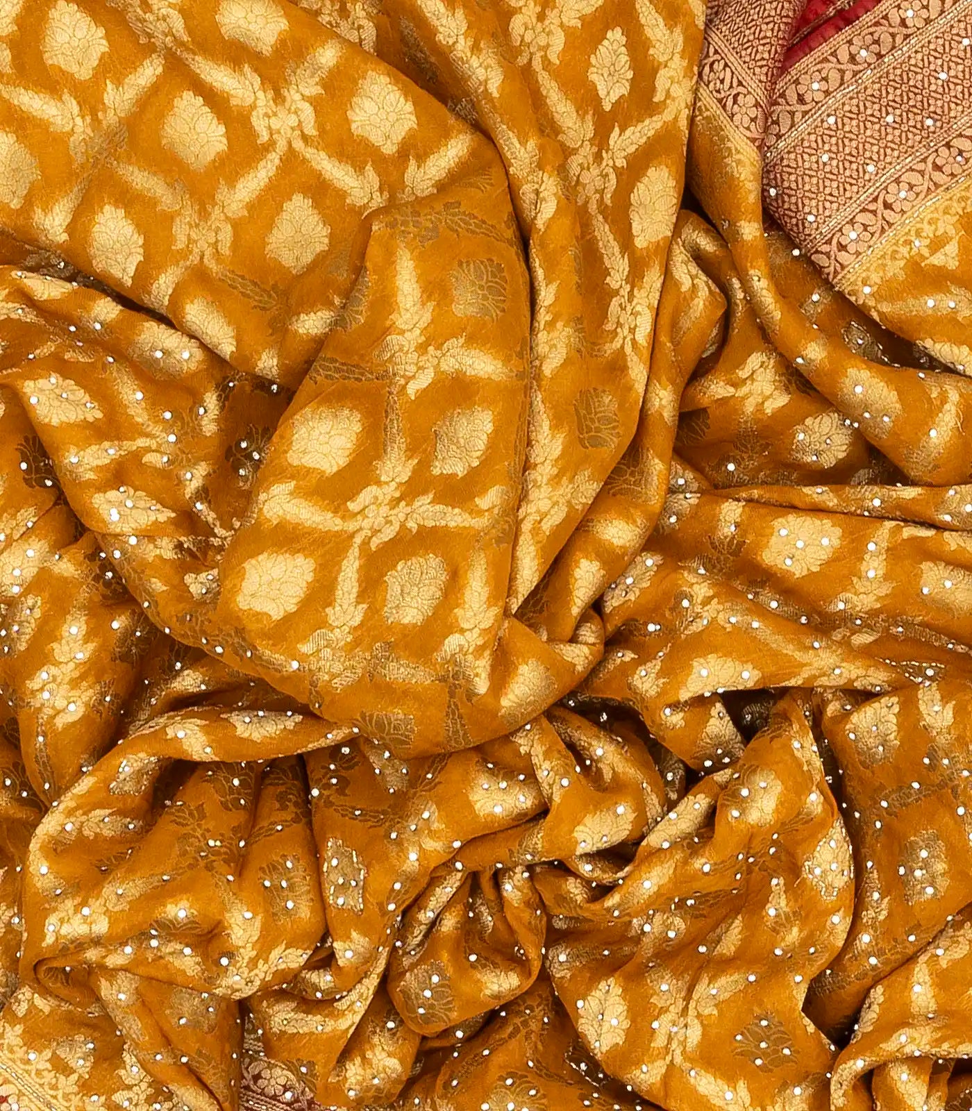 This woven banarasi khadi georgette saree is filled with floral jaal motifs & mirror work in mustard body along with contrast border and pallu