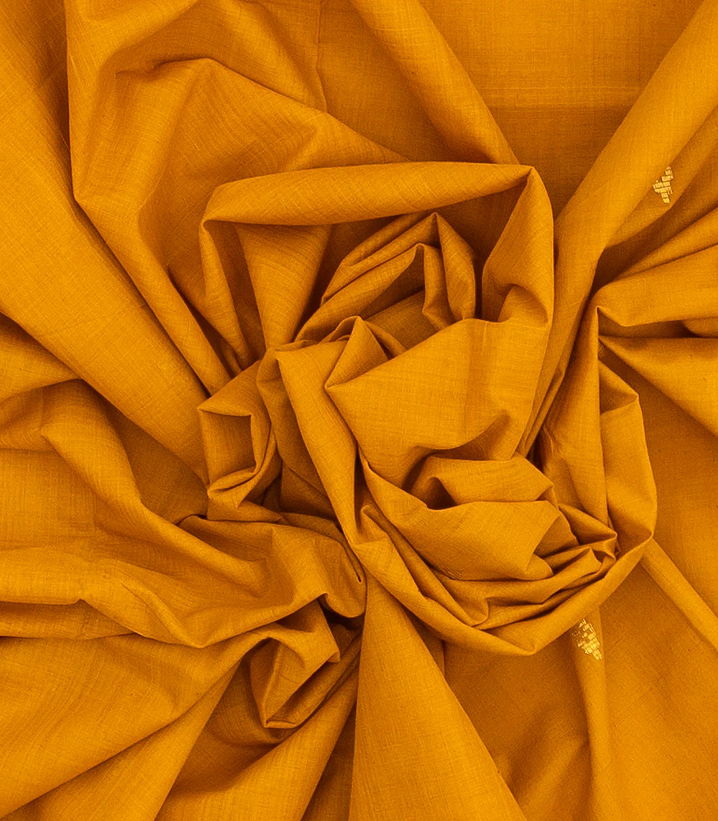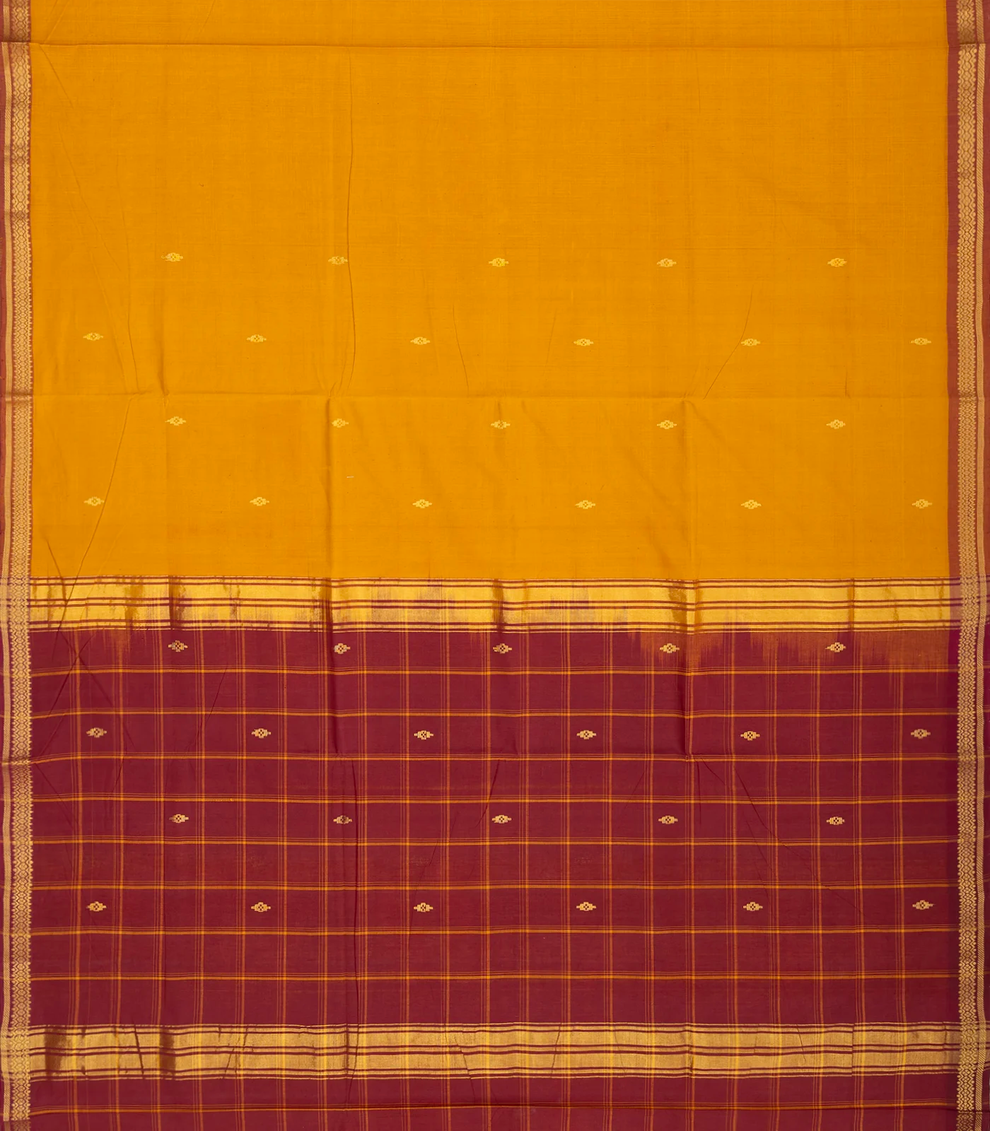 This woven kadapa cotton saree is filled with buttas in mustard body along with contrast border and pallu