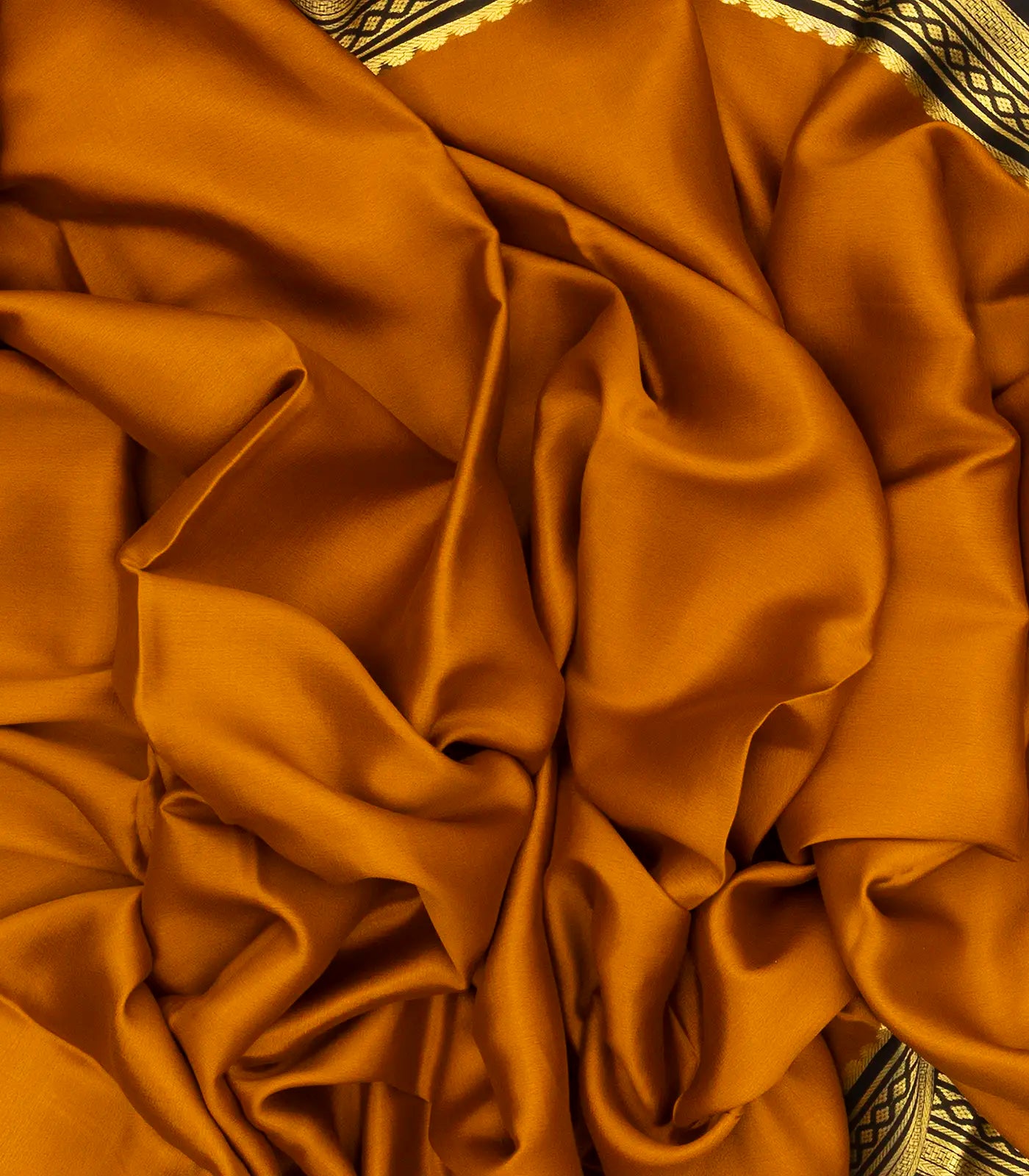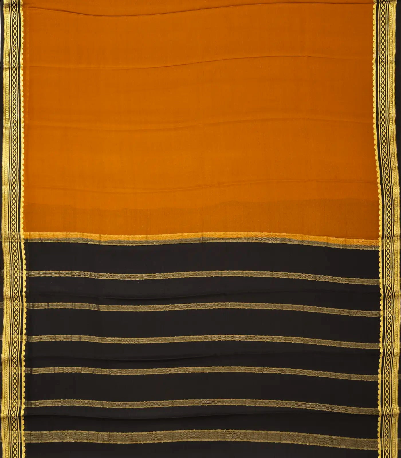 This woven mysore crepe silk saree is filled with plain oil mustard body along with contrast black border and pallu