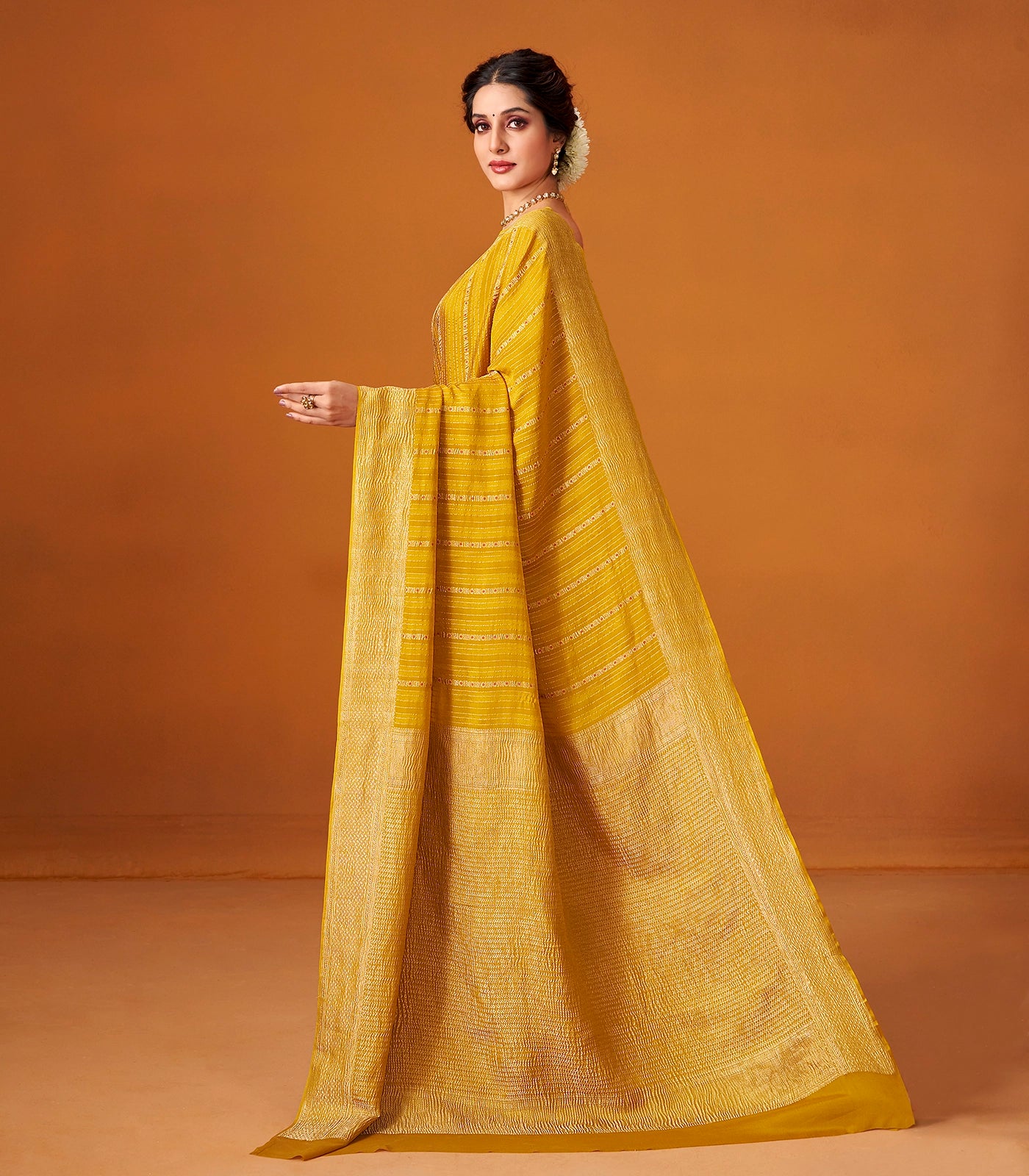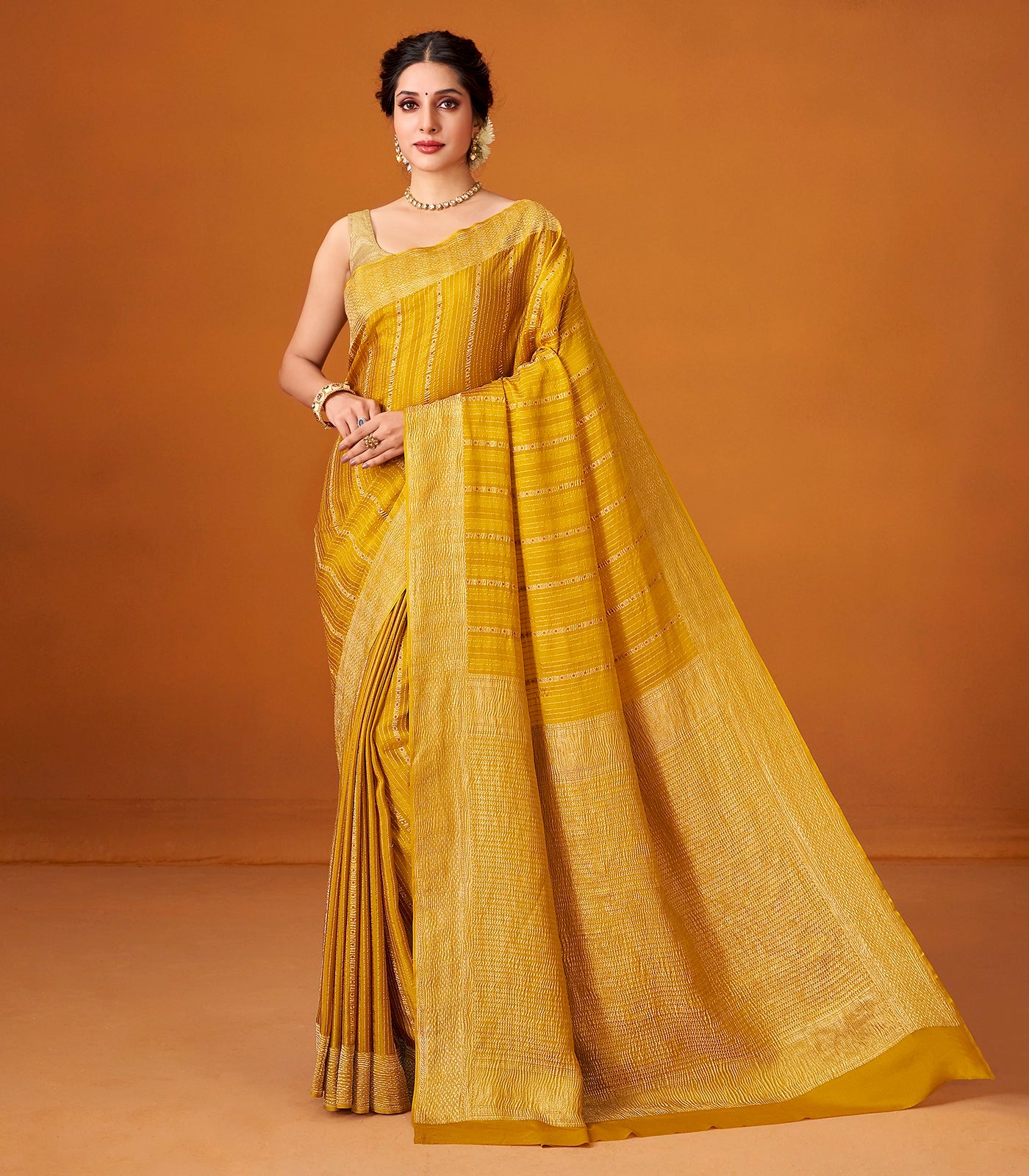This woven mysore crepe silk saree is filled with zari stripes in mustard body along with border and pallu