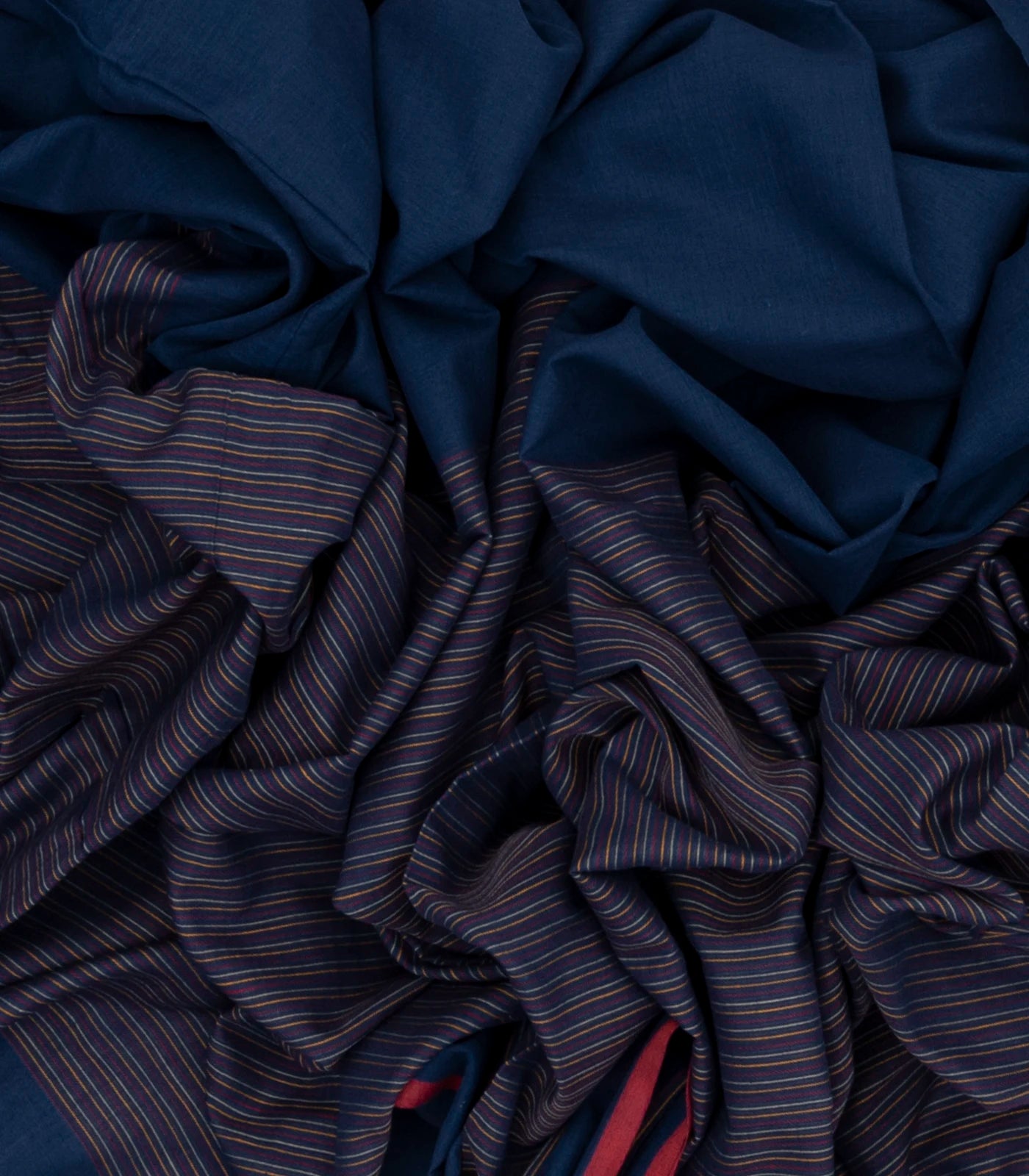 This handwoven bengal cotton saree is filled with stripes in navy blue body along with contrast border and pallu