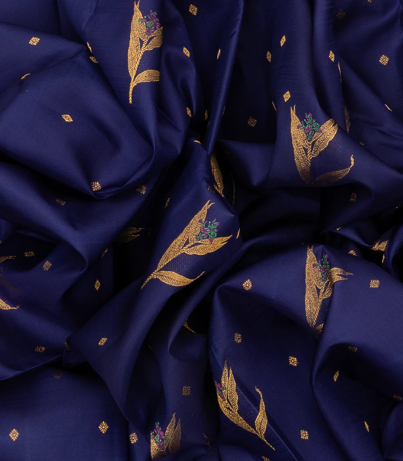 This handwoven kanchipuram silk saree is filled with floral buttas in navy blue body along with selvage border and pallu