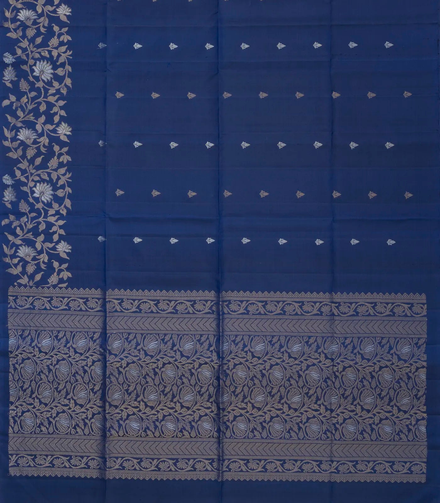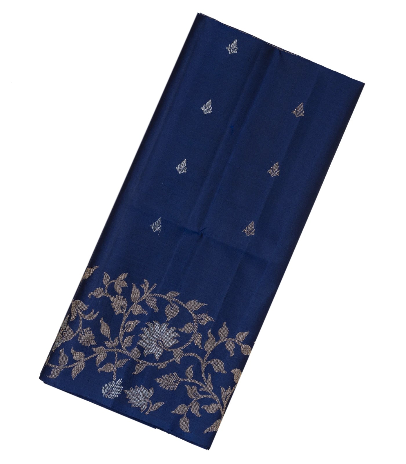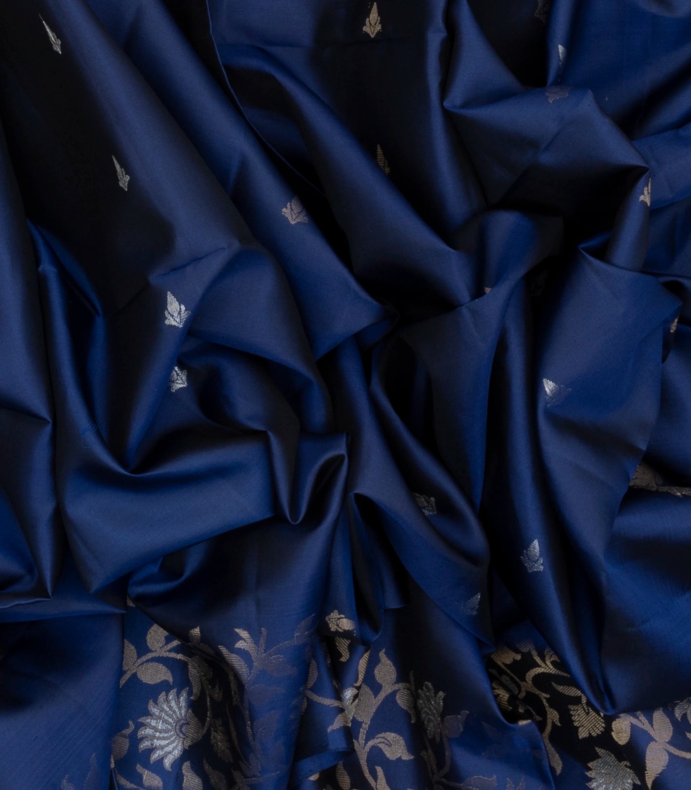 This handwoven soft silk saree is filled with floral motifs in navy blue body along with border and pallu