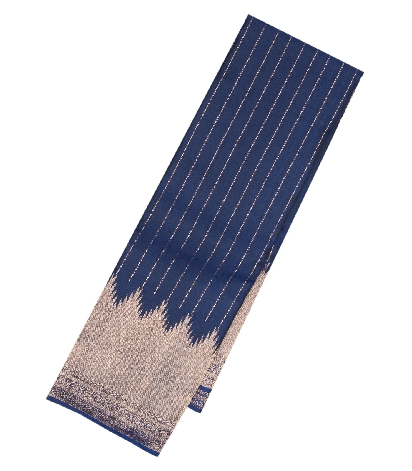 This handwoven soft silk saree is filled with zari stripes in navy blue body along with temple border and pallu