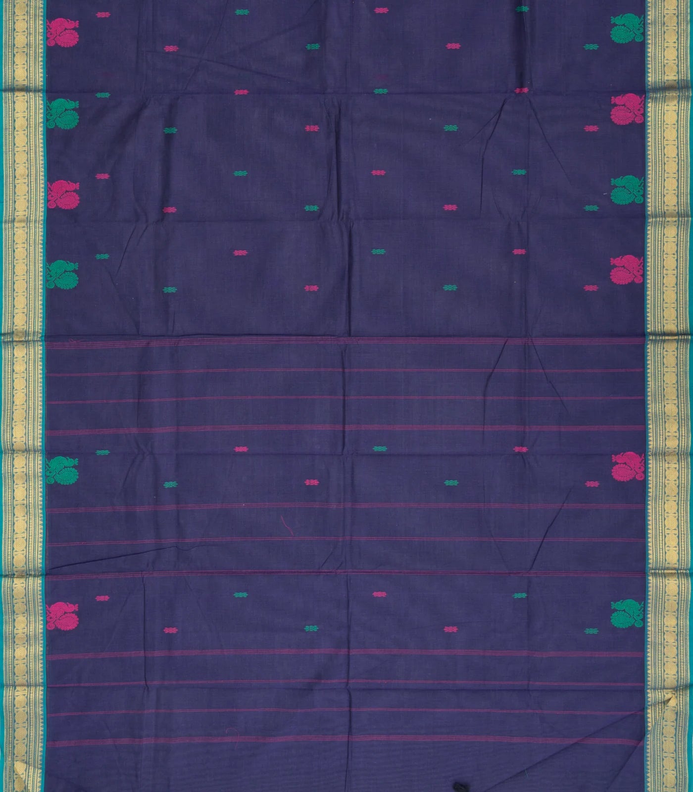 This woven chettinad cotton saree is filled with buttas in navy blue body along with contrast border and pallu