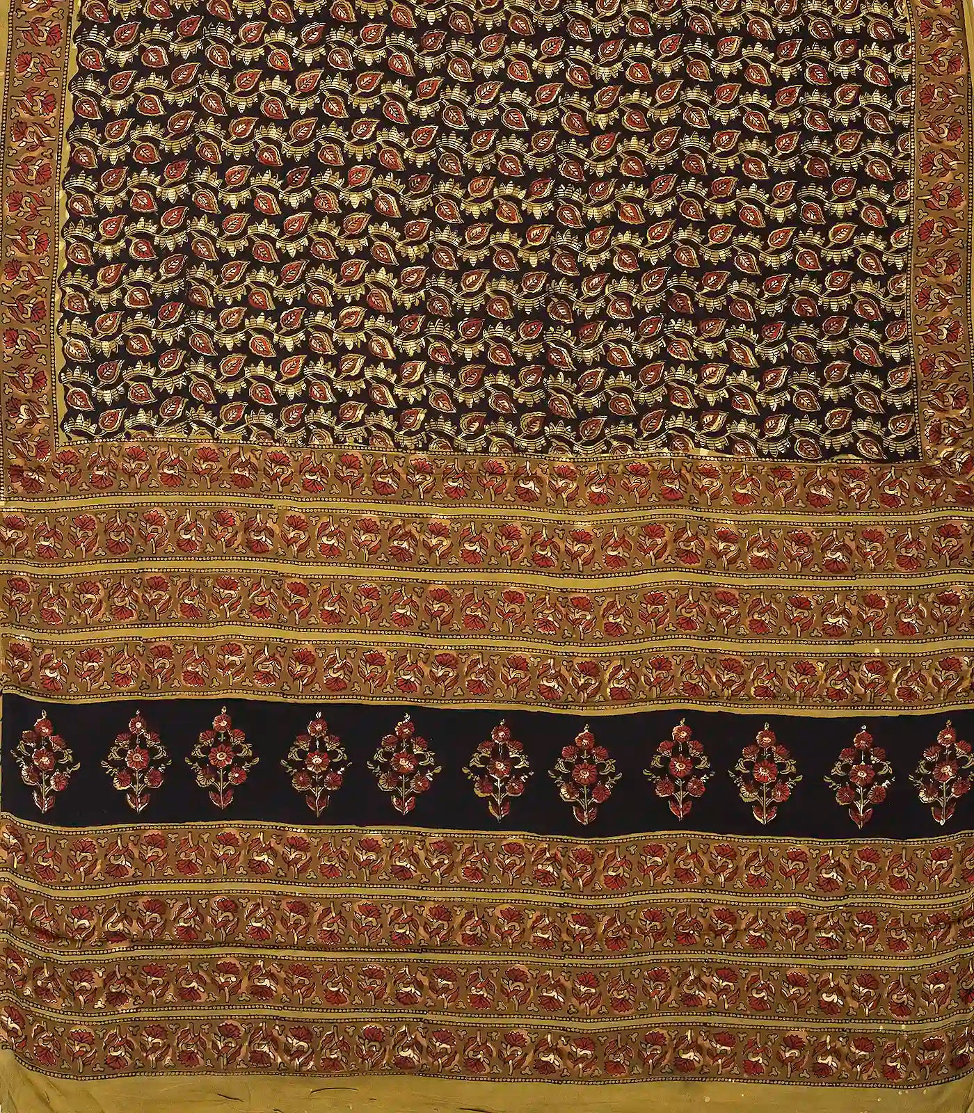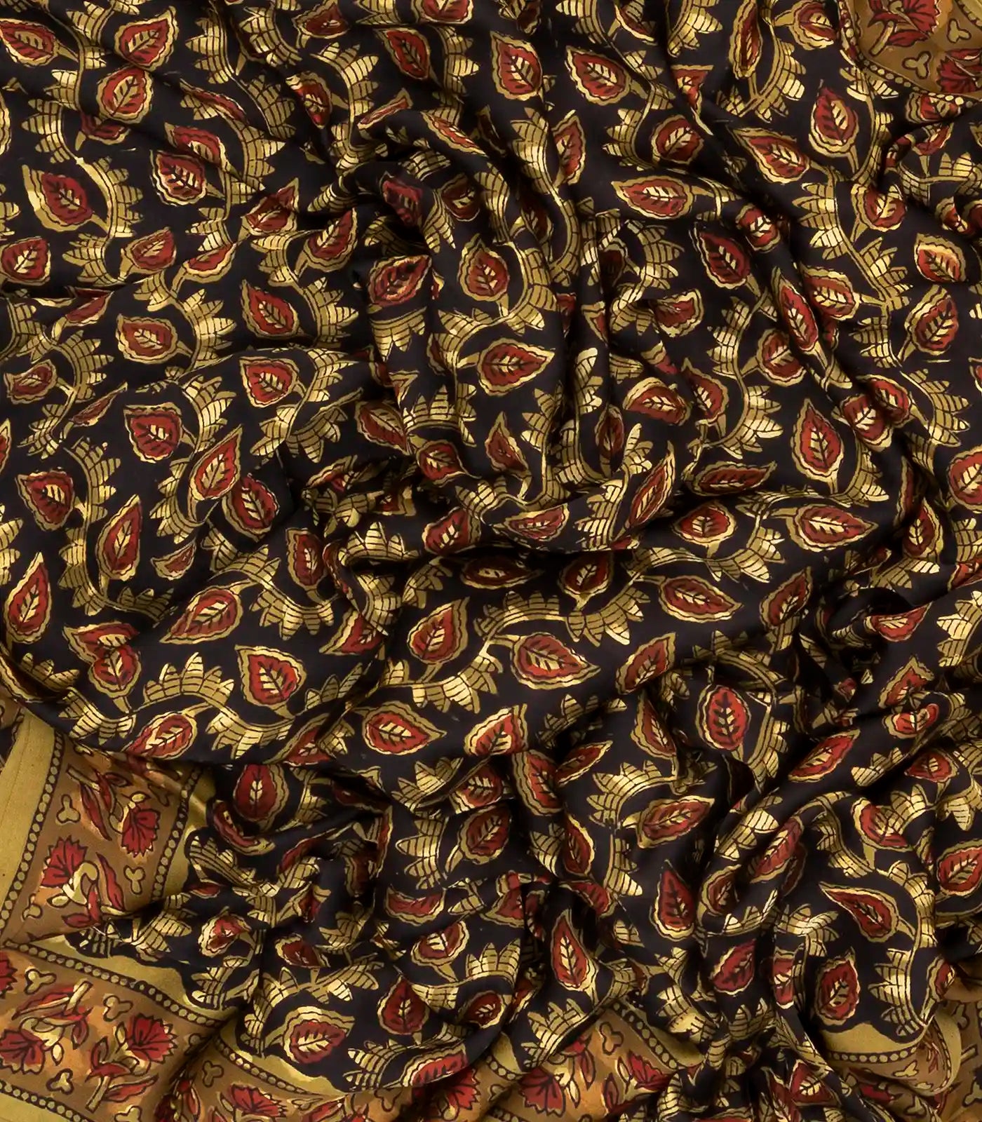 This woven modal silk saree is filled with ajrakh printed motifs in navy blue body along with border and pallu