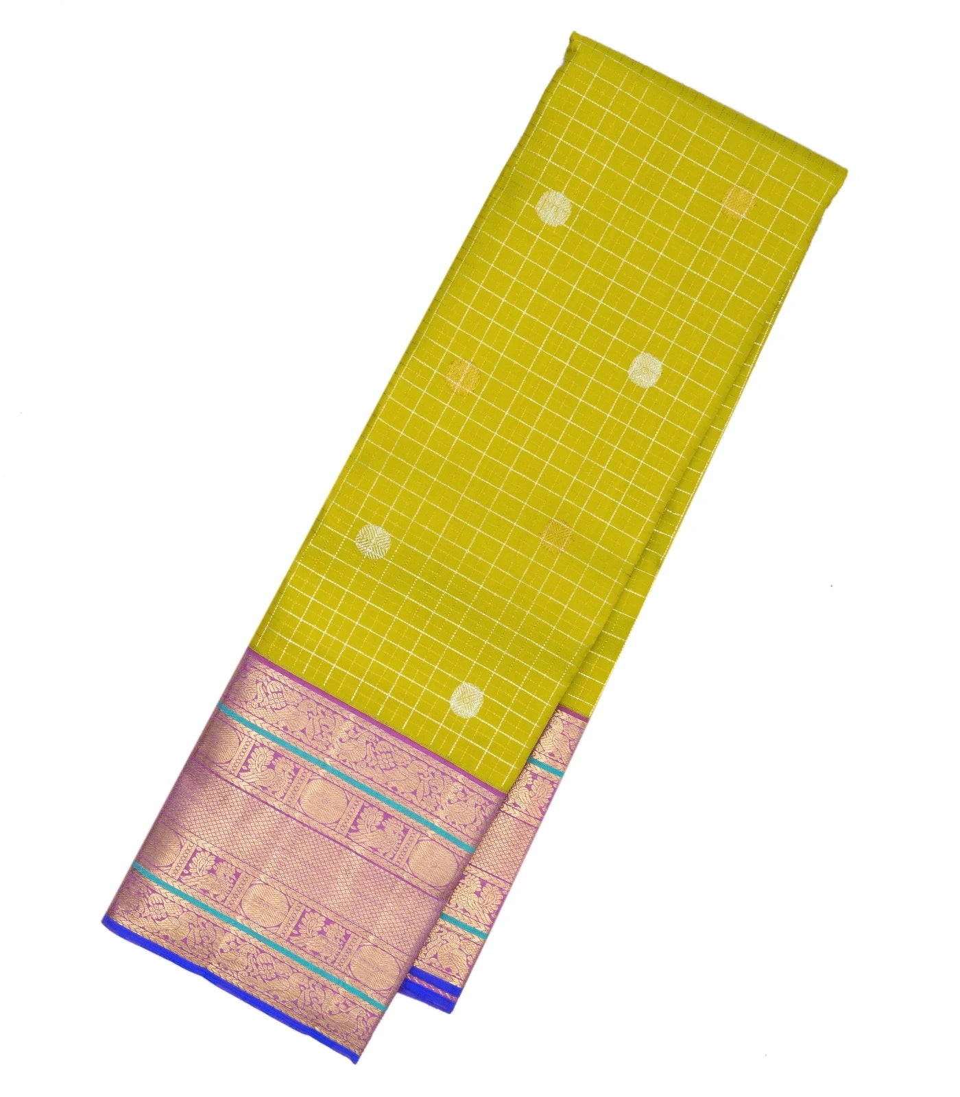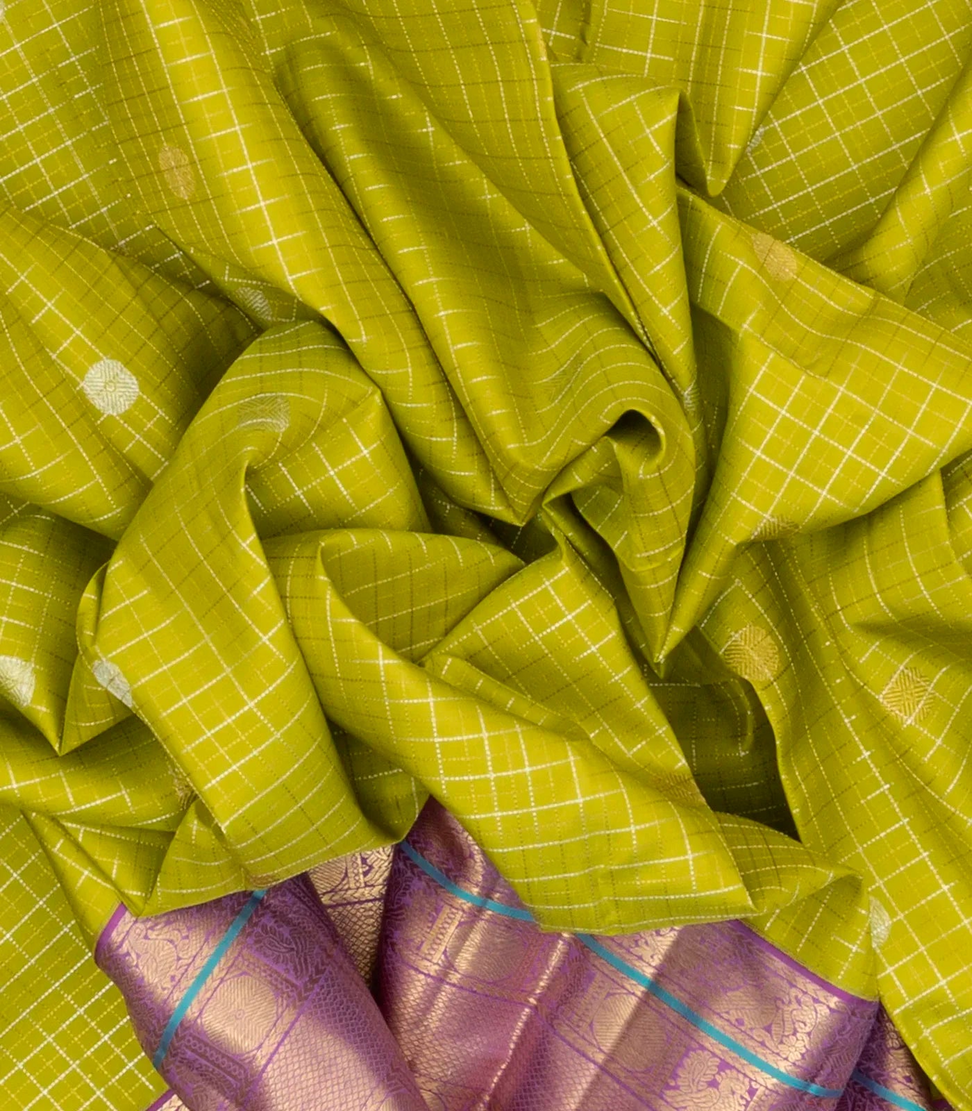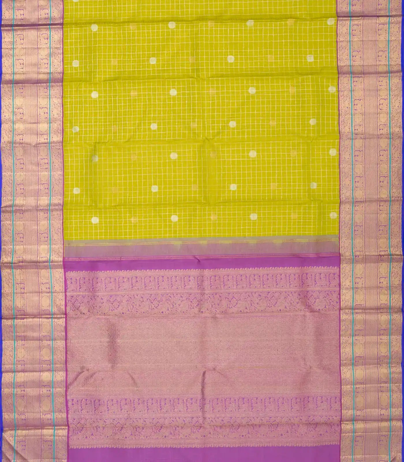 Neon Green Handloom Korvai Kanchipuram Silk Saree With Checks & Buttas-KA12271
