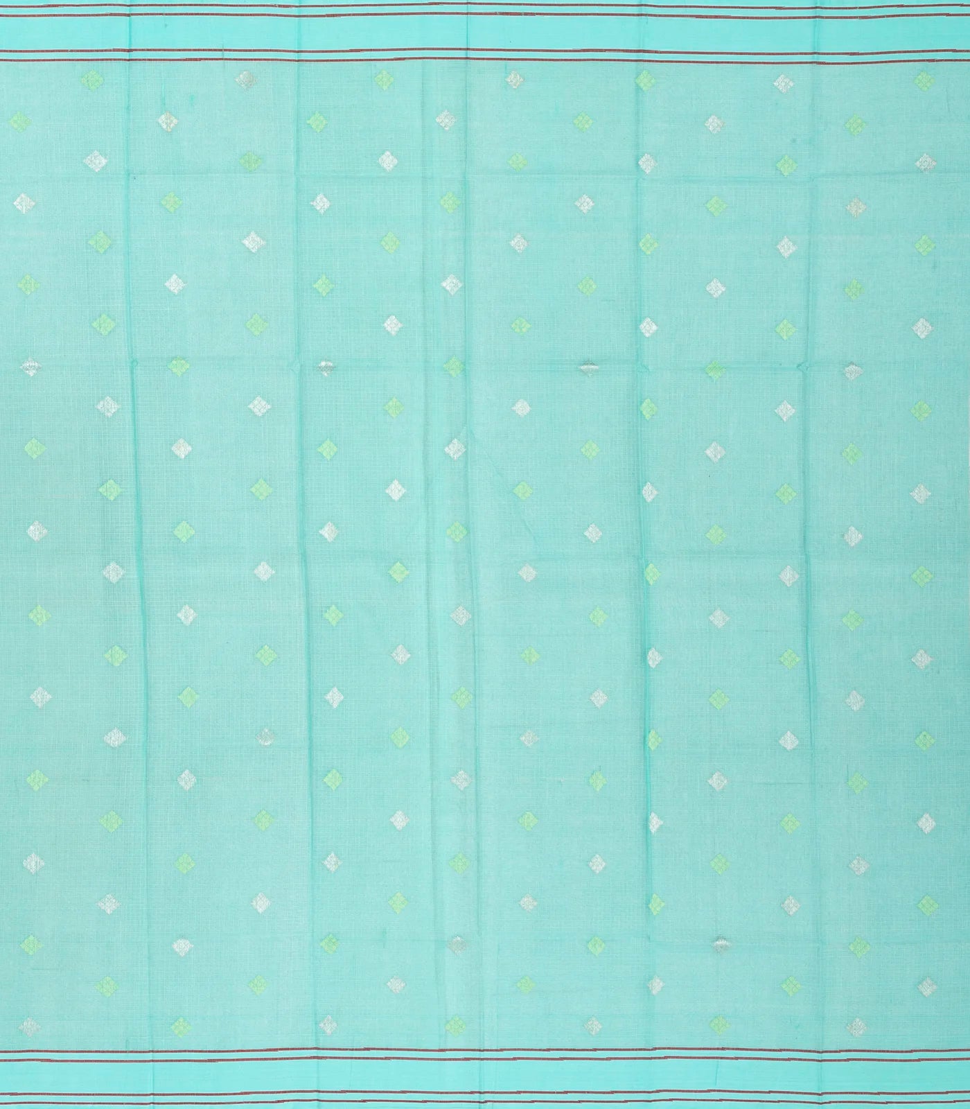This handwoven kota silk saree is filled with meena floral buttas in neon green body along with contrast border and pallu