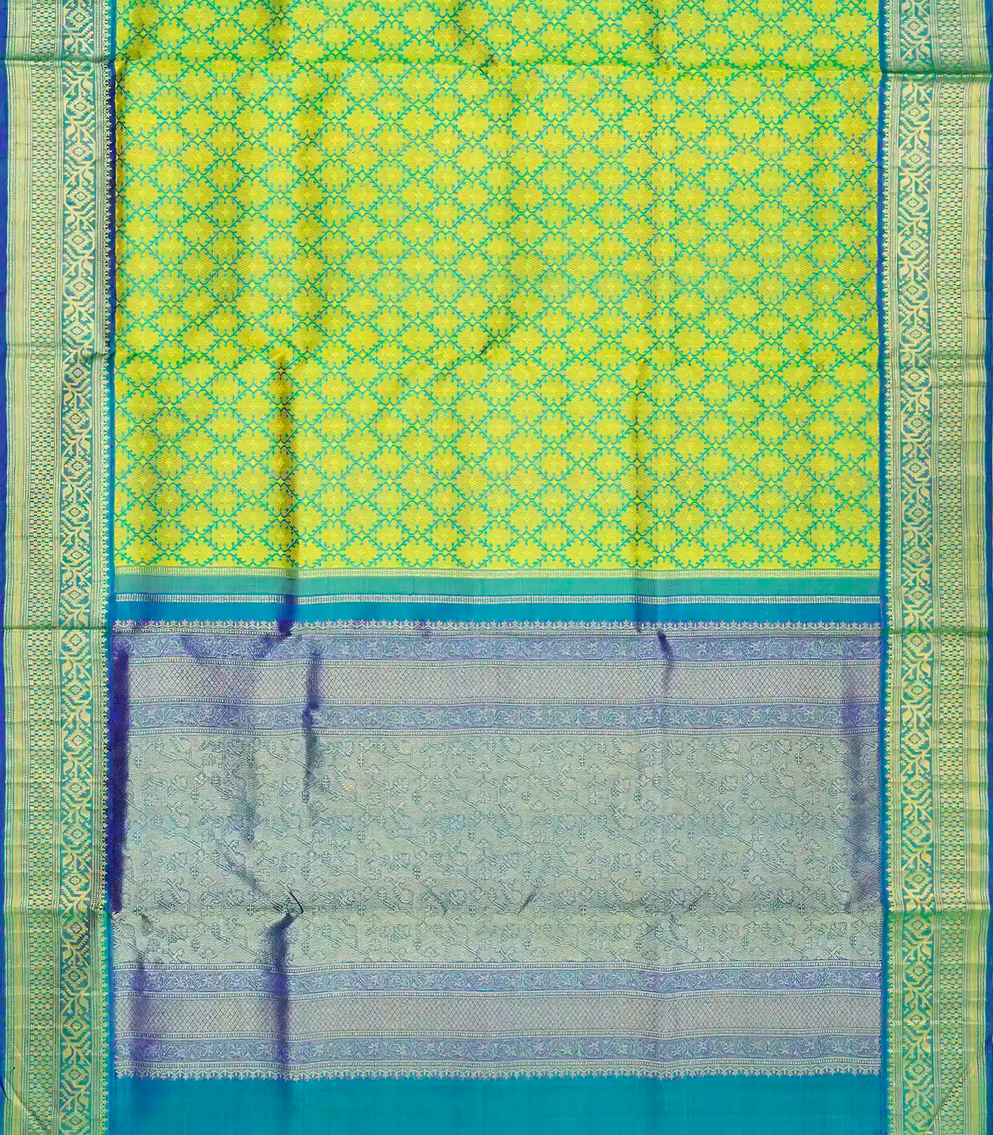 This beautiful green Lino silk saree was conceptualised, designed and handwoven by RmKV master weavers using two of RmKV’s own patented techniques - Lino and Varnajaalam.