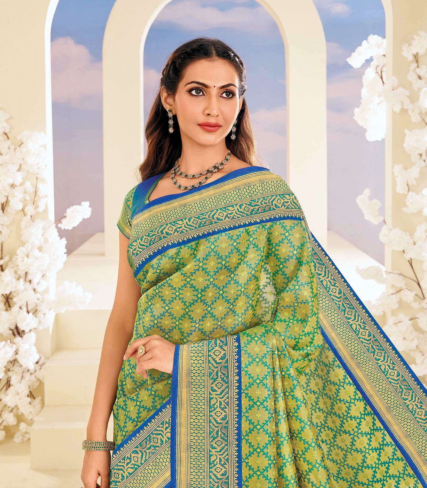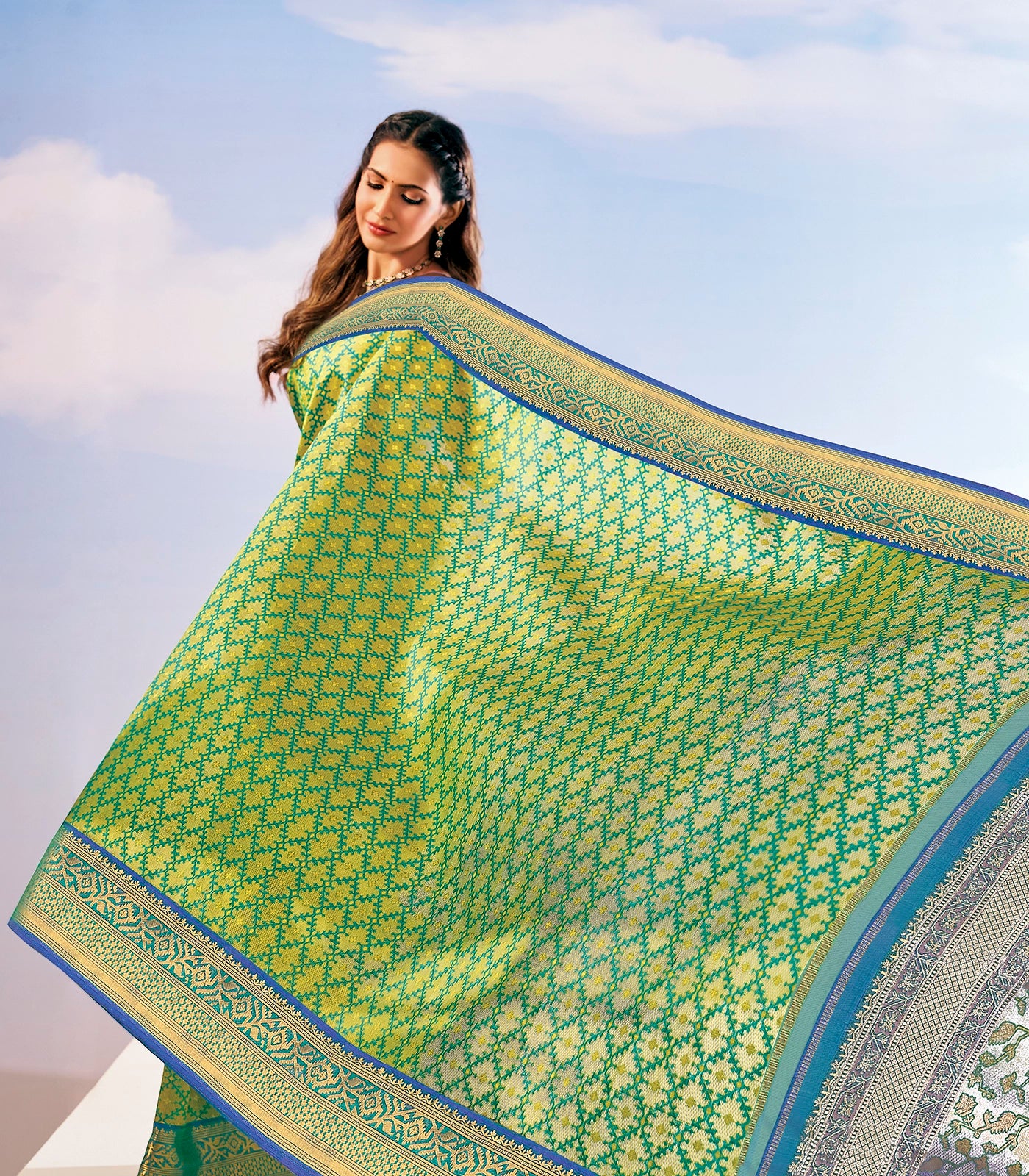 This saree is a bold expression of artistic innovation and masterful craftsmanship. The body gleams in a vivid green, brought to life with ethereal Jamdhani-inspired motifs. Delicate Dubla Jaal (latticework), Jui Phool (jasmine flowers), and Tin Pati Buti (triple-leaf motifs) are intricately embedded into the luminous silk canvas, each one enhanced by the Leno technique, making the saree nearly 40% lighter than traditional silk sarees.