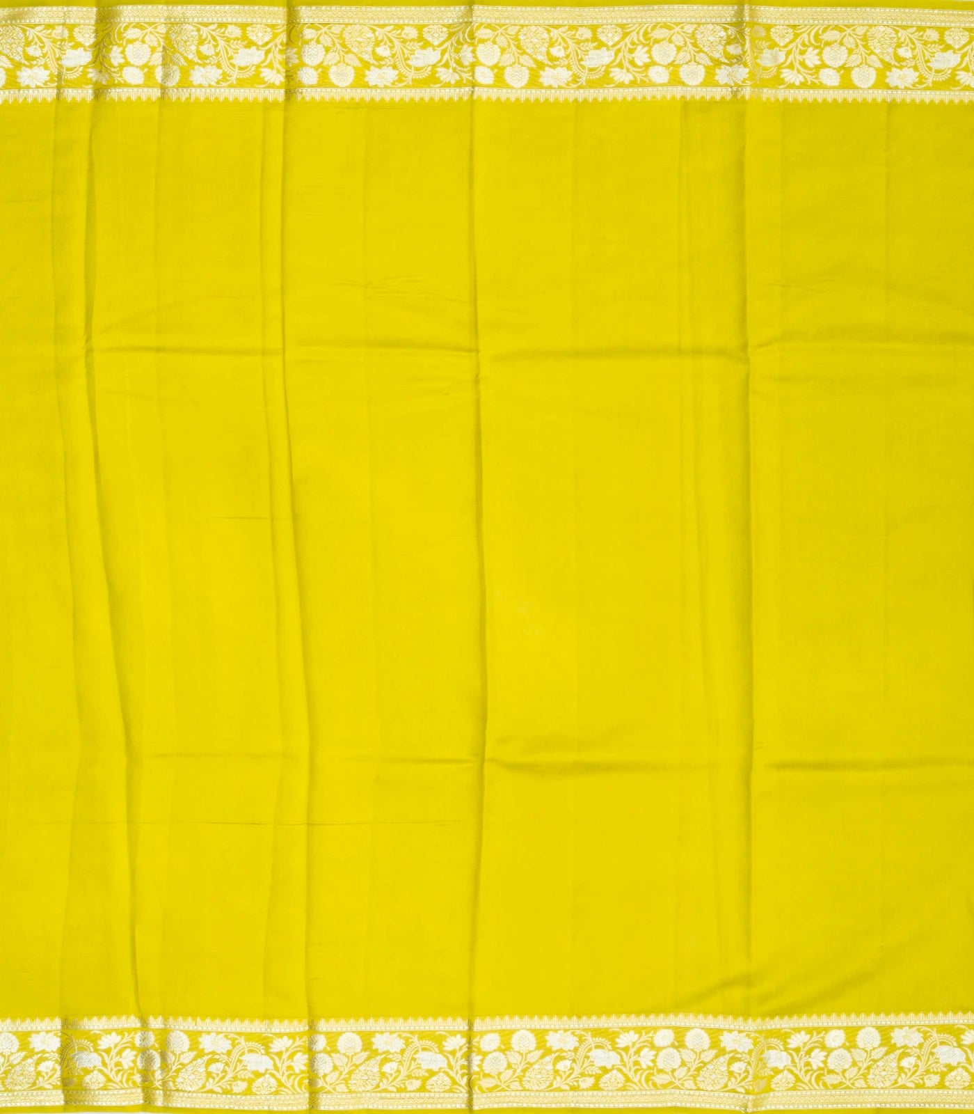 This woven dupion silk saree is filled with floral buttas in neon green body along with floral zari border and pallu