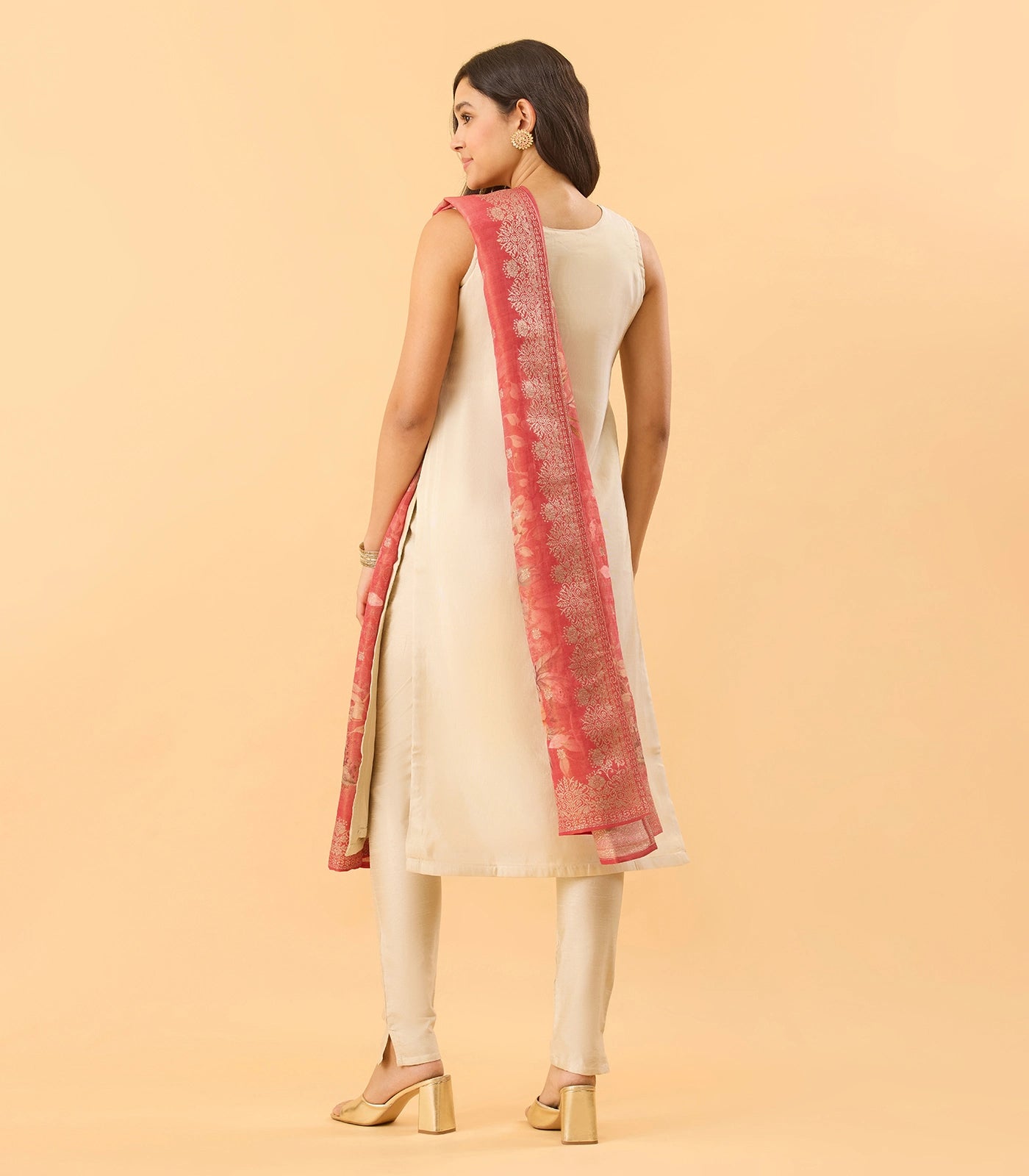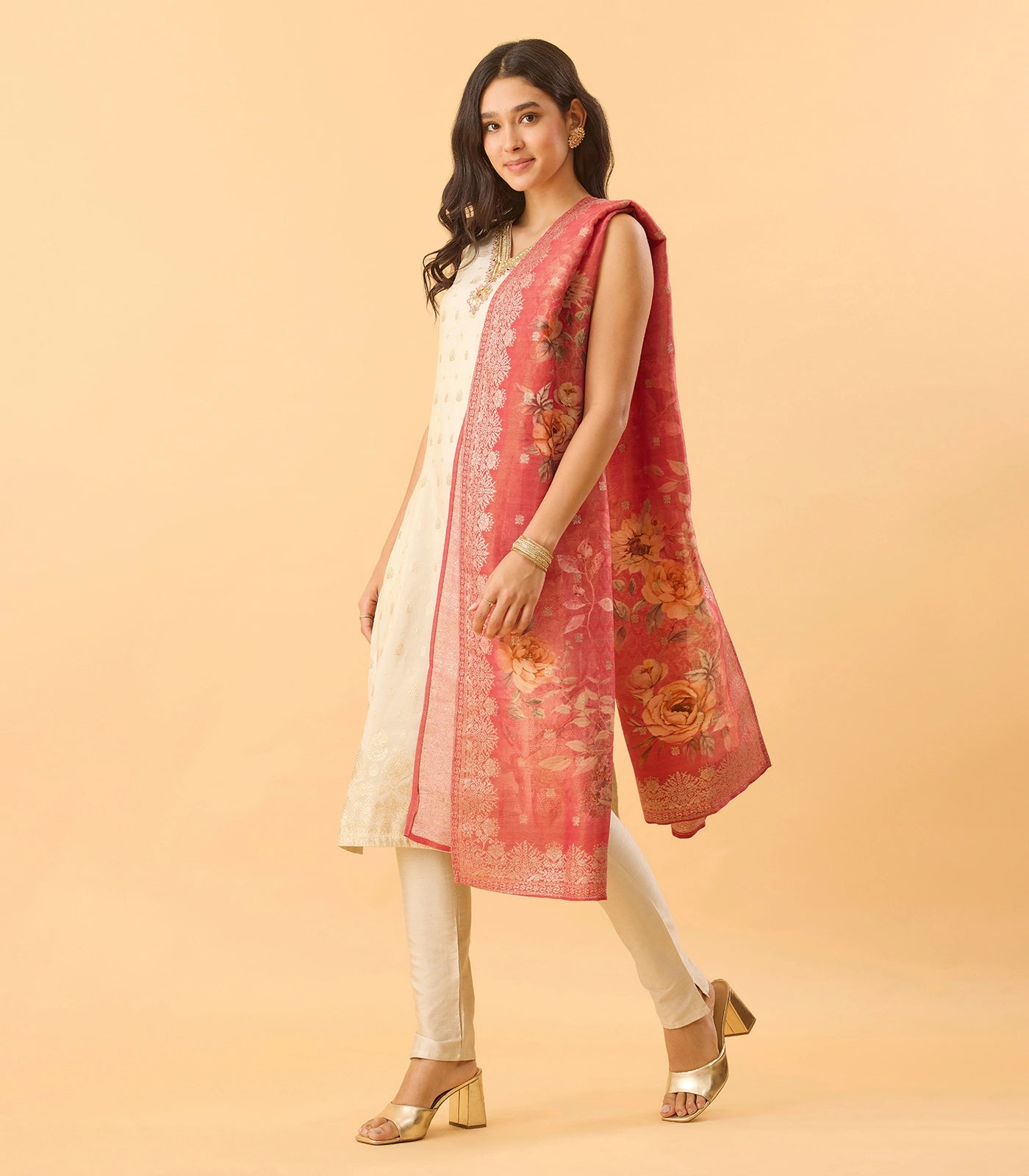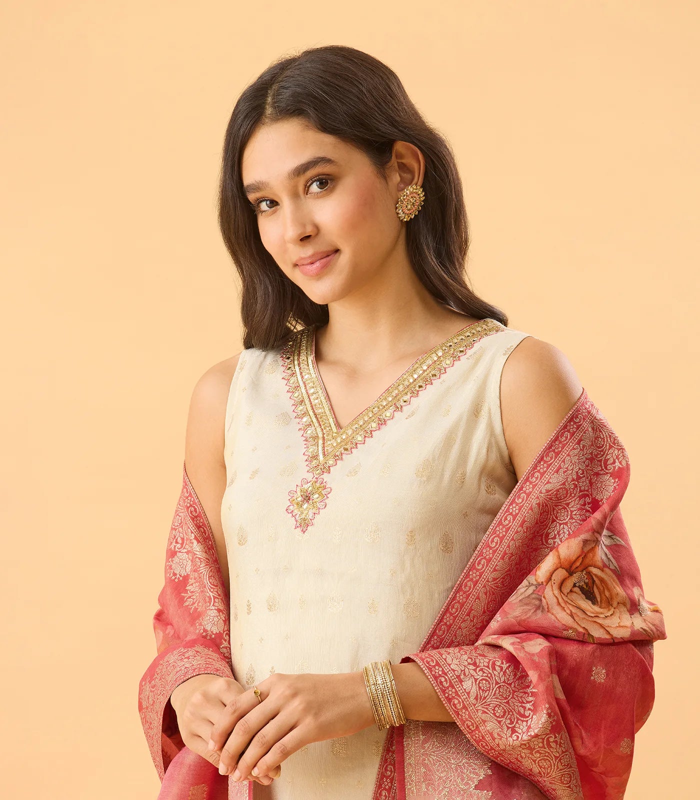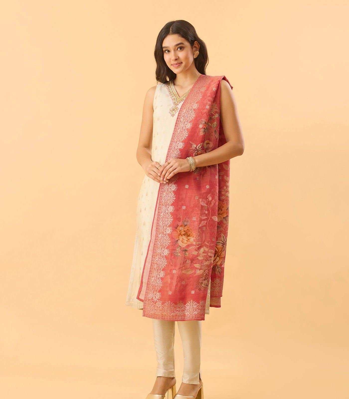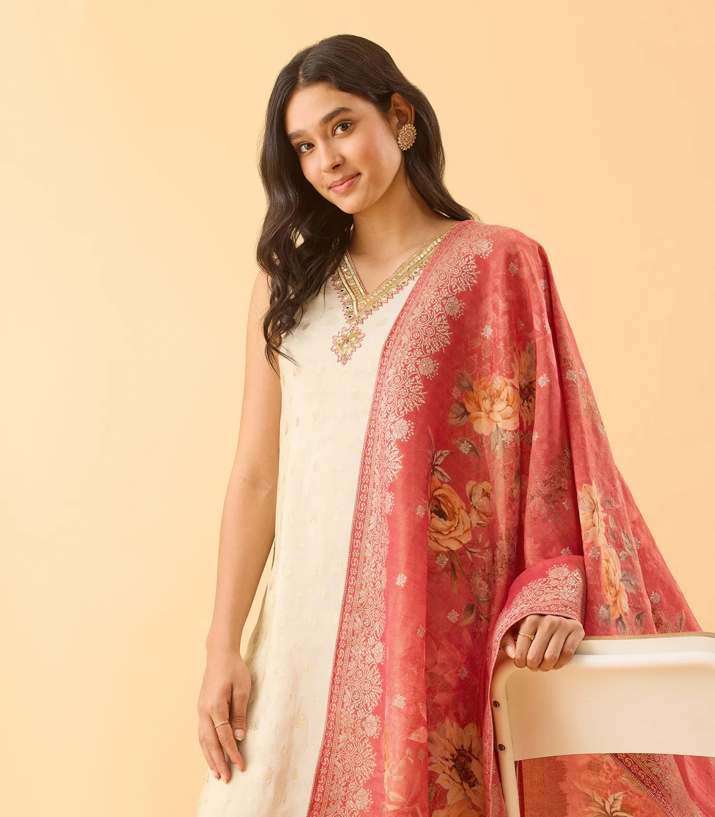 Paired with matching straight fit trouser and contrast brocade dupatta.