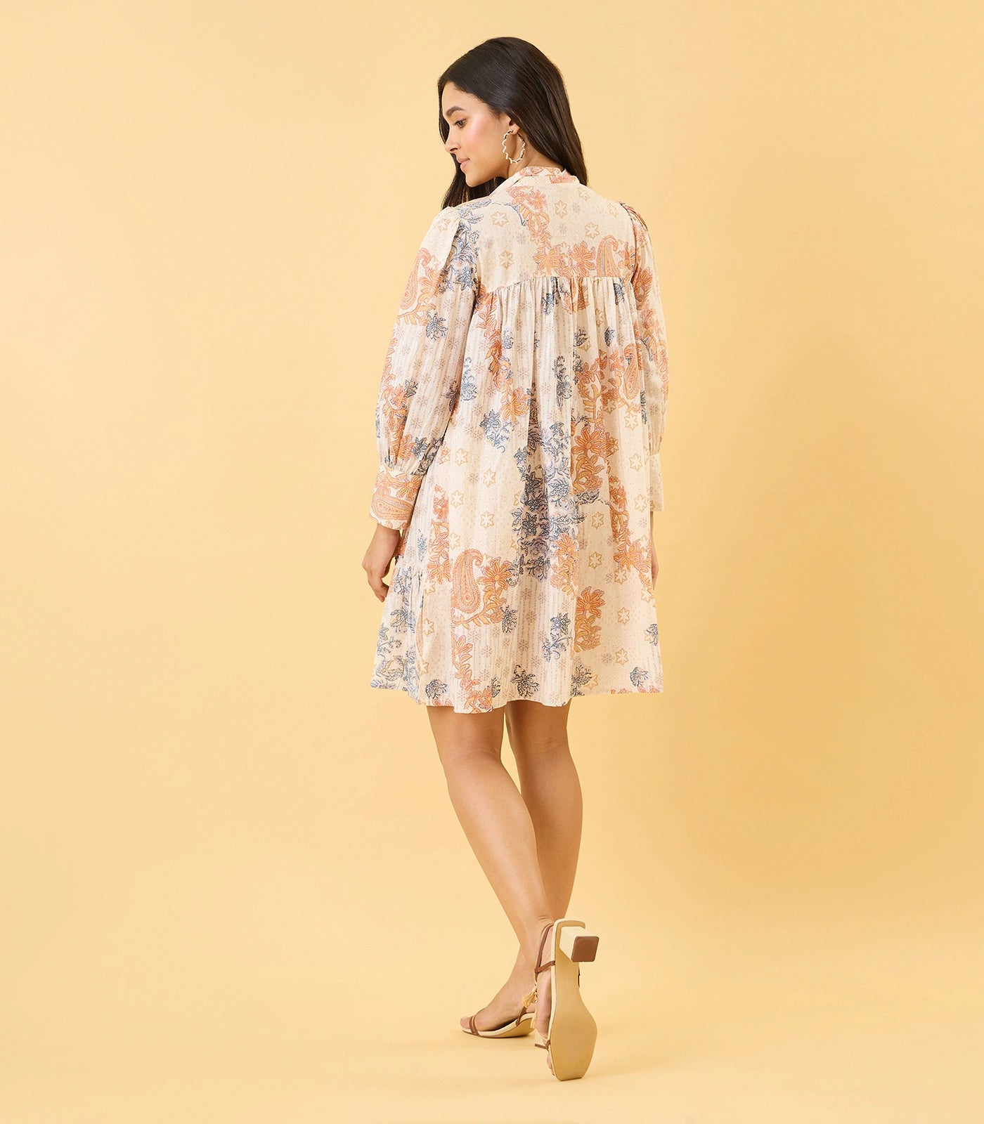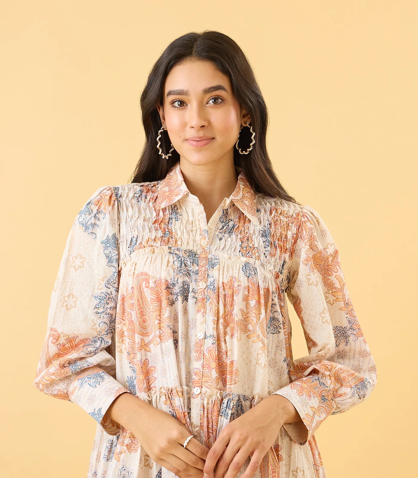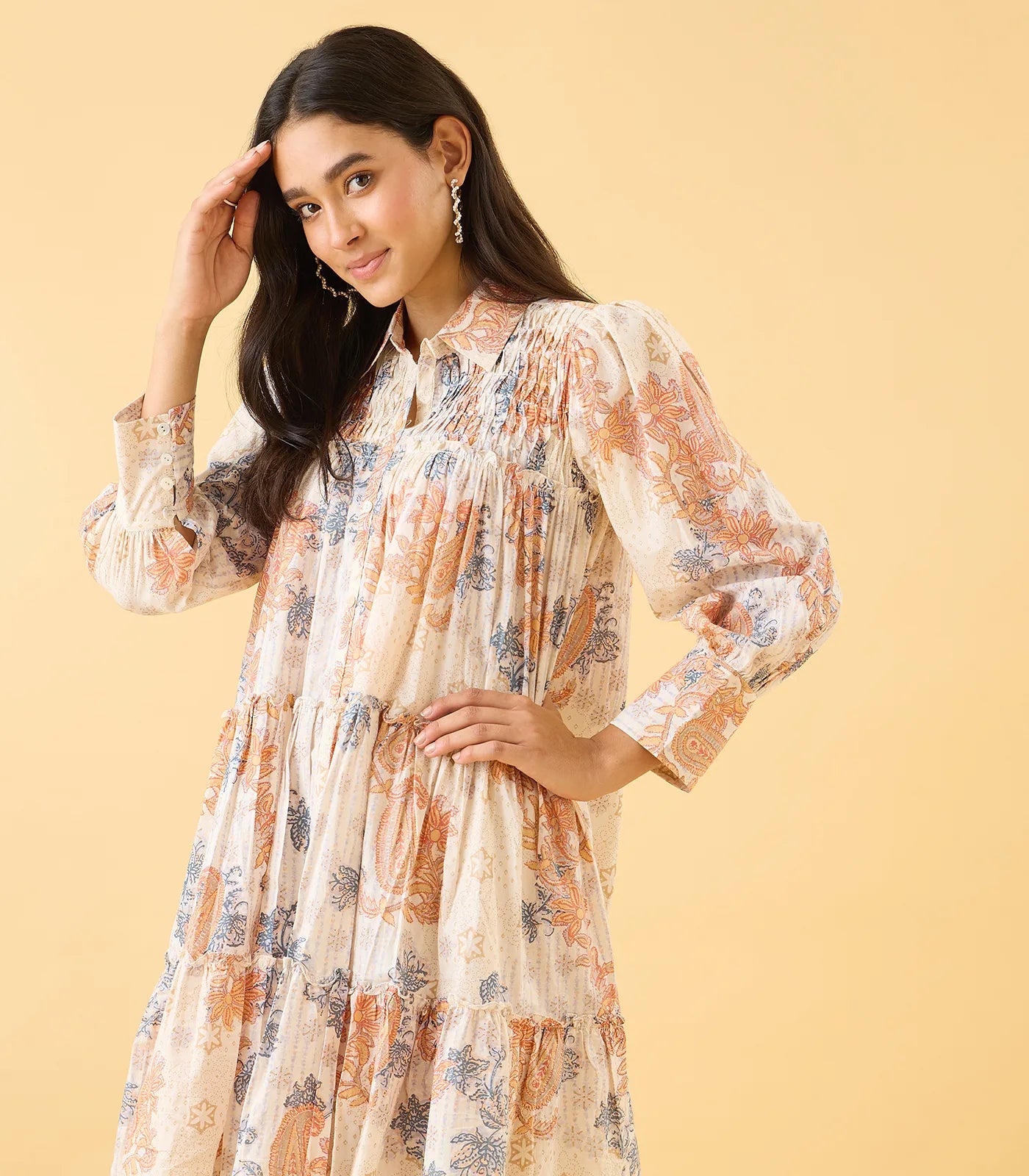 Featuring a modern shirt collar neckline, elegant bishop sleeves, and wave tuck detailing, this floral print dress offers a unique three-tier layered silhouette for a fashionable, comfortable fit.