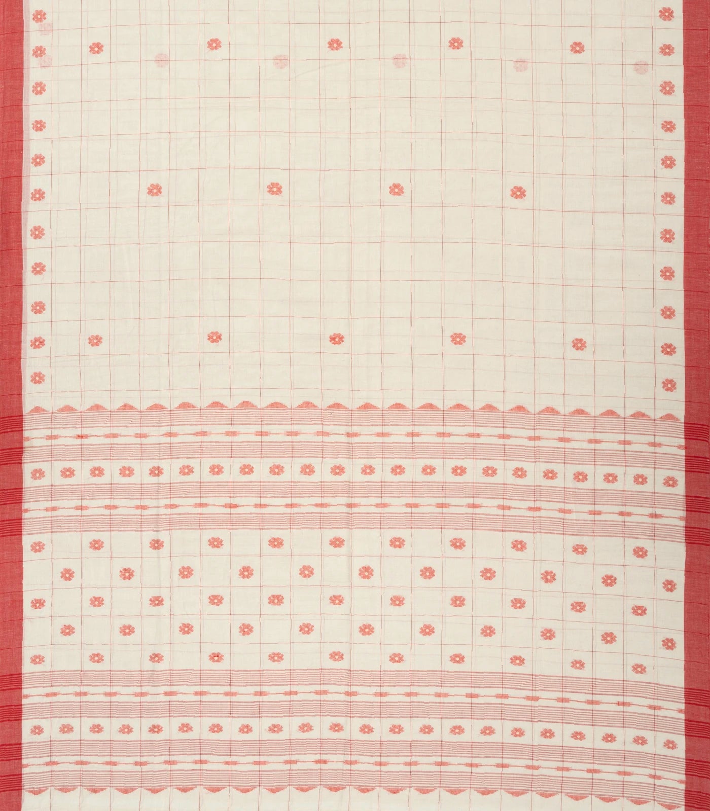 This handwoven bengal cotton saree is filled with checks & buttas in off white body along with contrast border and pallu