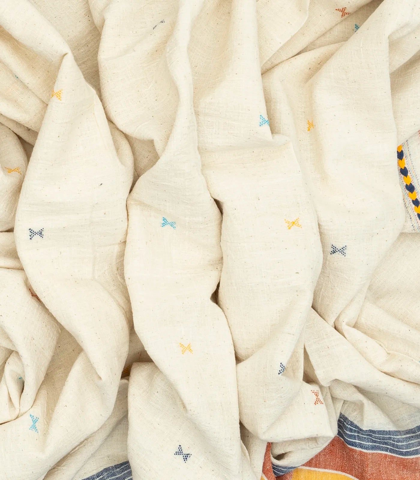 This handwoven bhujodi cotton saree is filled with cross buttas in off white body along with multi colour border and pallu