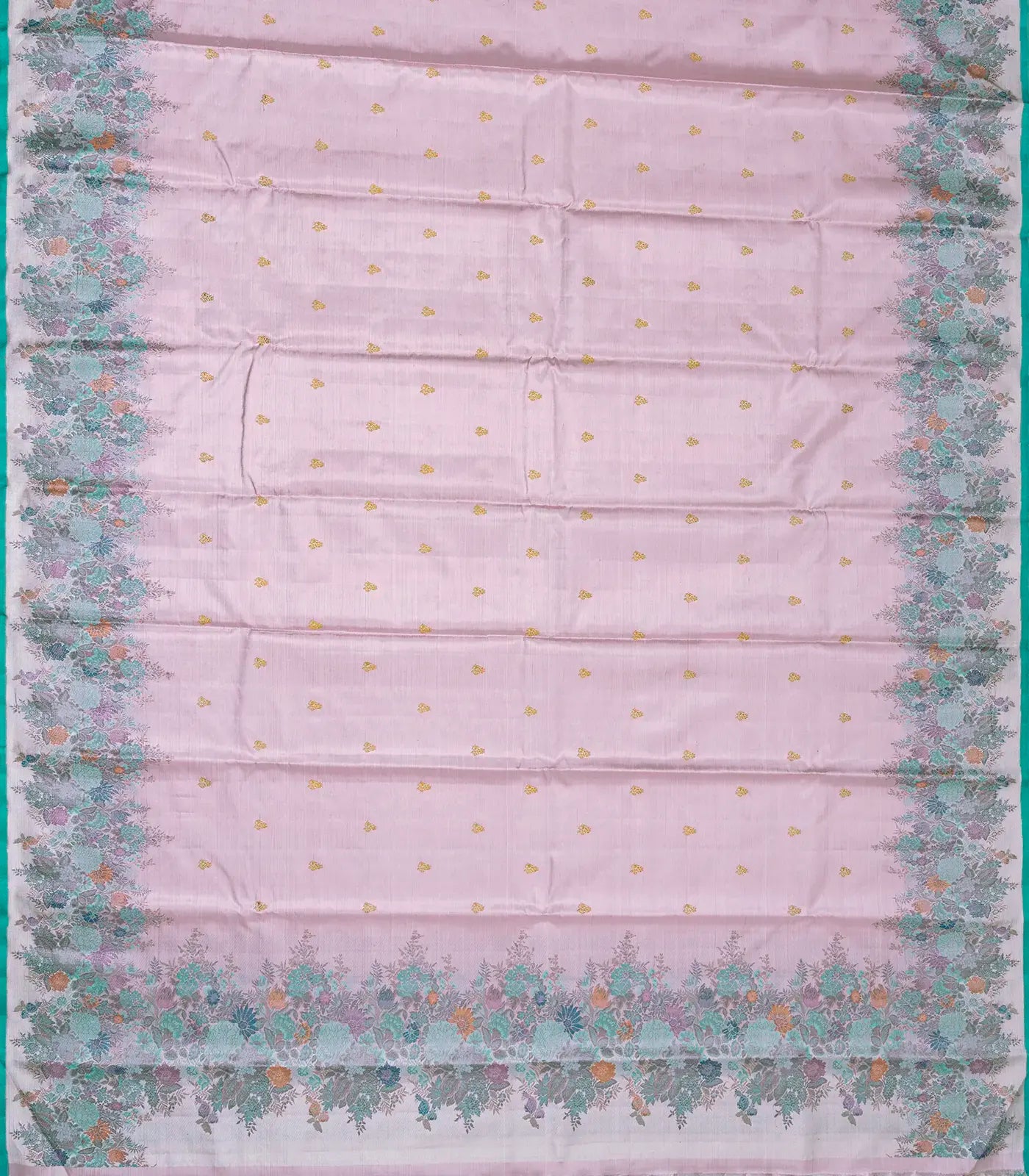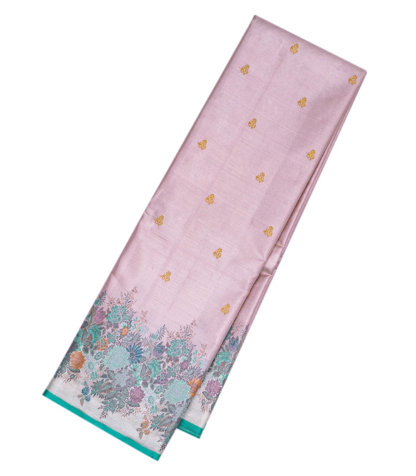 This handwoven kanchipuram tissue silk saree is filled with floral zari buttas in off white body along with meena floral motifs in running style border and pallu