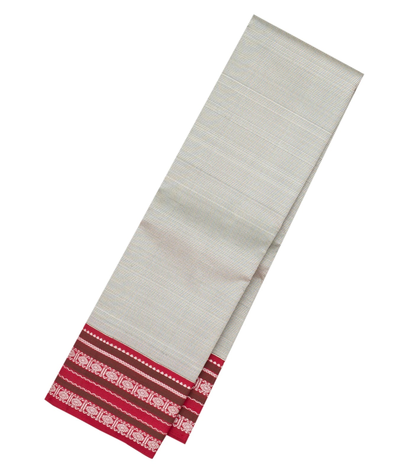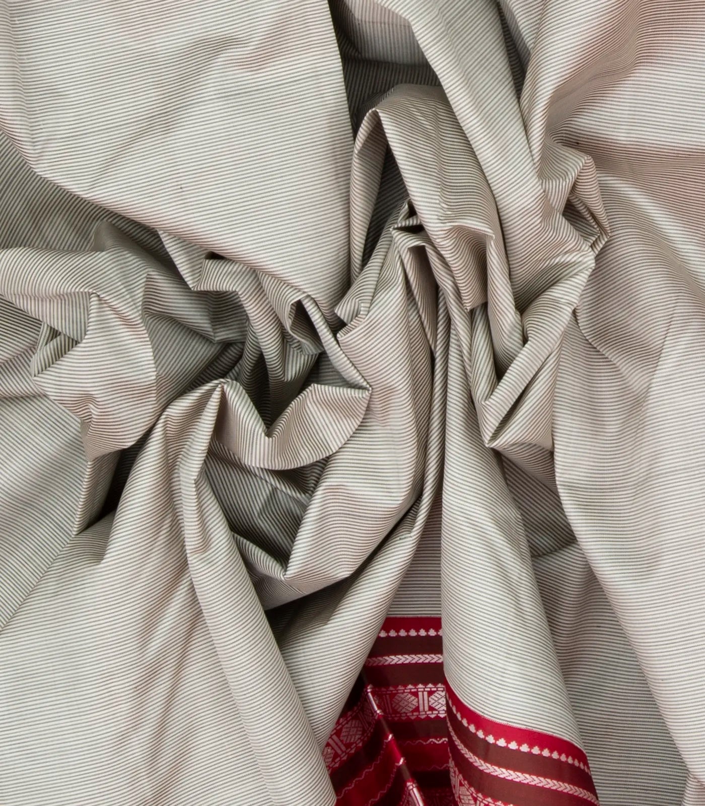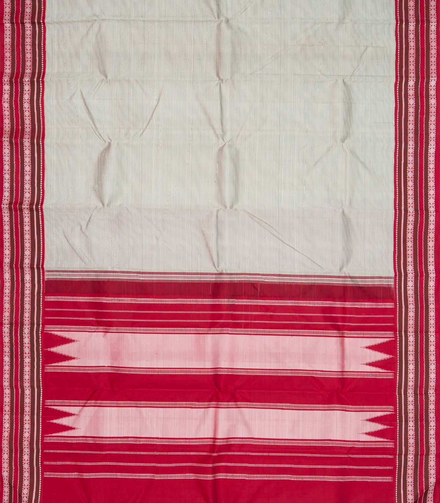 This handwoven korvai kanchipuram silk saree is filled with black stripes in off white body along with contrast crimson threadwork border and pallu