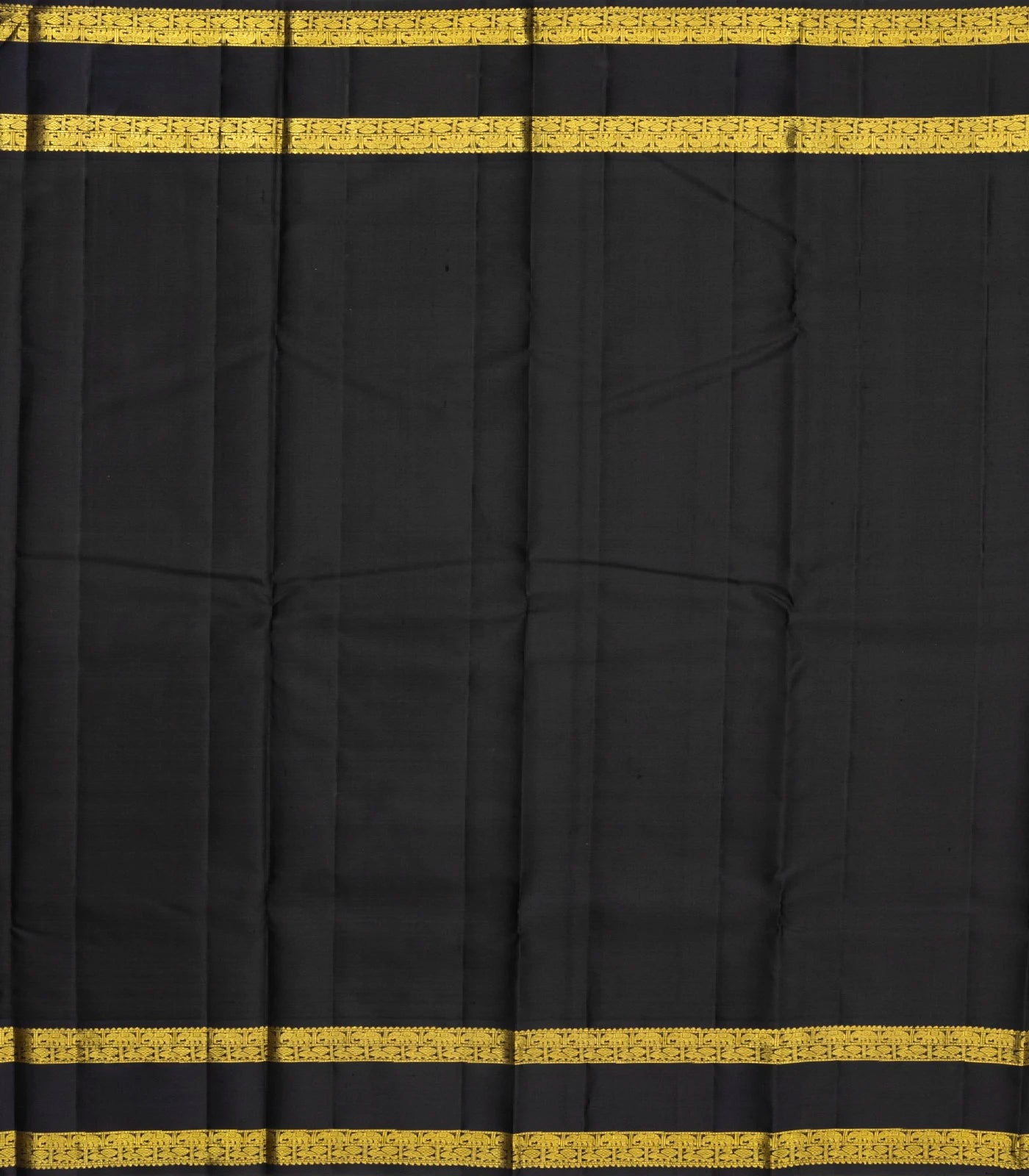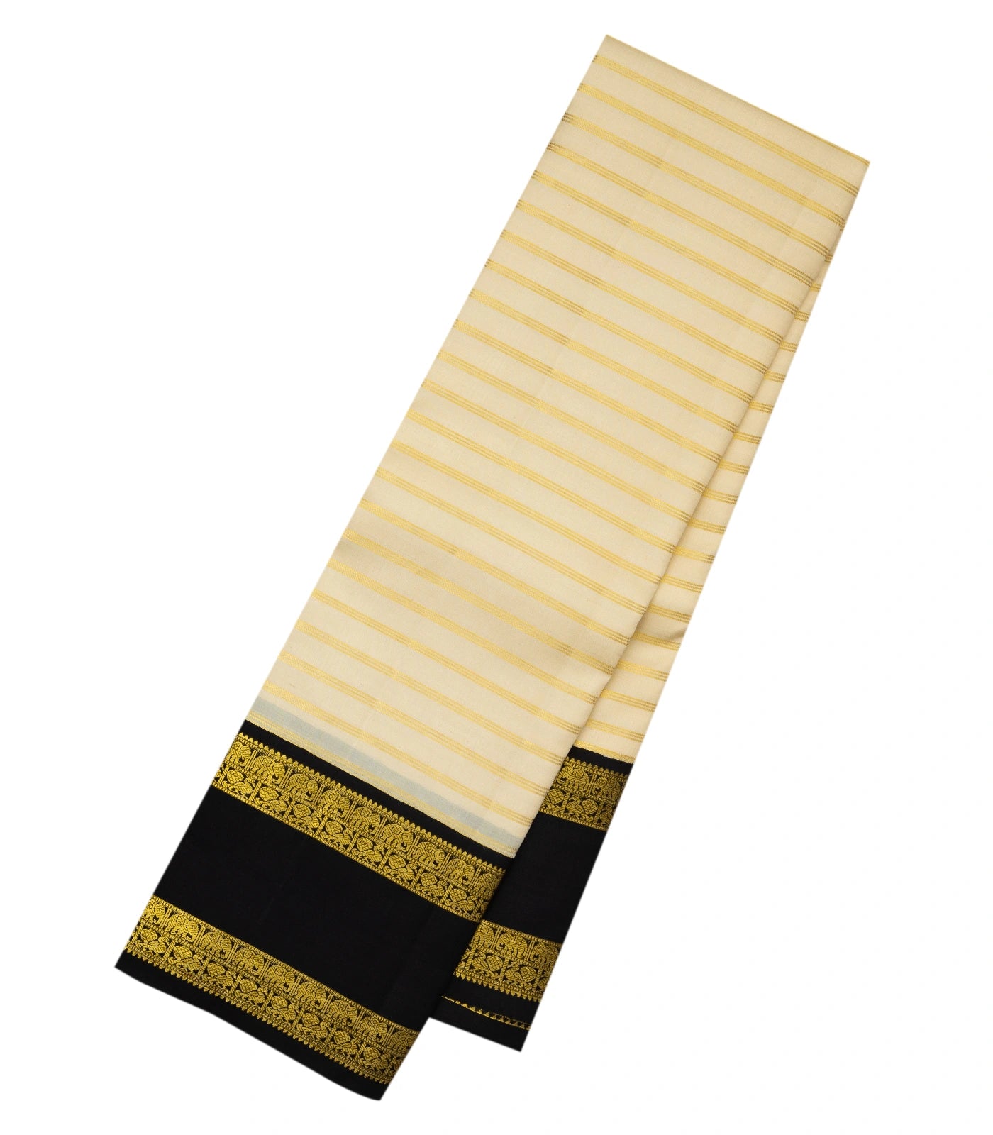 This handwoven korvai kanchipuram silk saree is filled with zari stripes in off white body along with elephant motifs in contrast black zari border and pallu
