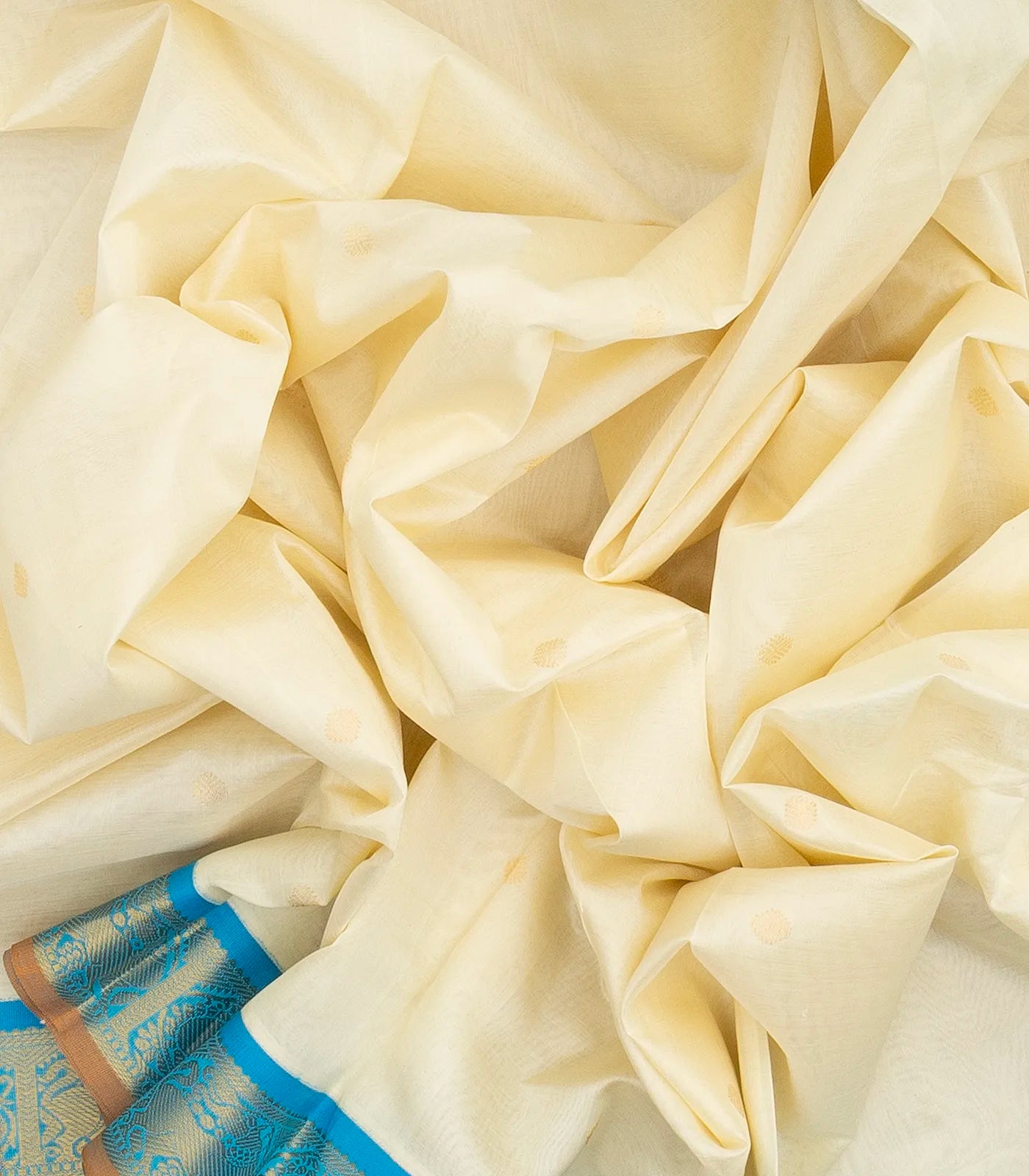 This handwoven korvai silk cotton saree is filled with buttas in off white body along with contrast border and pallu