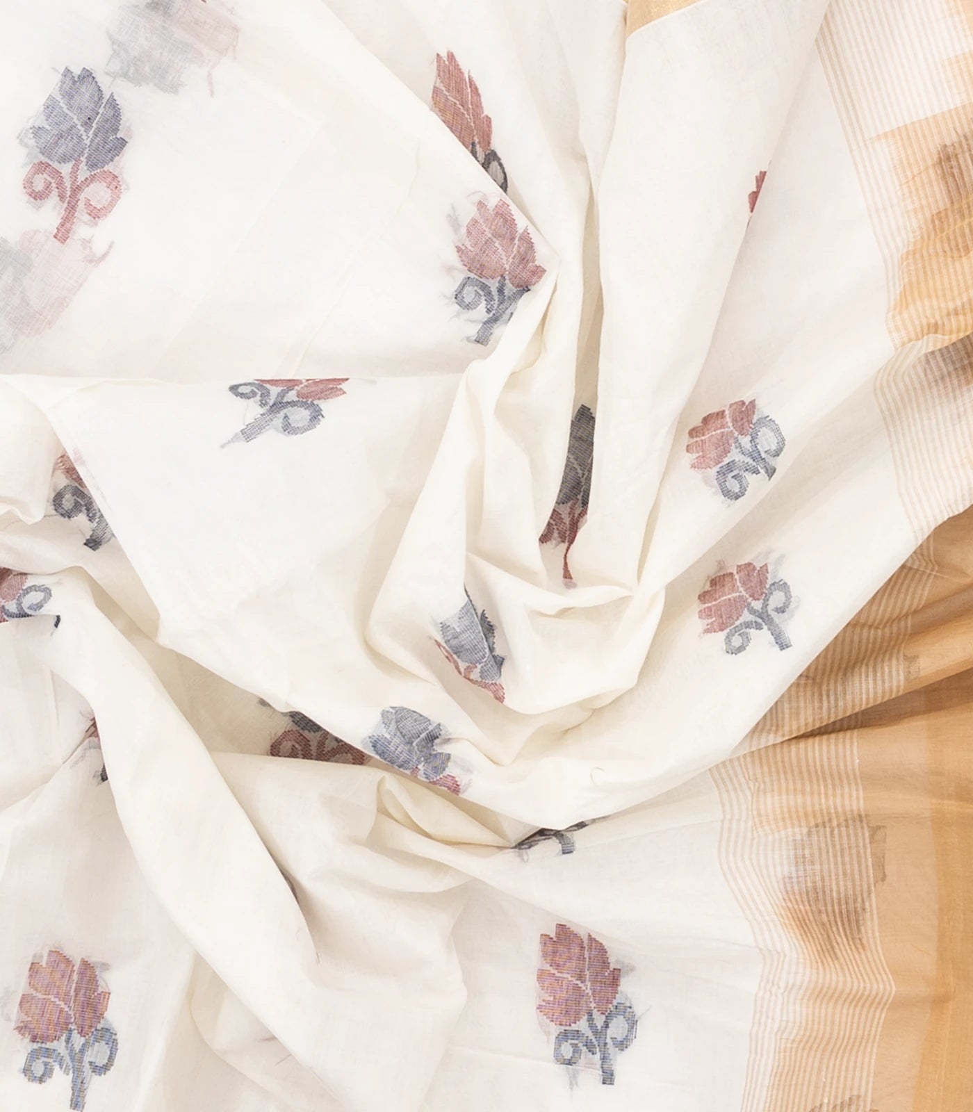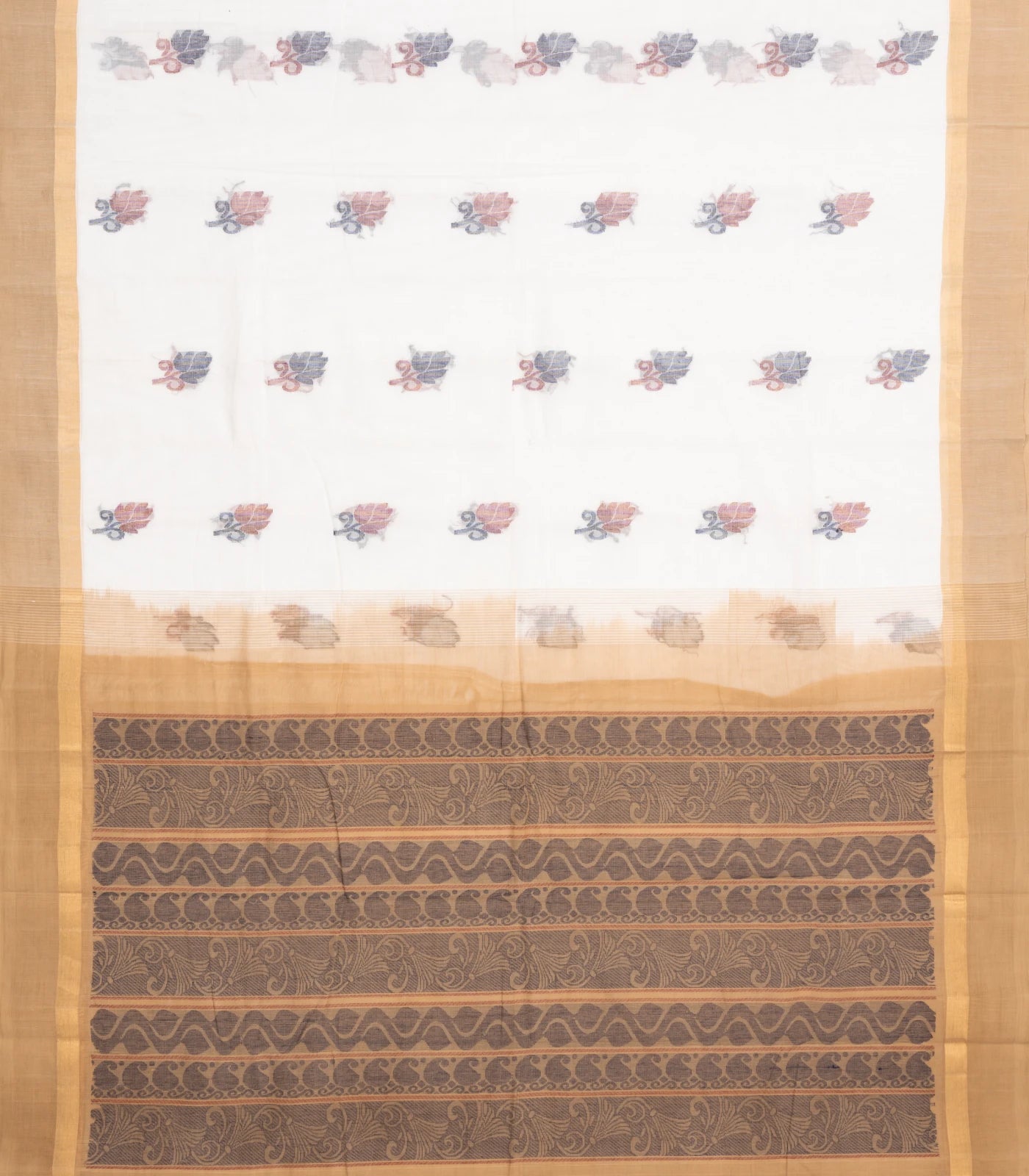 This handwoven rasipuram cotton saree is filled with floral buttas in off white body along with contrast border and pallu