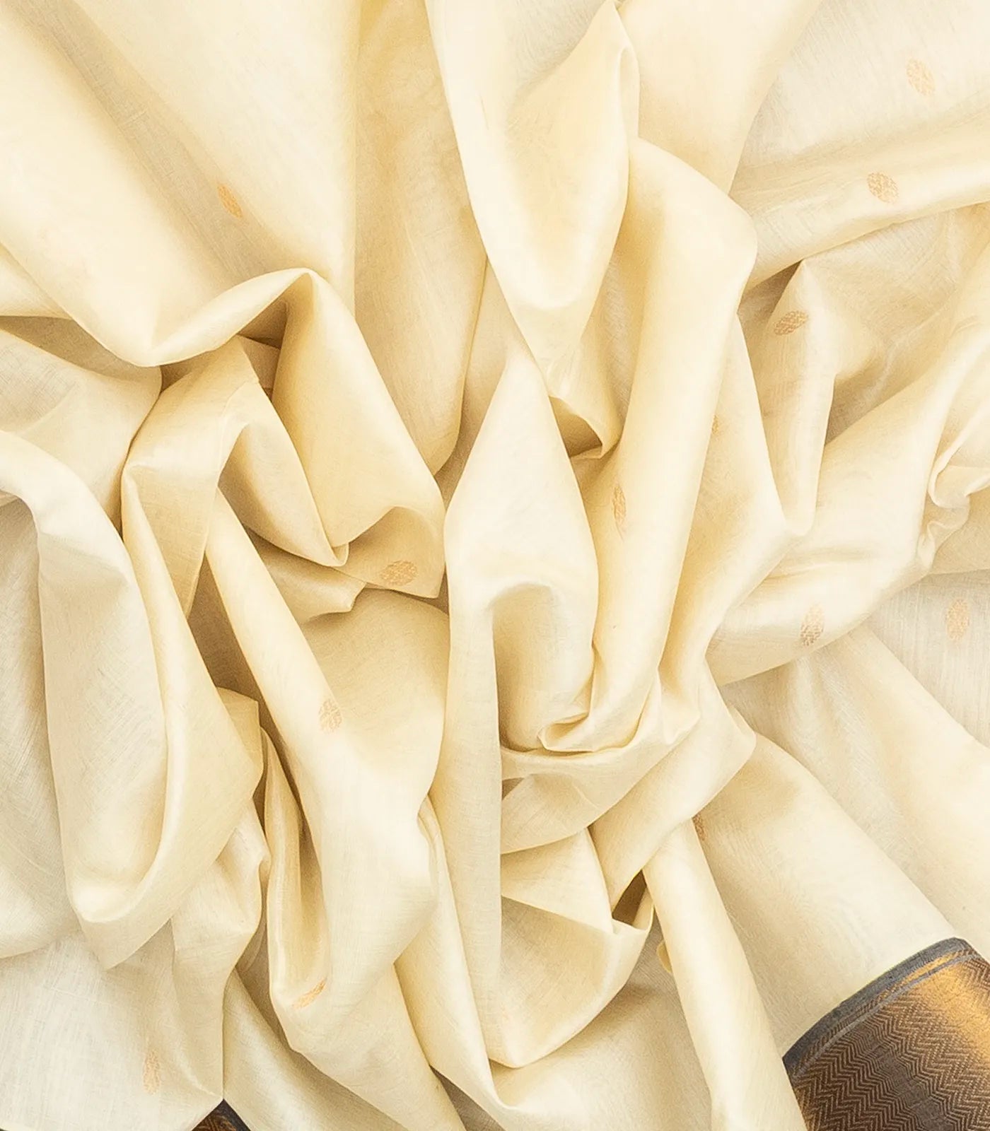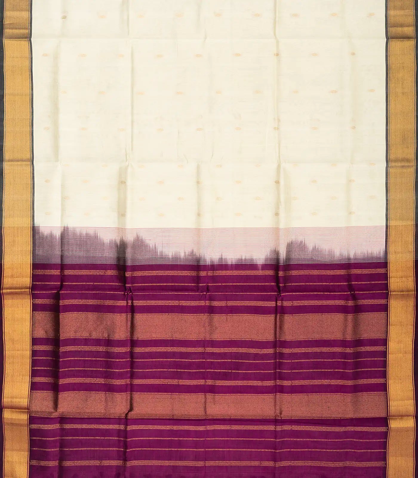 This handwoven silk cotton saree is filled with plain off white body along with contrast zari border and pallu