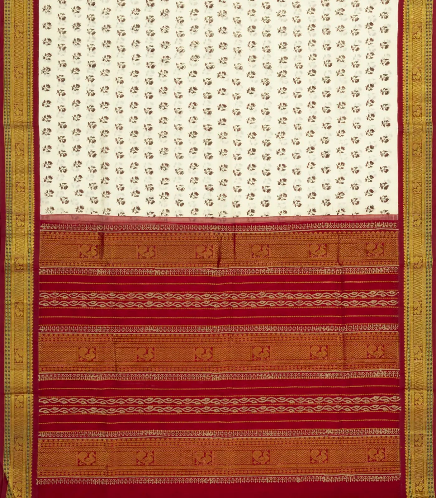This handwoven silk cotton saree is filled with printed floral motifs in off white body along with contrast border and pallu
