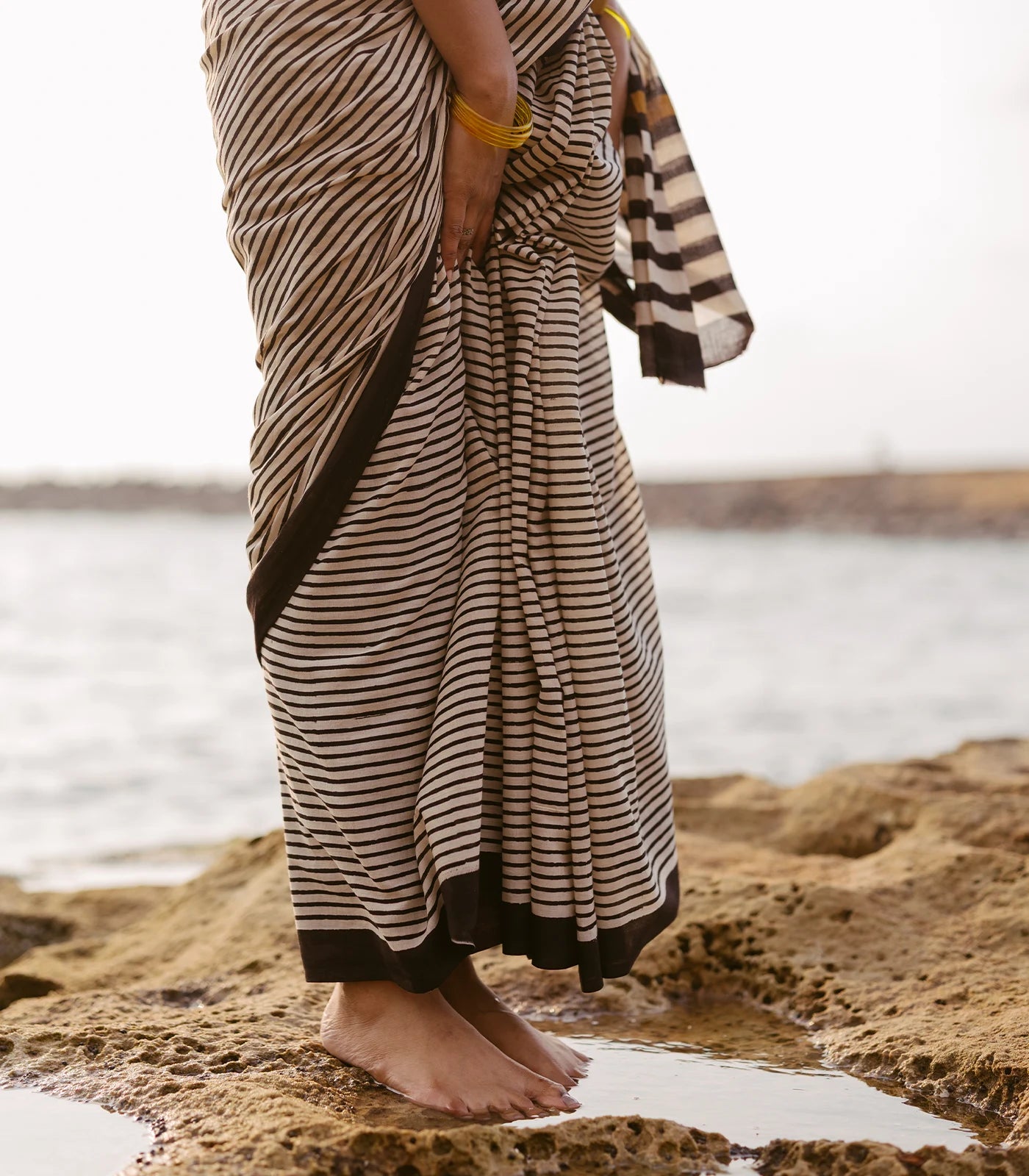 This printed jaipur cotton saree is filled with black stripes in off white body along with border and pallu-JC1572