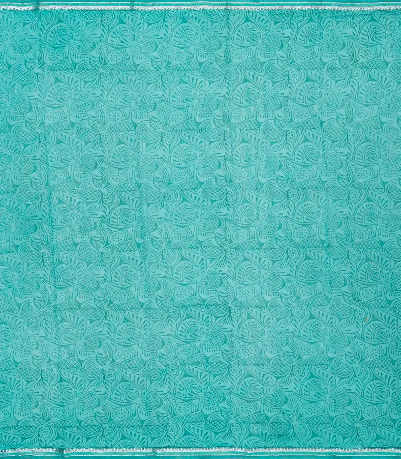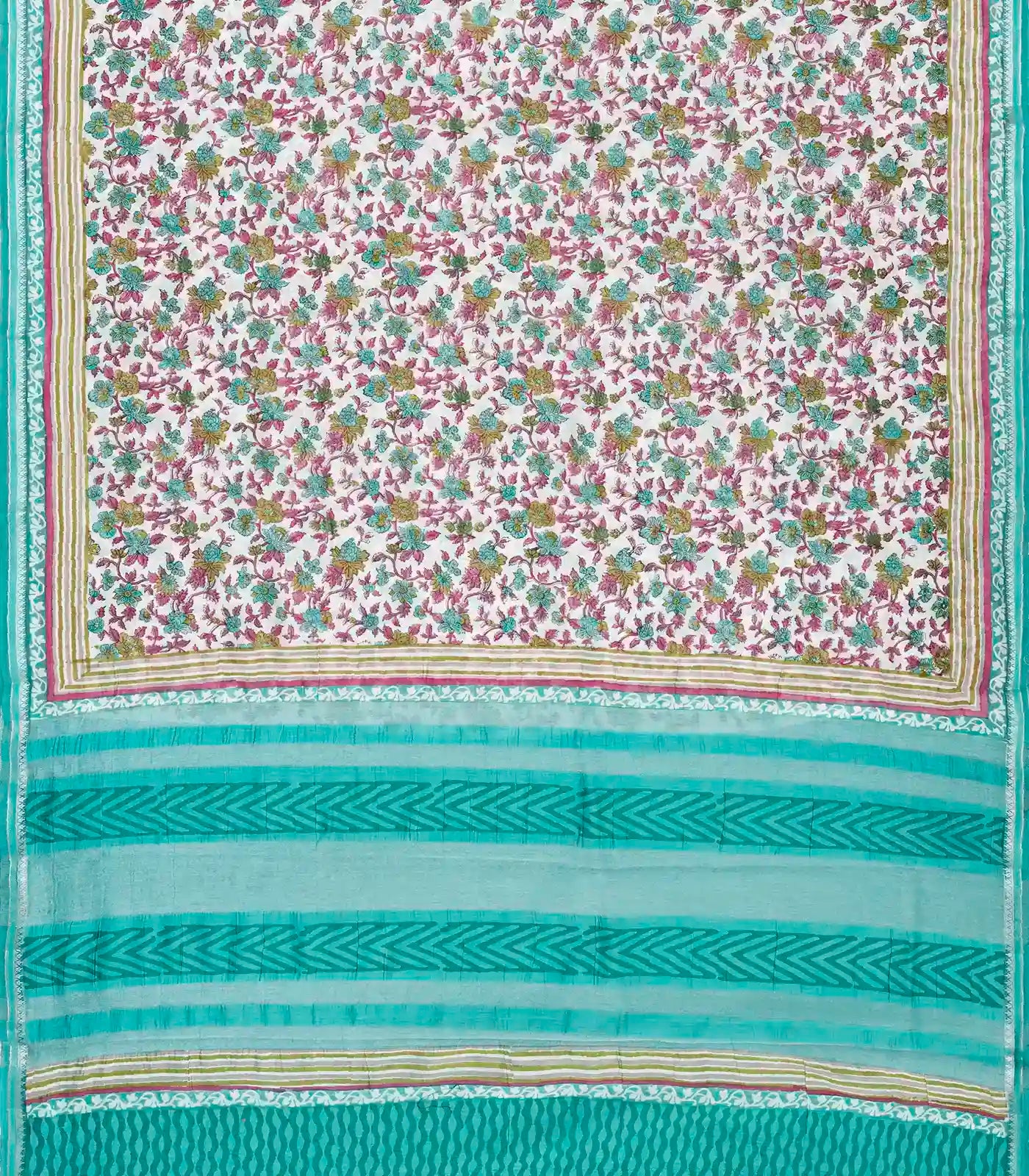 This woven chanderi cotton saree is printed with aquamarine floral motifs in off white body along with contrast border and pallu