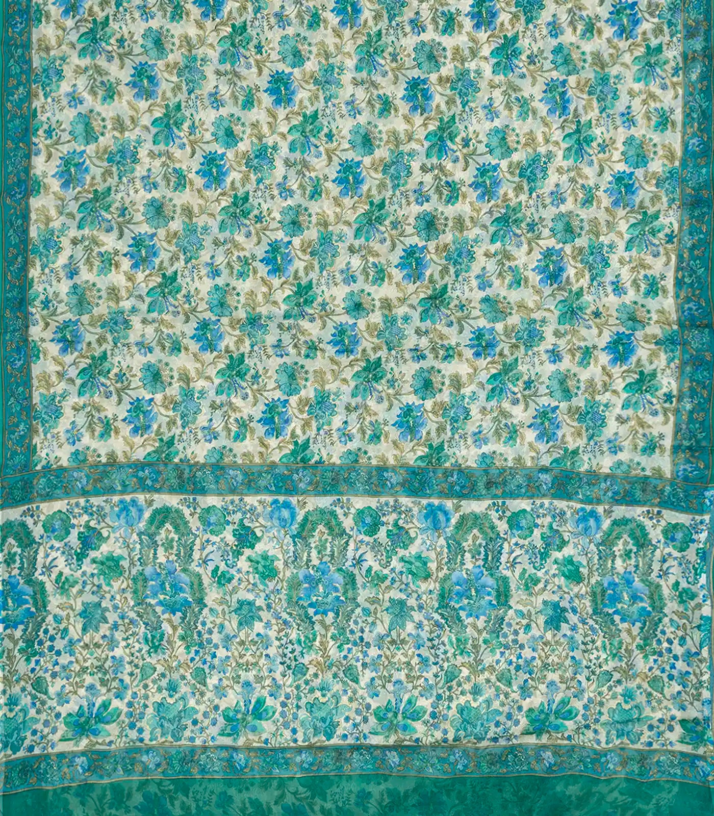 This woven chiffon silk saree is printed with floral motifs in off white body along with border and pallu