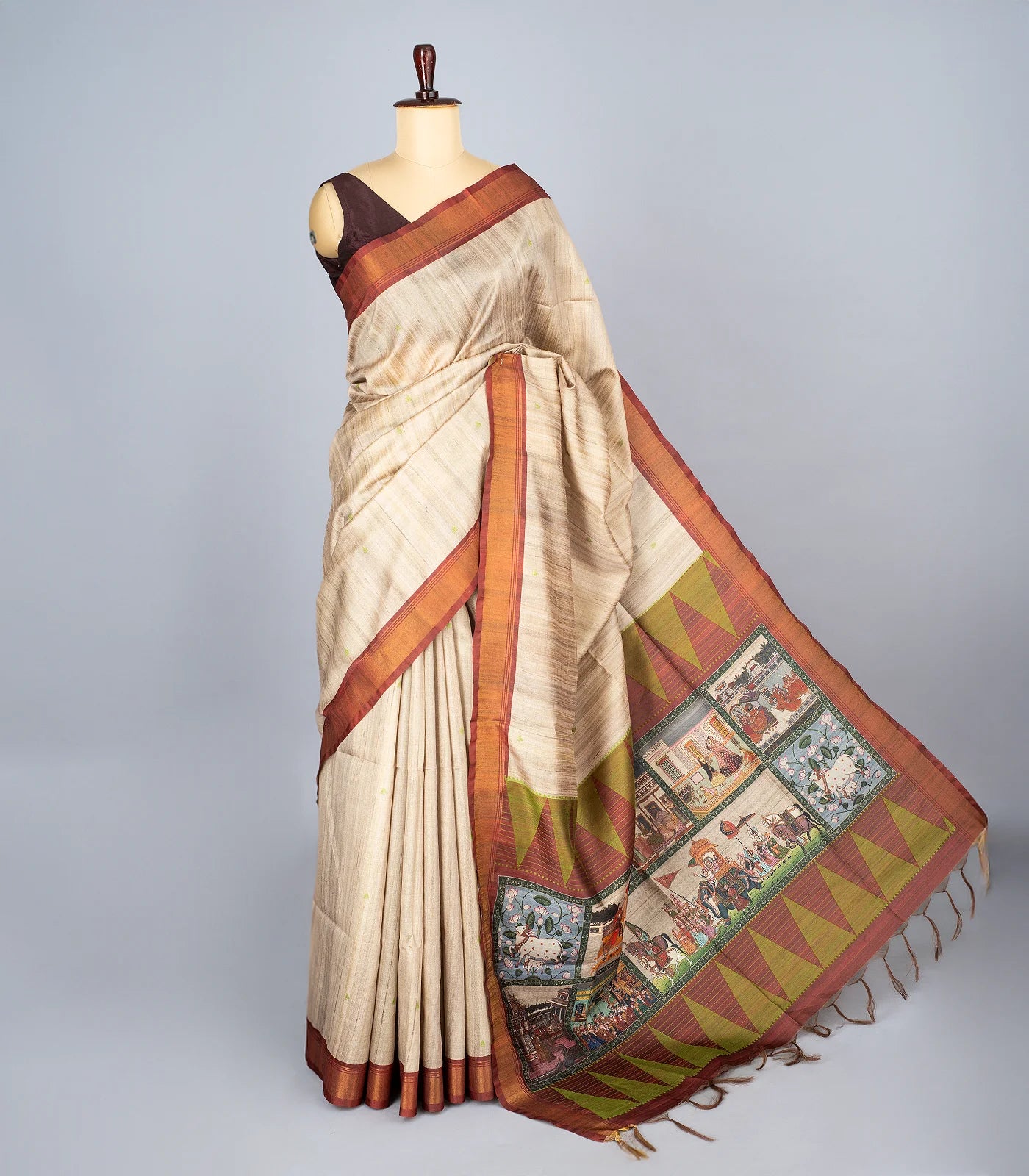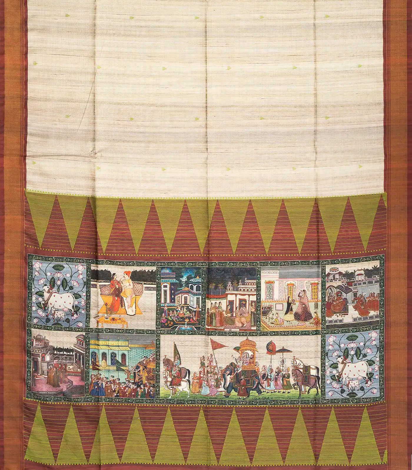 Off White Woven Synthetic Dupion Saree With Printed Paintings In Pallu-BL4292
