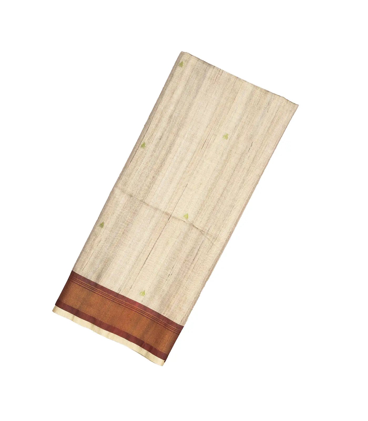 This woven synthetic dupion saree is filled with plain off white body along with border and printed mughal paintings in pallu