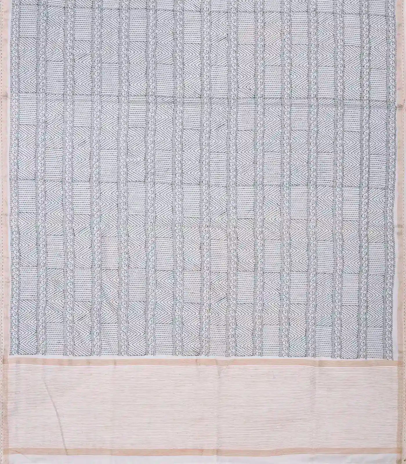 This woven synthetic tussar saree is filled with embroidered chevron motifs in off white body along with pallu