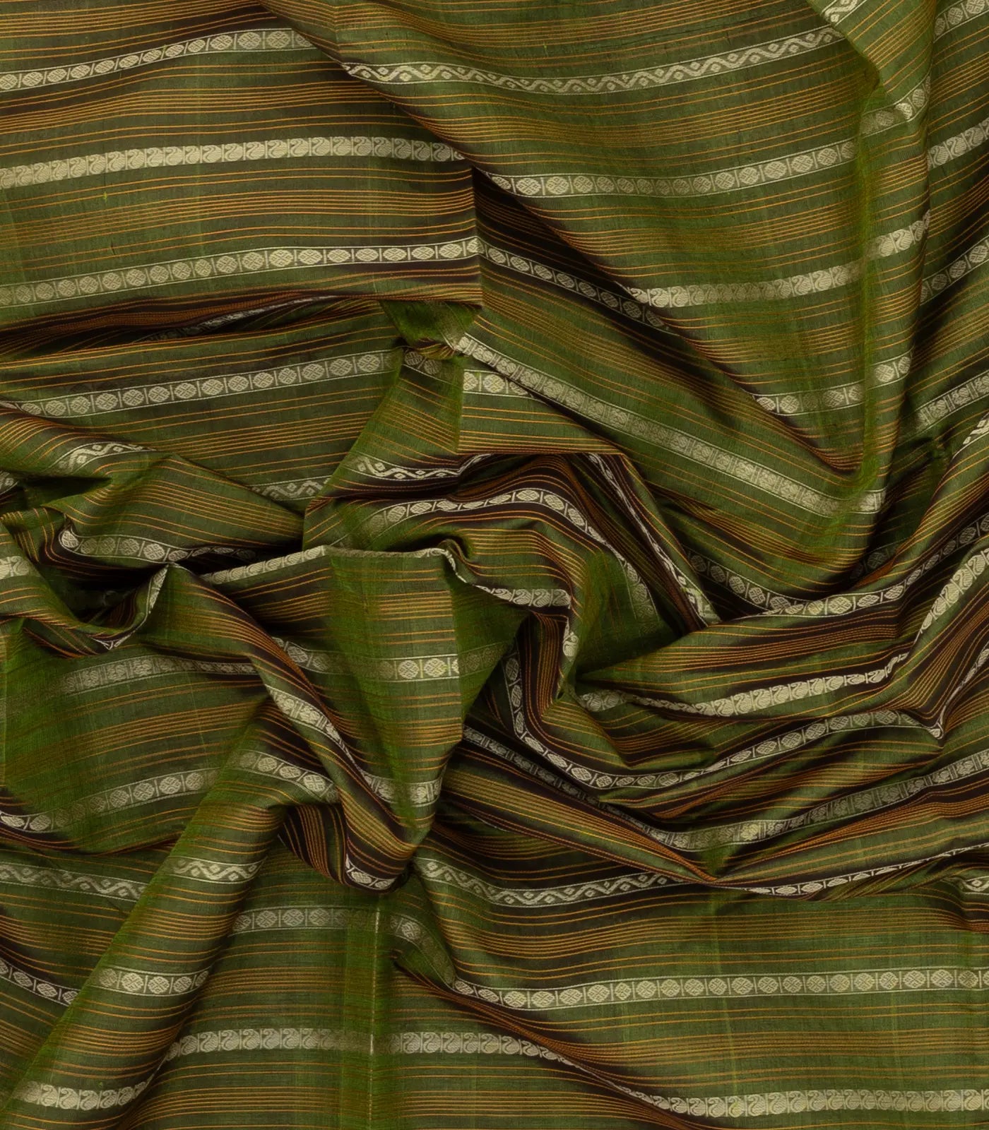 This handwoven silk cotton saree is filled with stripes in olive green body along with contrast border and pallu