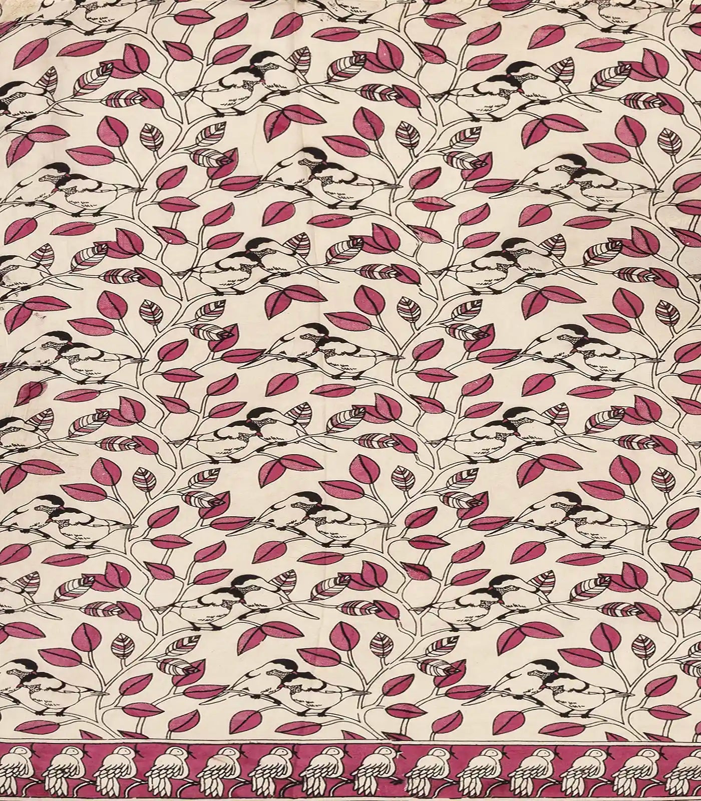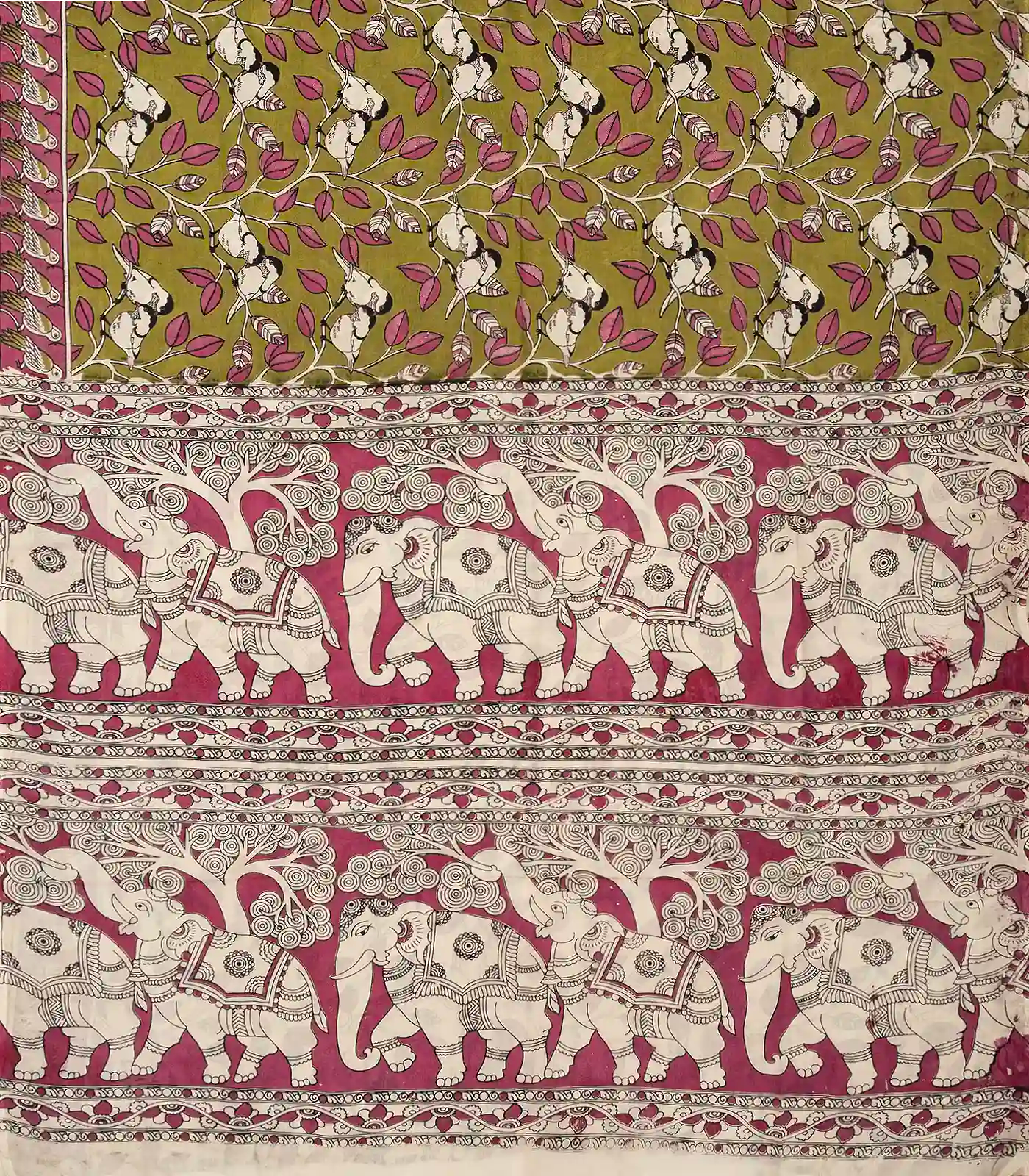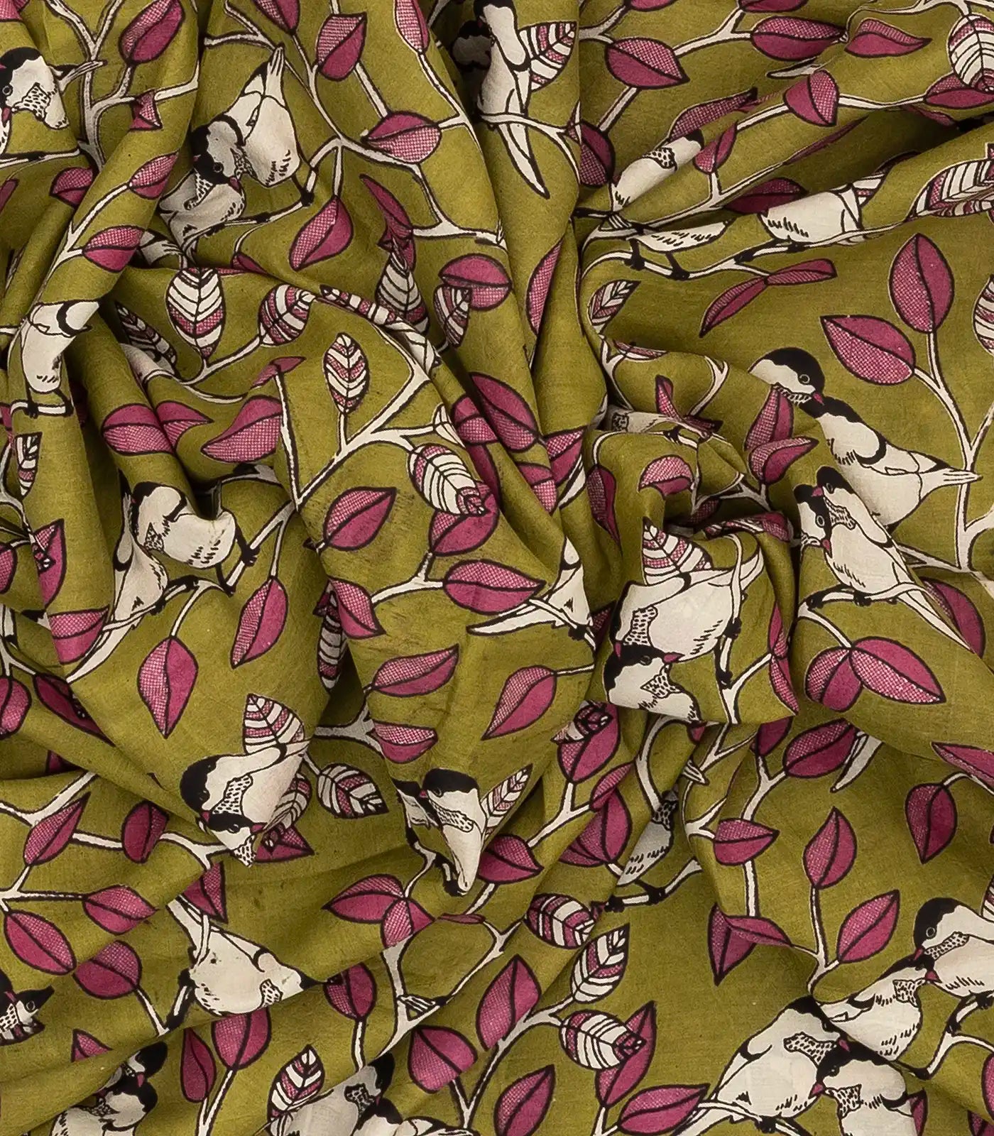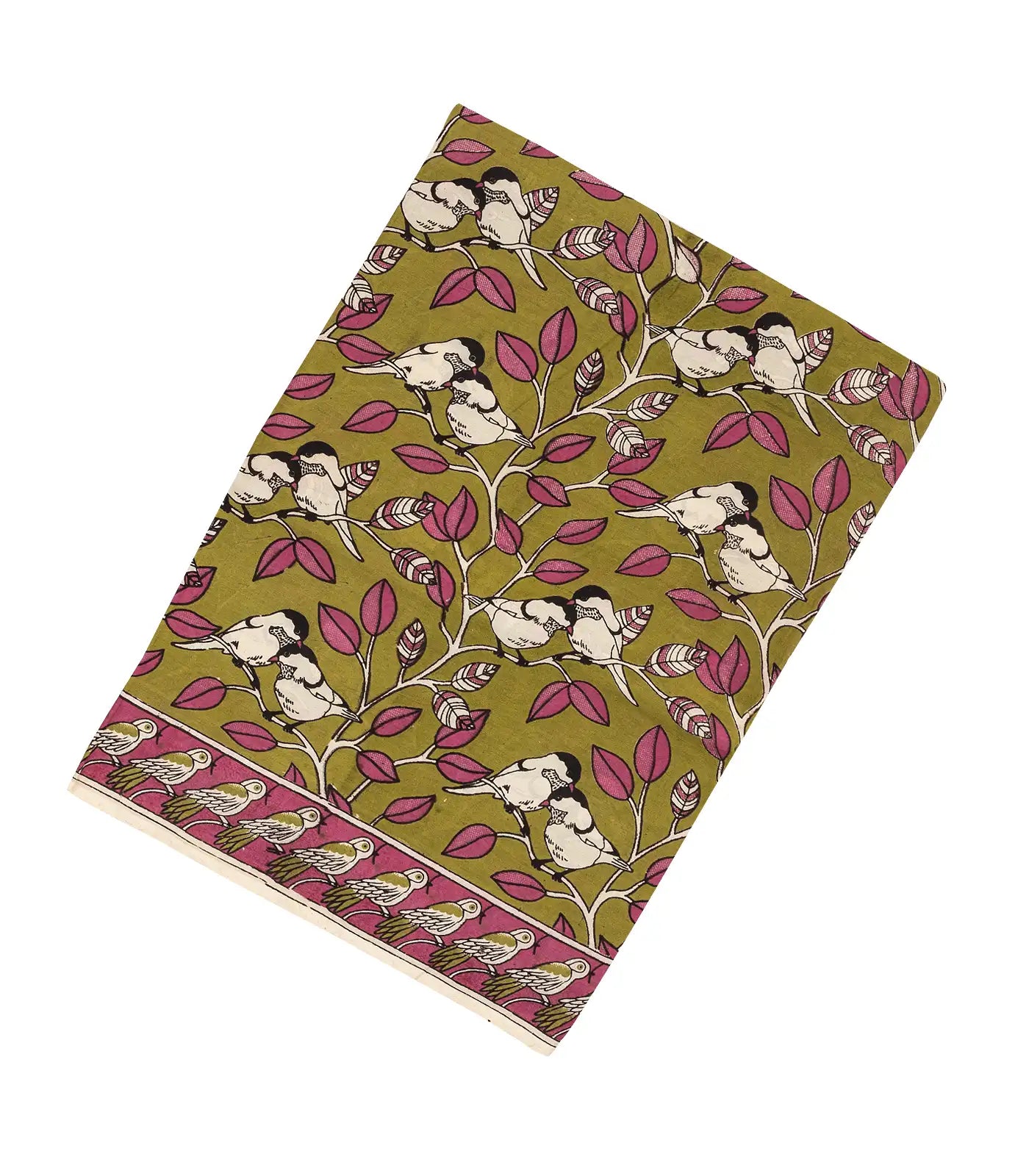 This woven kalamkari blended silk saree is filled with printed bird motifs in olive green body along with border and pallu