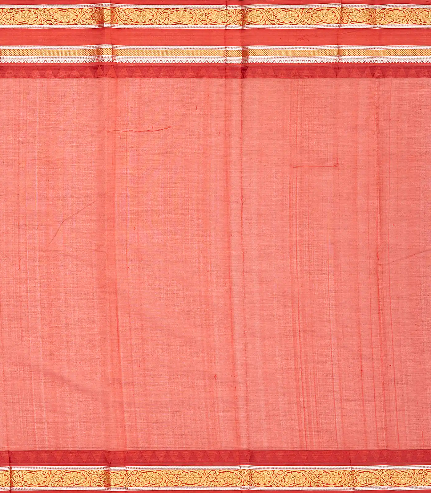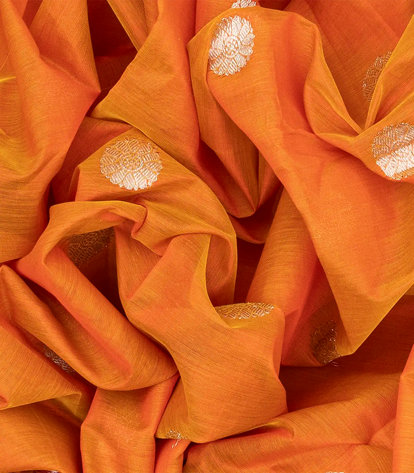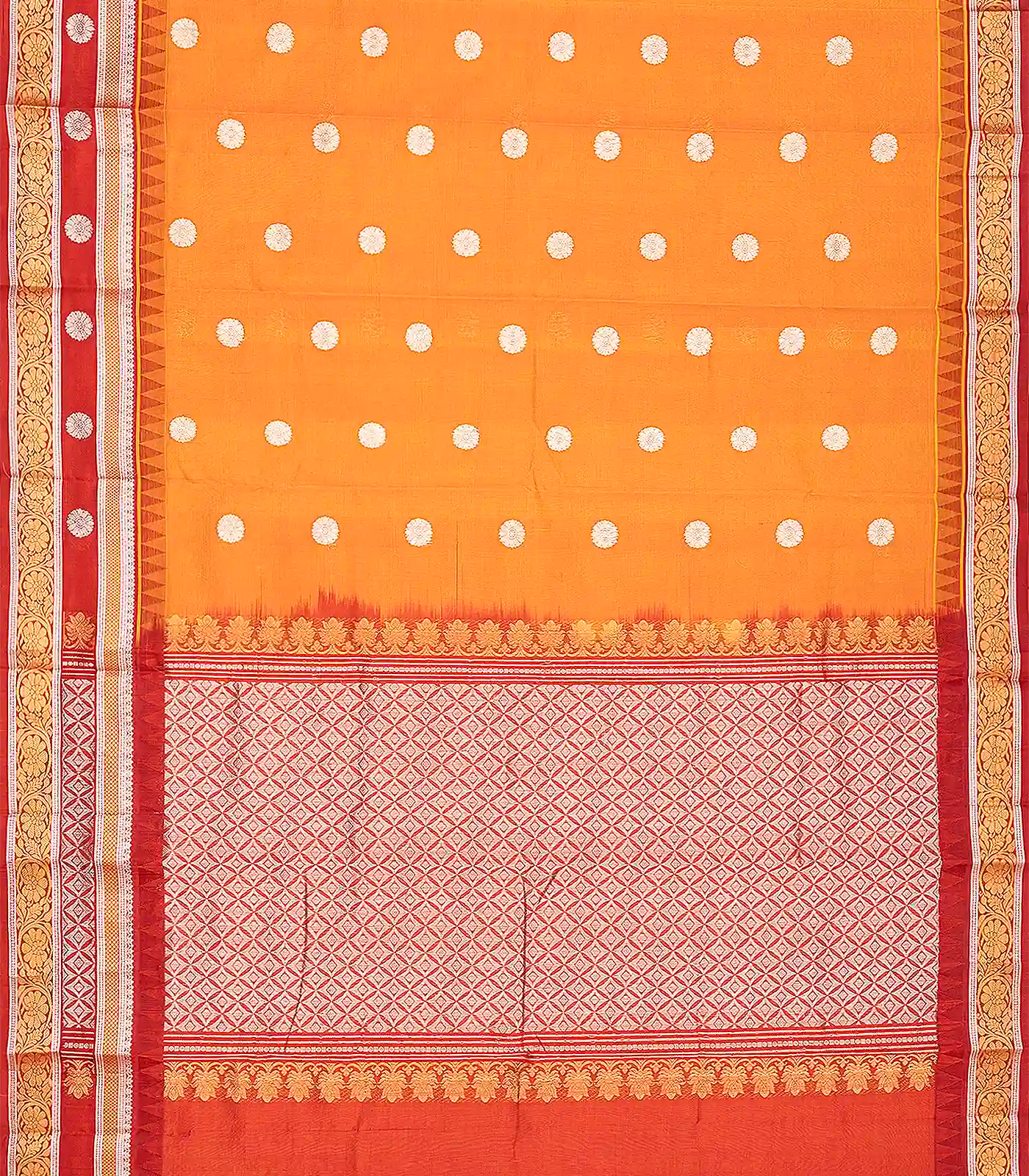 This handwoven chirala silk cotton saree with kamalam buttas in orange body along with contrast red border and pallu
