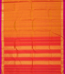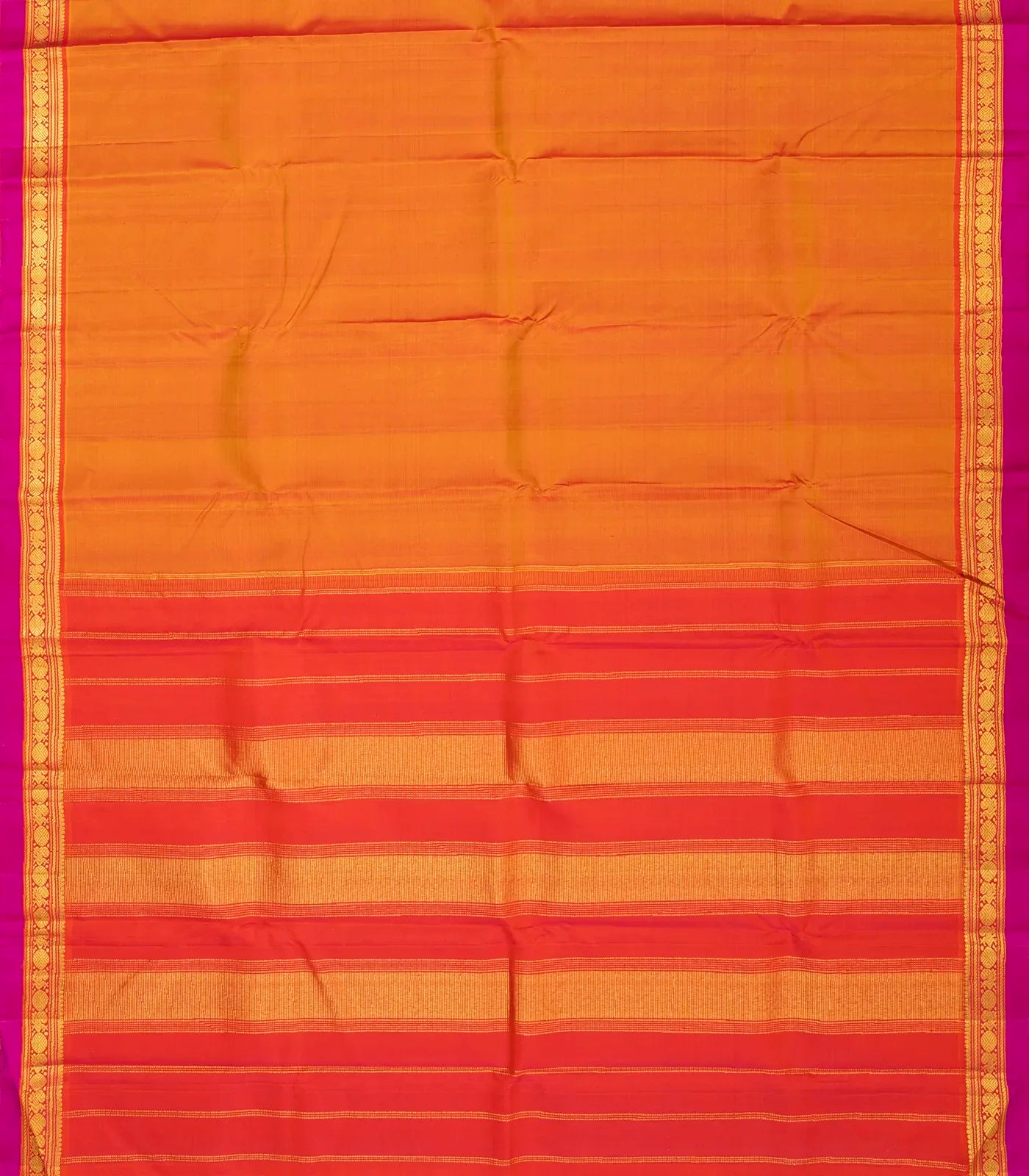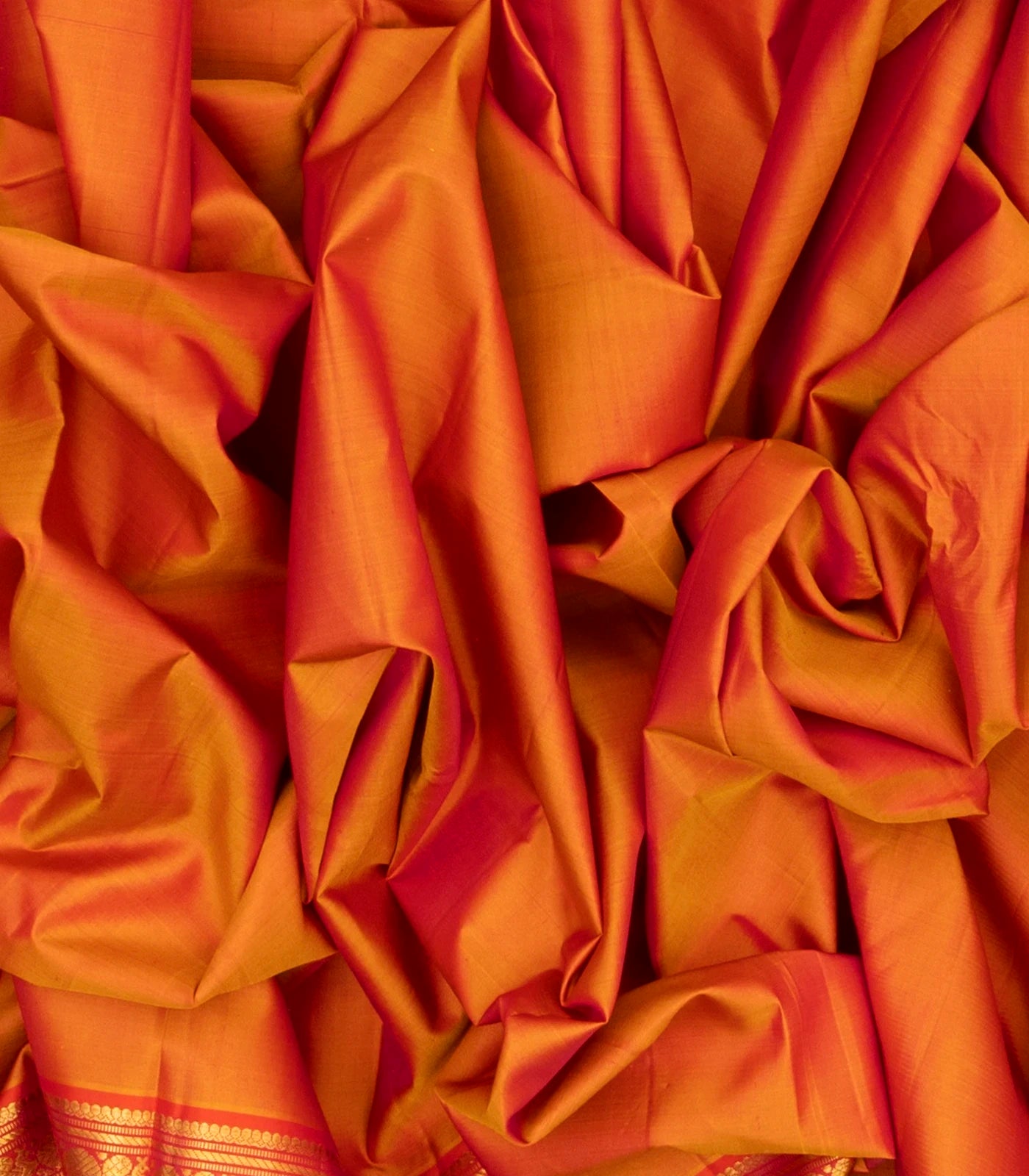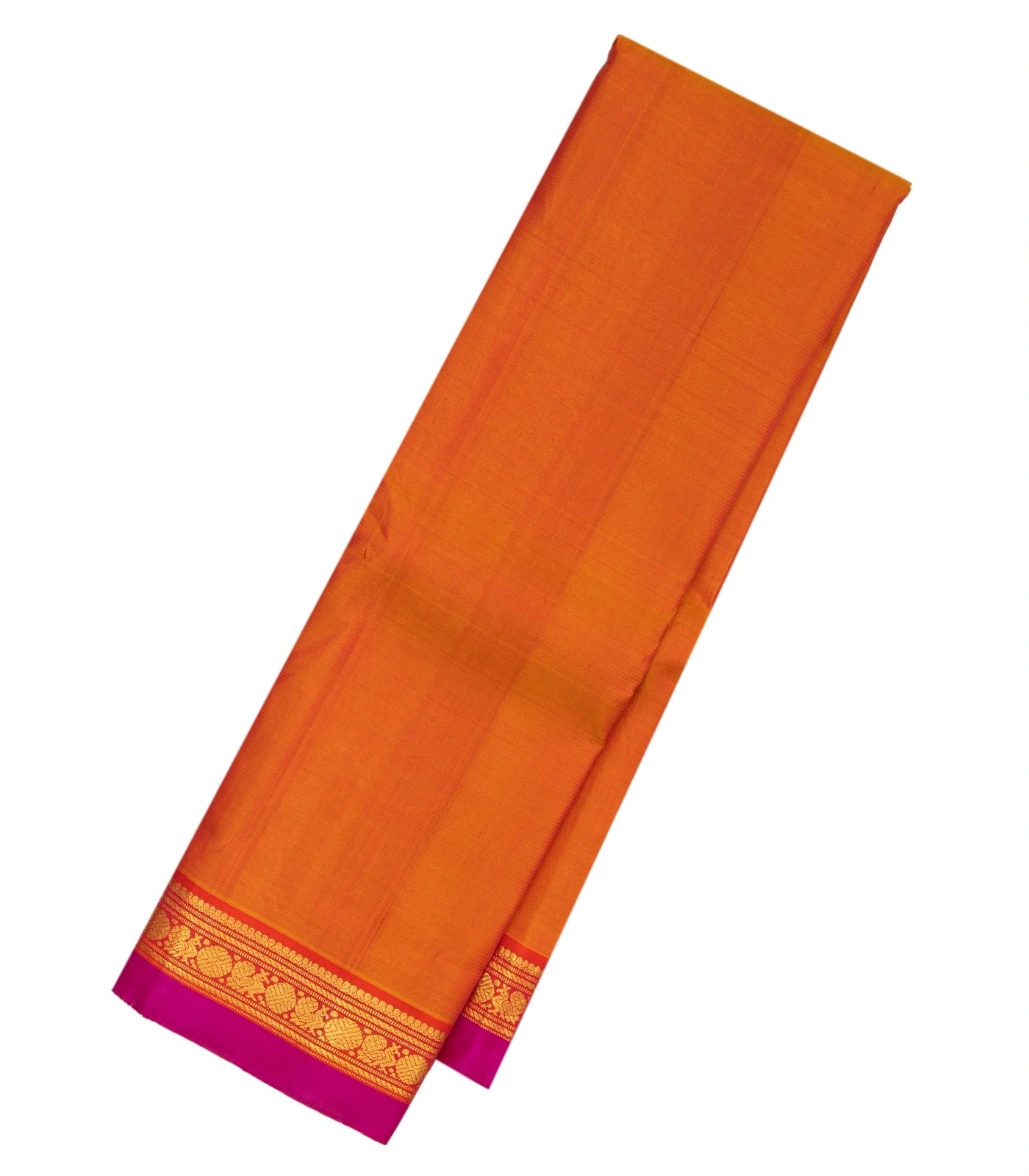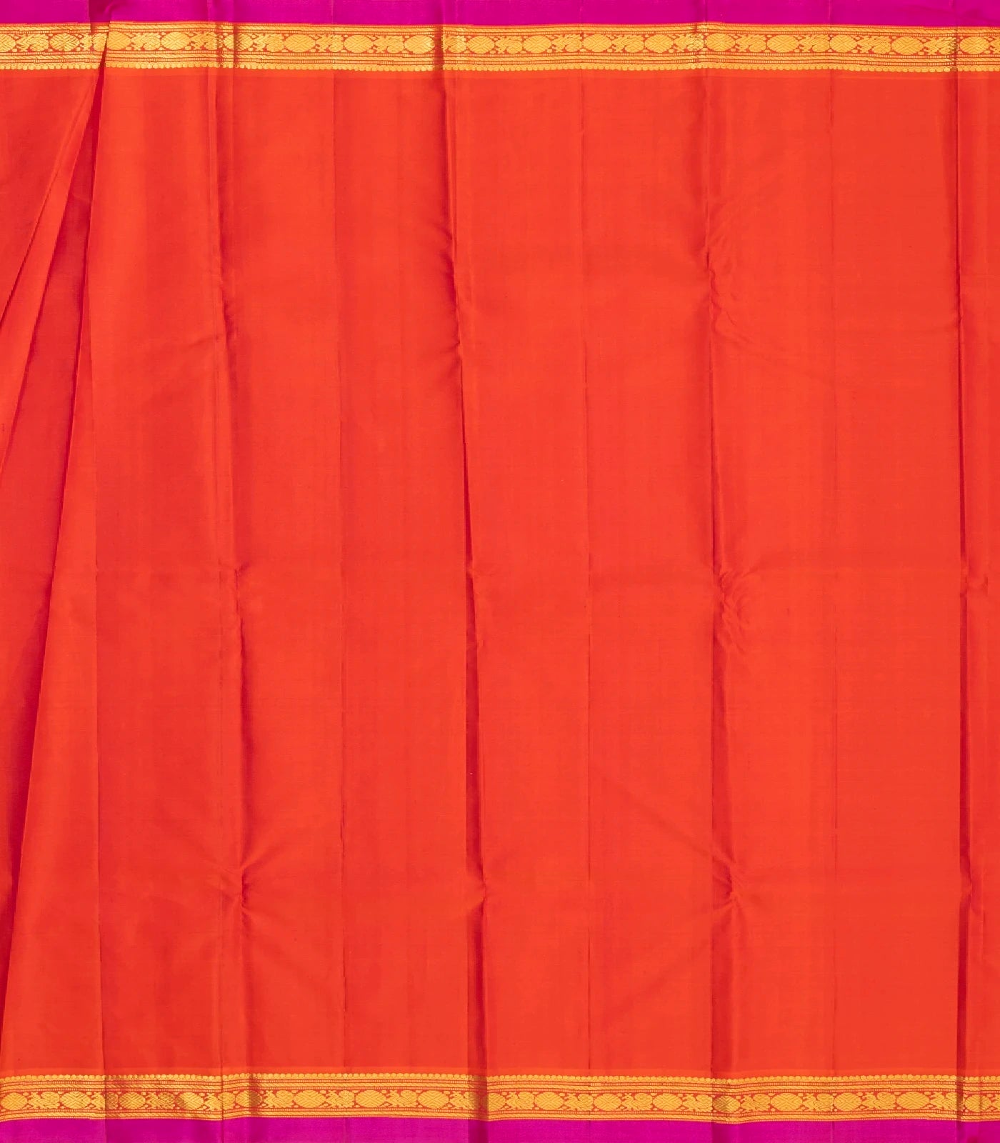 This handwoven kanchipuram silk saree is filled with plain orange body along with contrast border and pallu