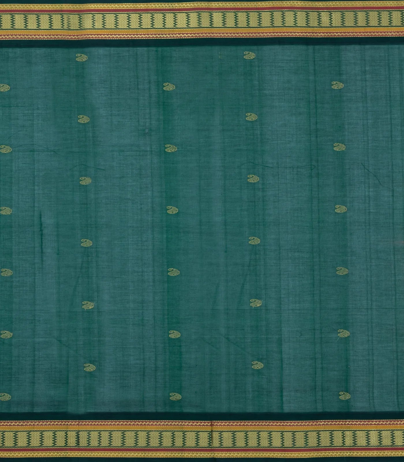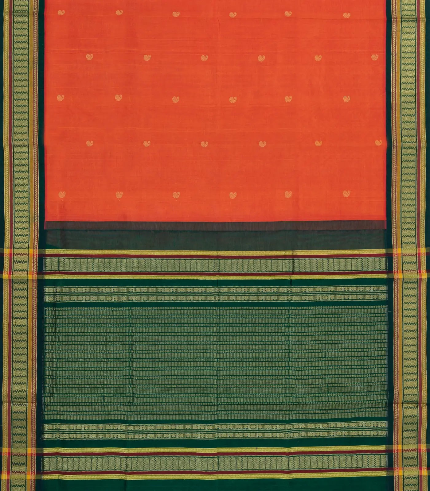 This handwoven silk cotton saree is filled with mango buttas in orange body along with contrast border and pallu