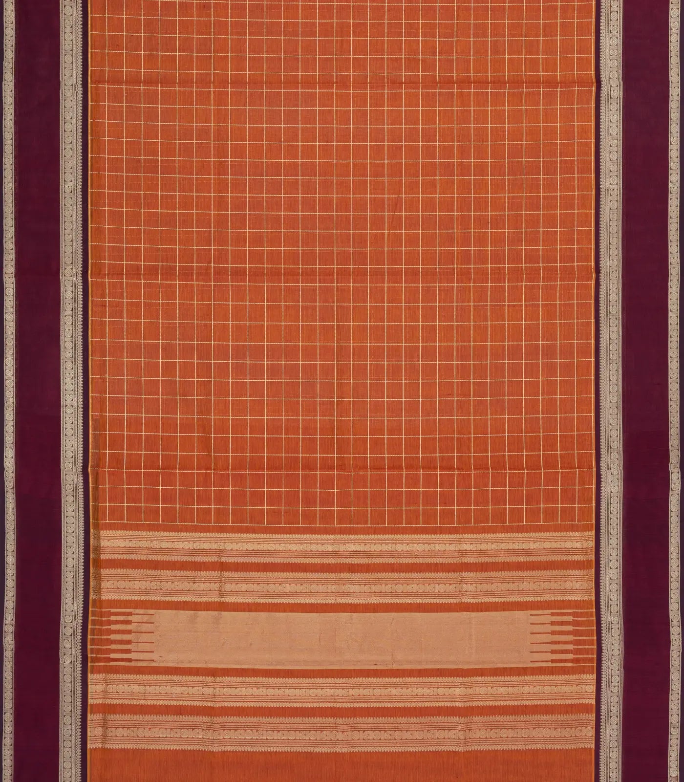 This handwoven silk cotton saree is filled with zari checks in orange body along with border and pallu-SC4218