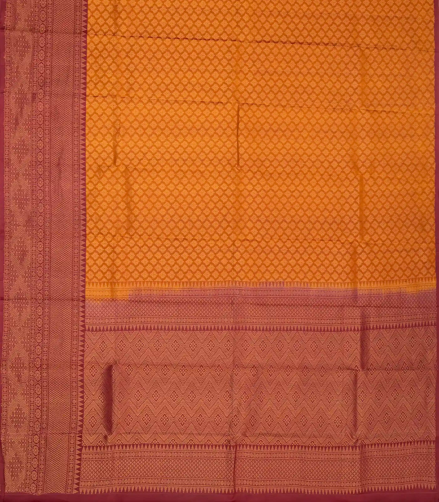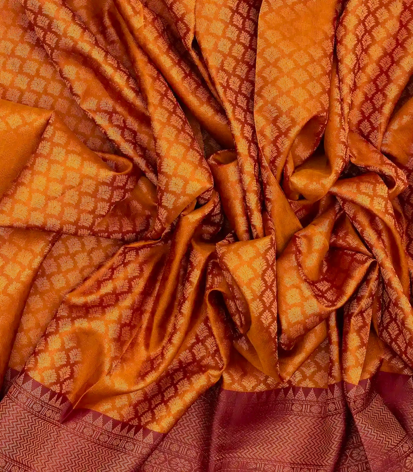 This handwoven soft silk saree is filled with floral motifs in orange body along with border and pallu