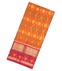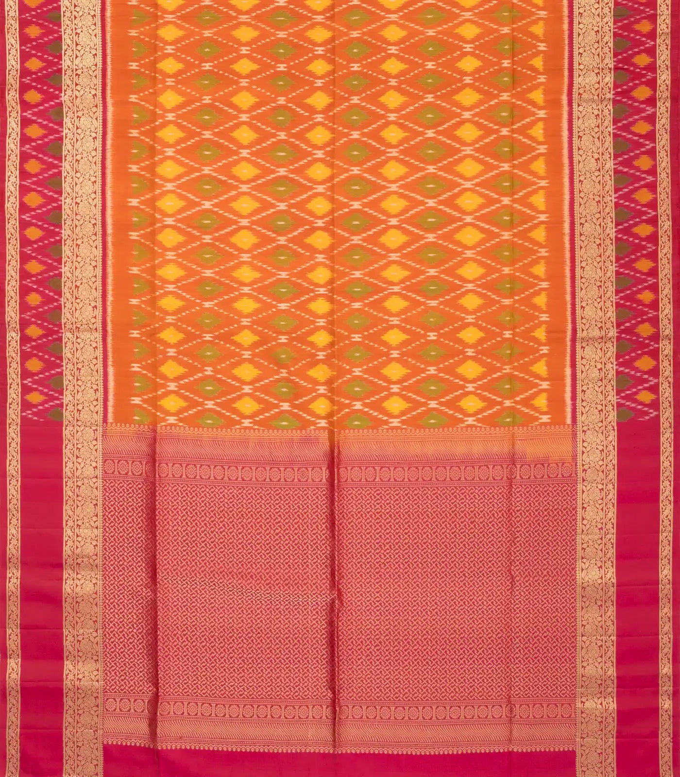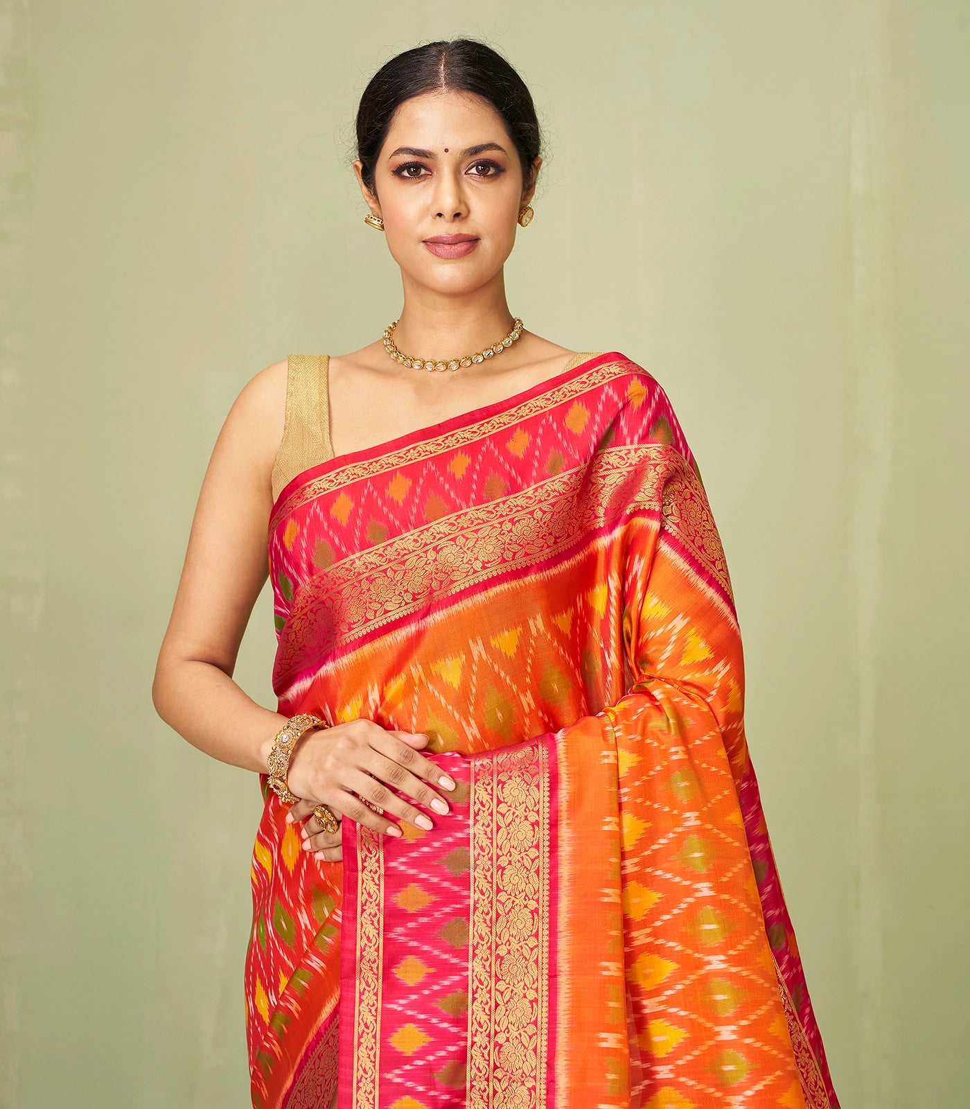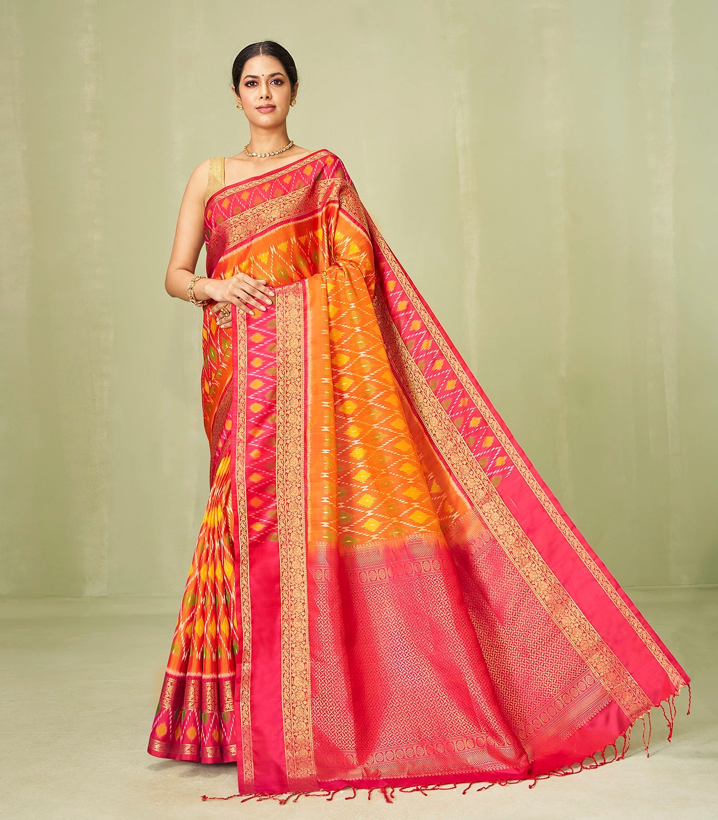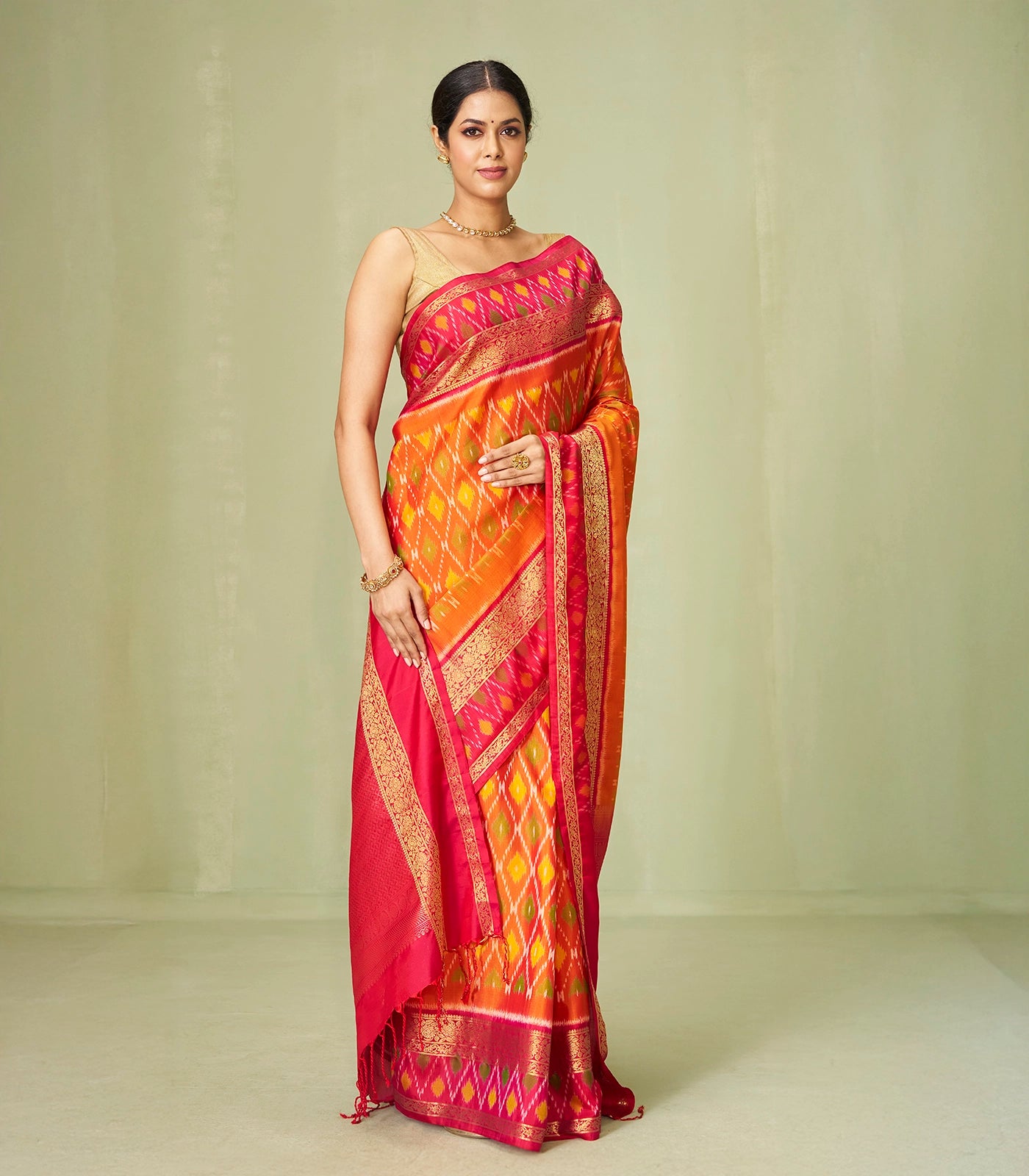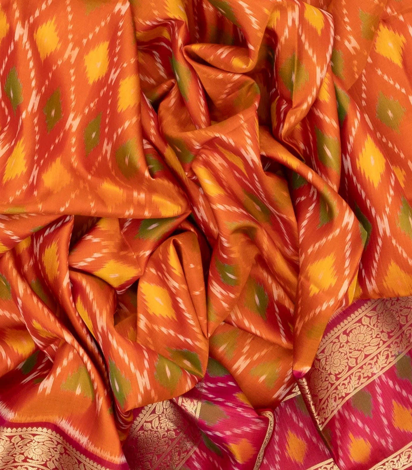 This handwoven soft silk saree is filled with printed tie & dye motifs in orange body along with contrast zari border and pallu