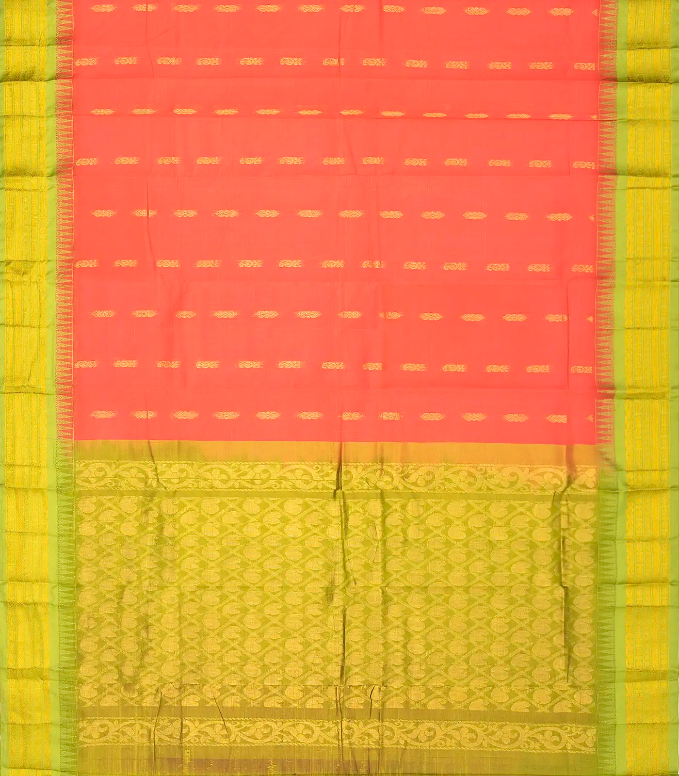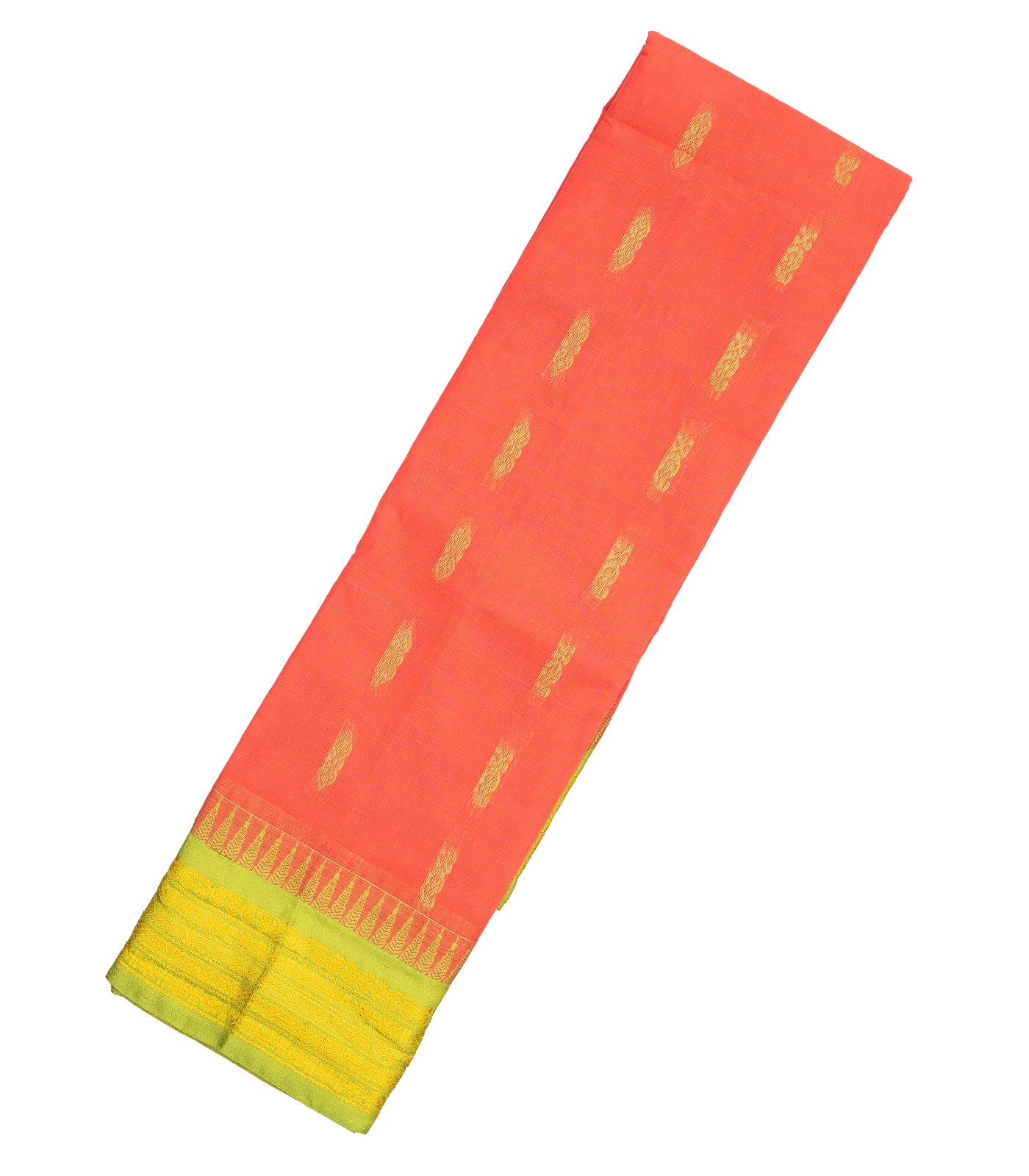 This woven chirala cotton saree is filled with zari buttas in orange body along with contrast temple border and pallu