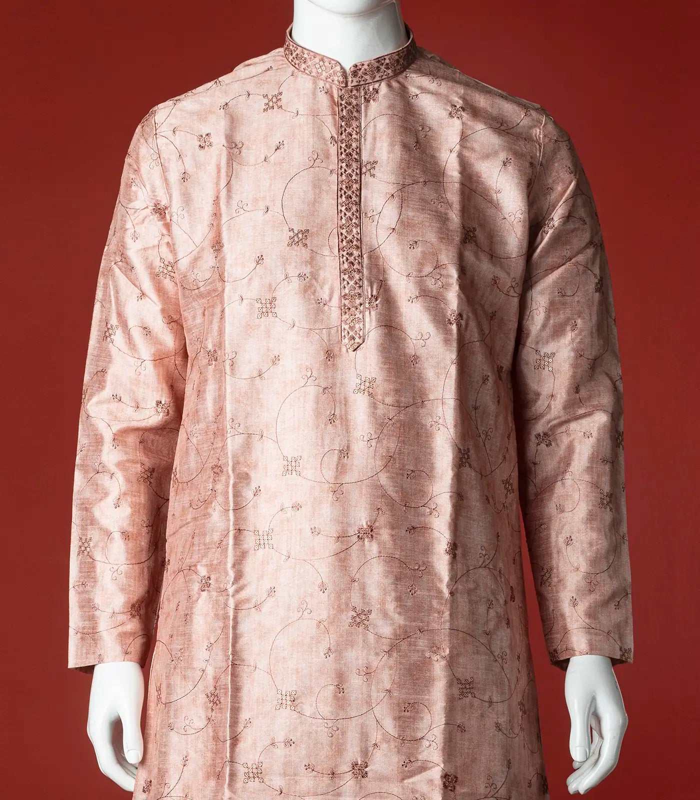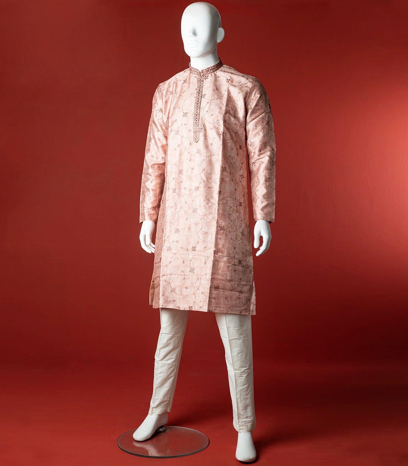 Peach Floral Embroidered Kurta With White Straight Fit Pants-Peach