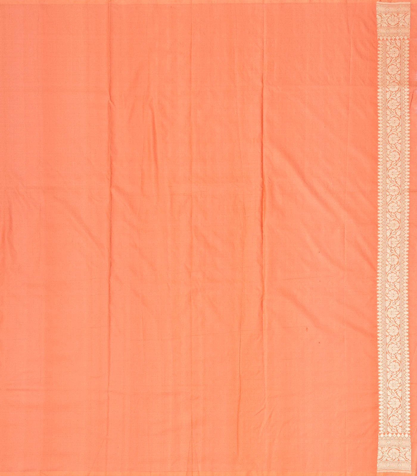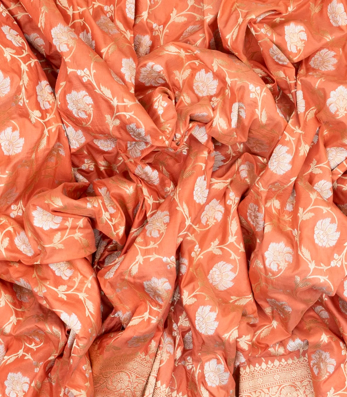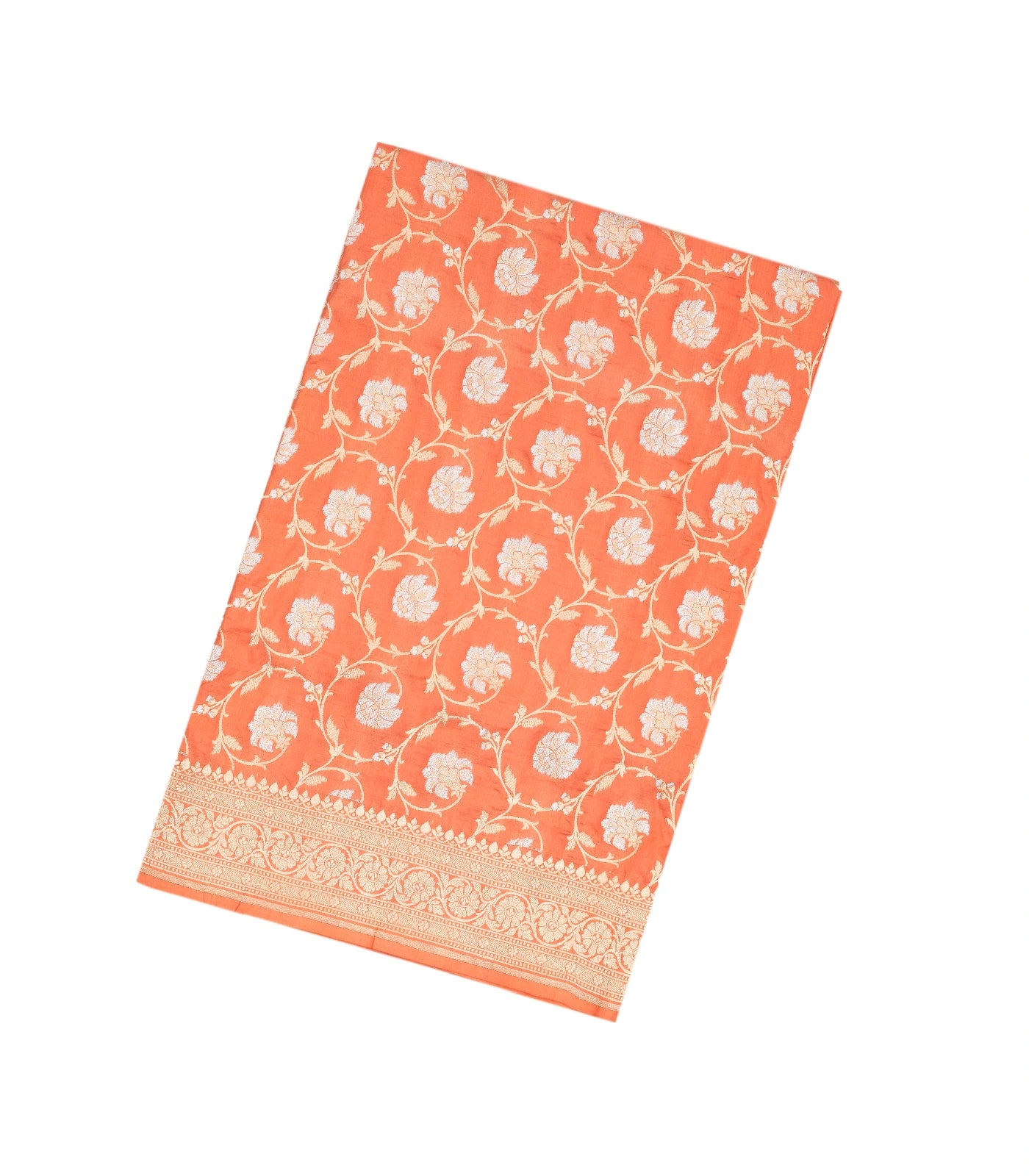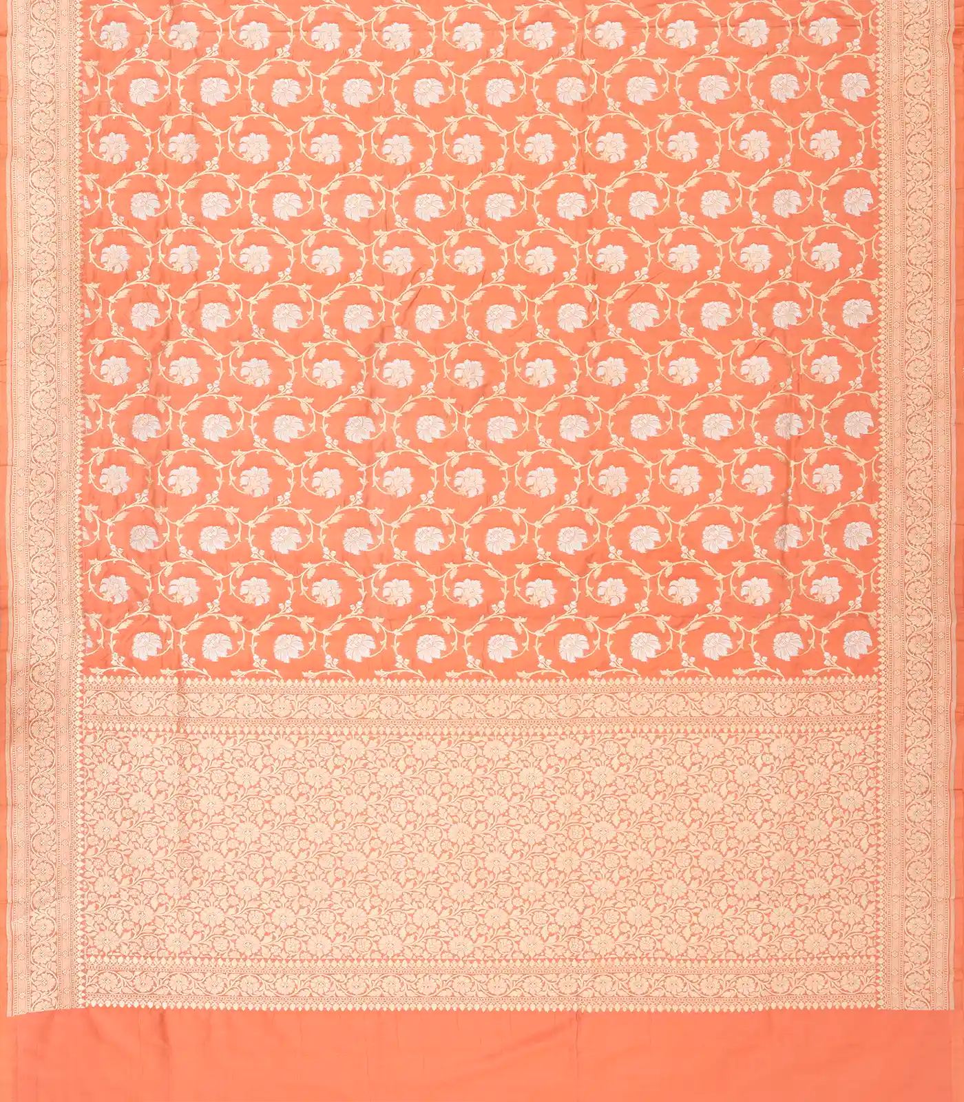 This handwoven banarasi silk saree is filled with floral vine motifs in peach body along with border and pallu