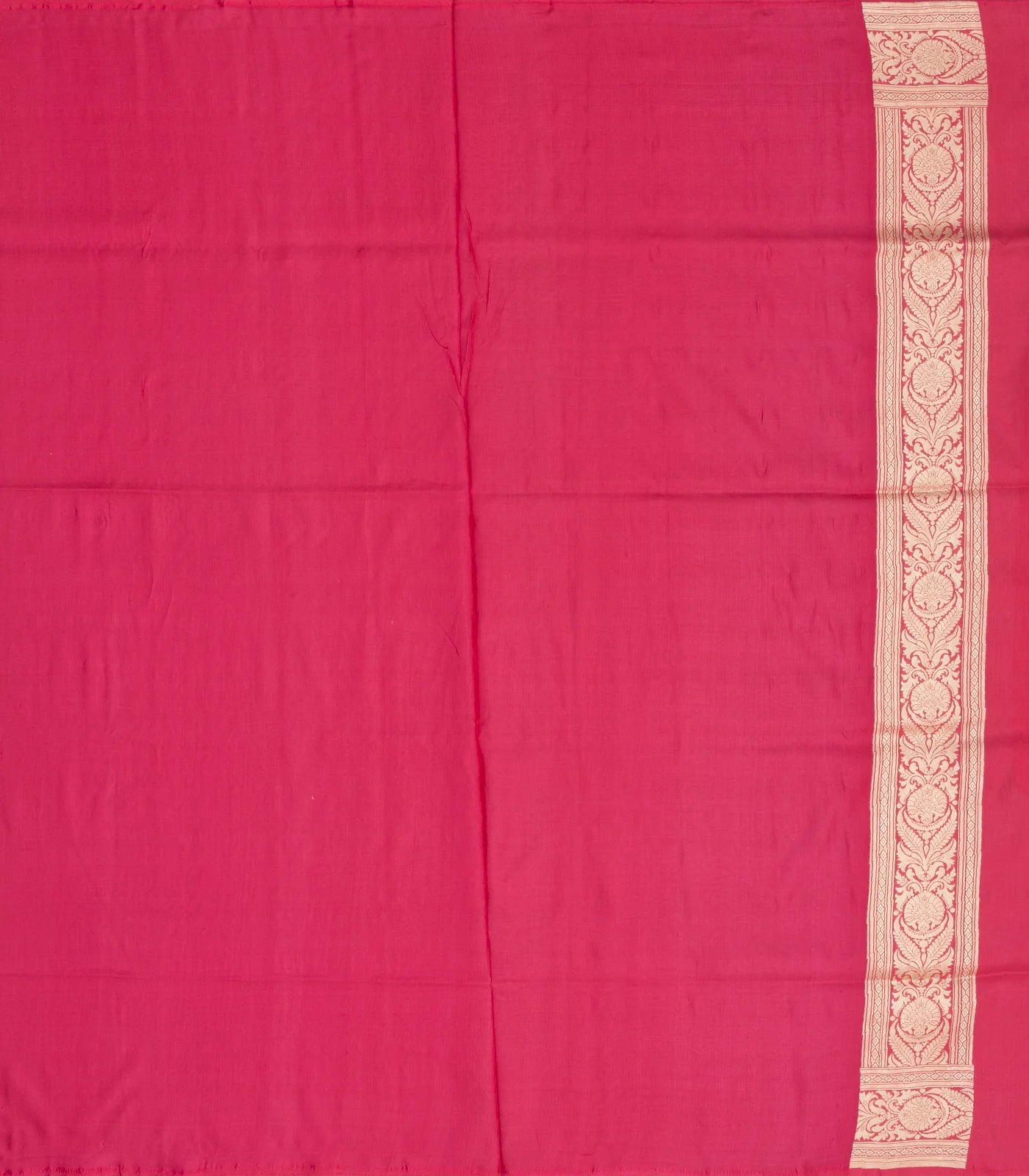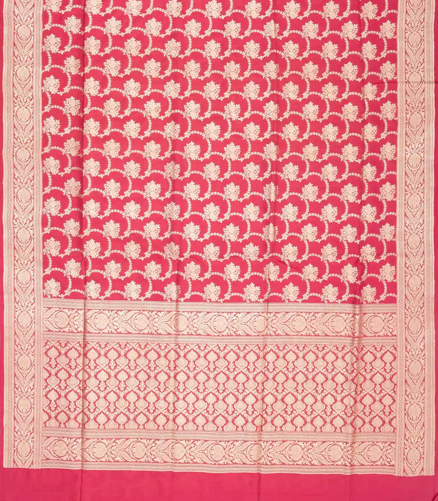 This handwoven banarasi silk saree is filled with floral vine motifs in peach body along with border and pallu