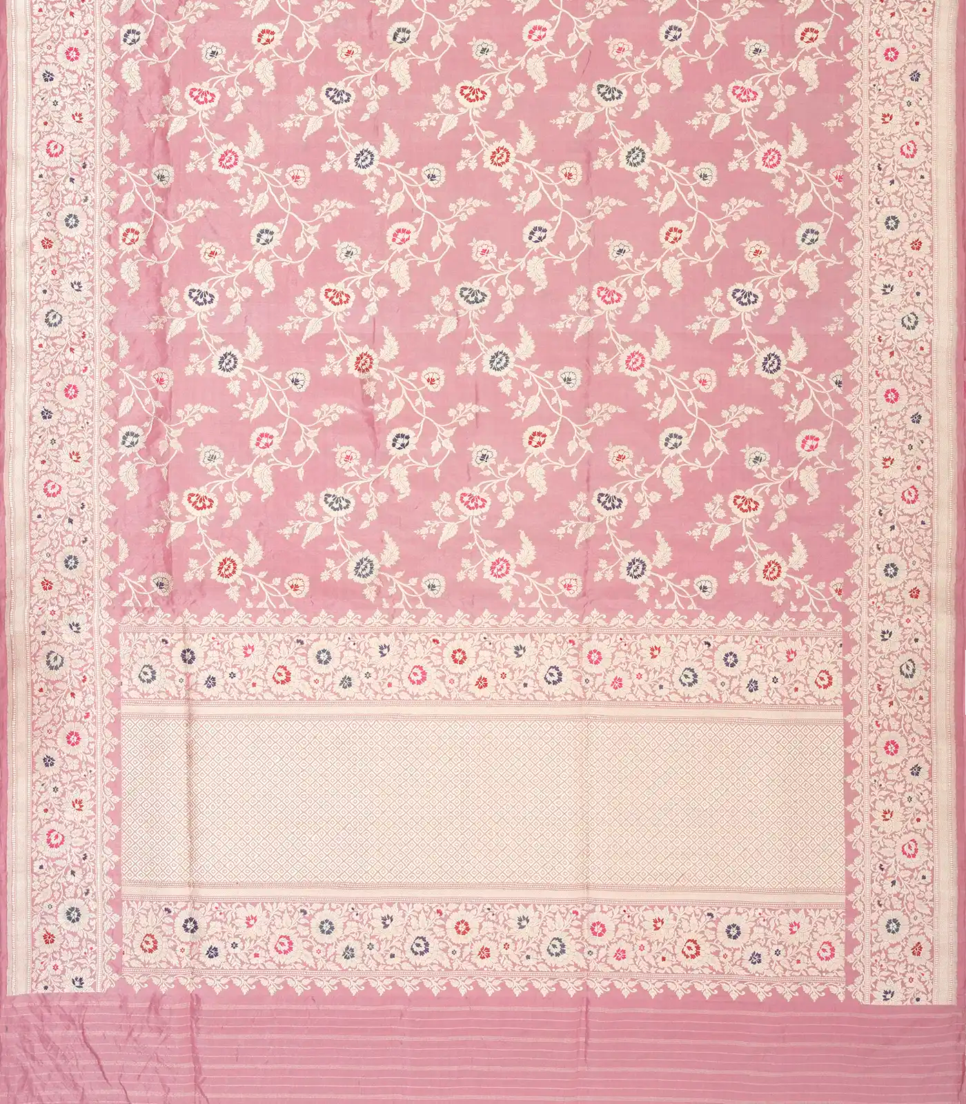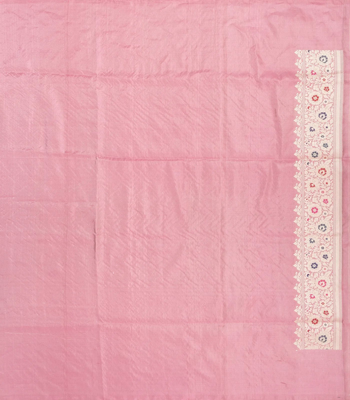 This handwoven banarasi silk saree is filled with meena floral motifs in lavender body along with border and pallu