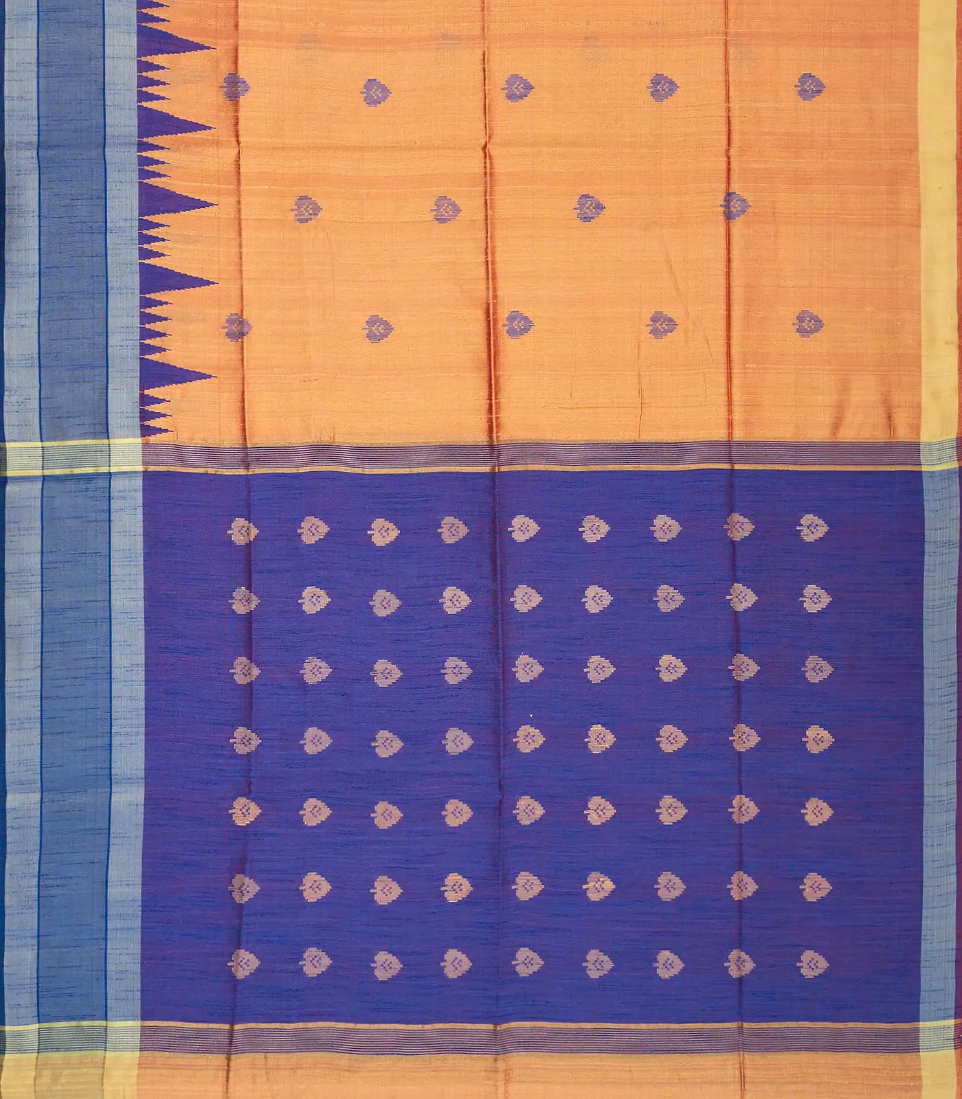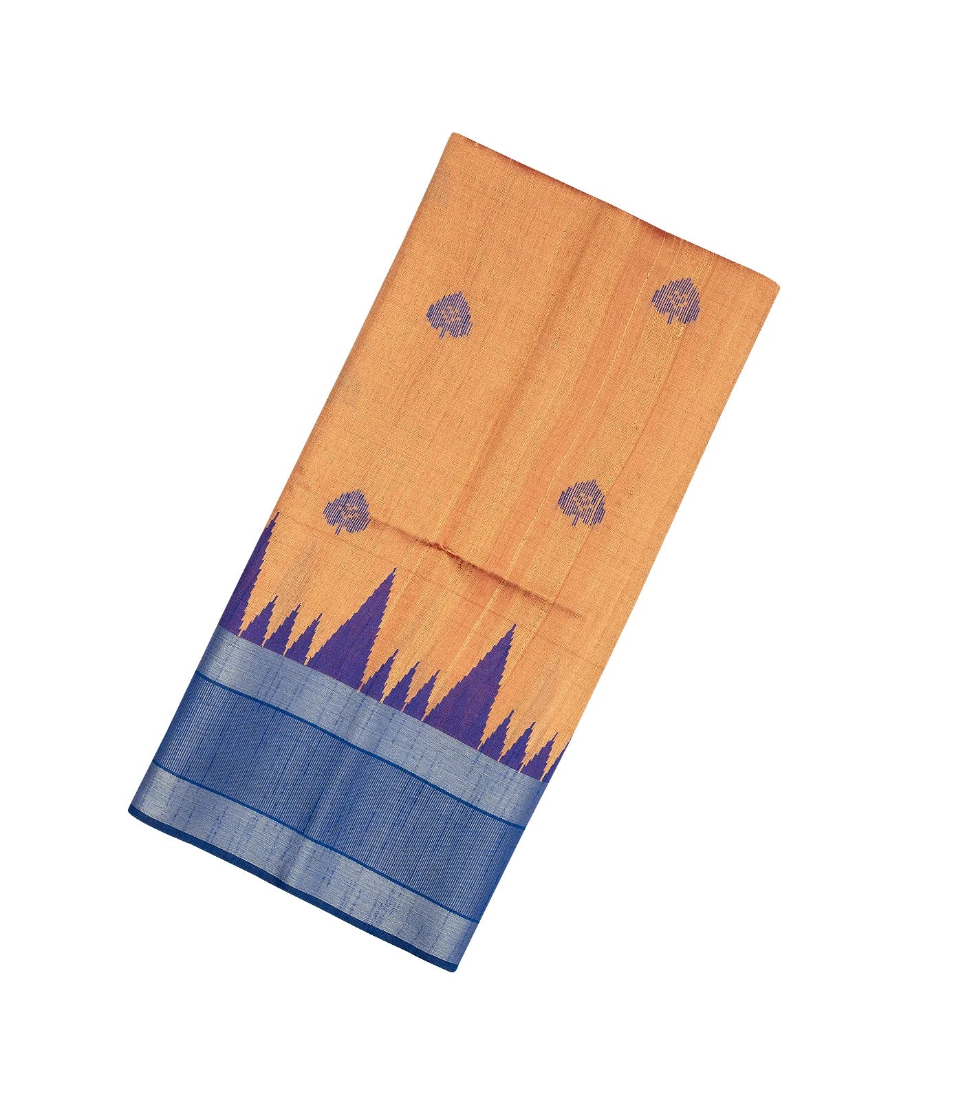 This handwoven dupion silk saree is filled with floral motifs in peach body along with contrast temple border and pallu