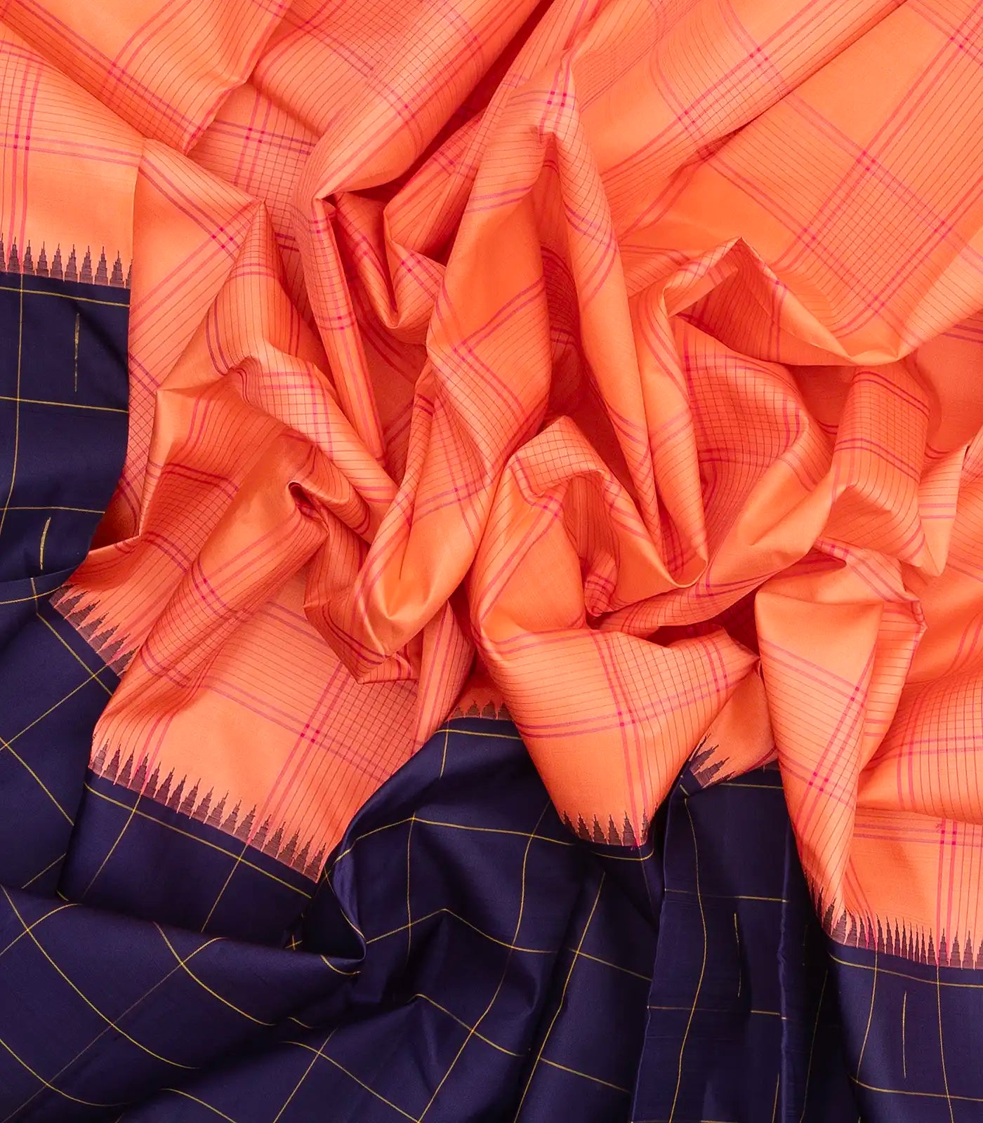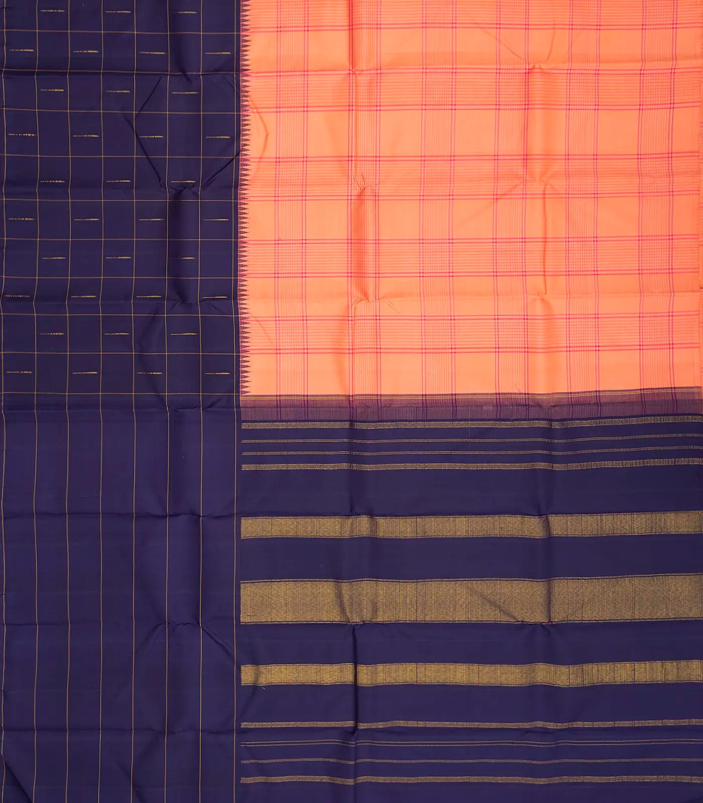 This handwoven kanchipuram silk saree is filled with checks in peach body along with contrast border and pallu